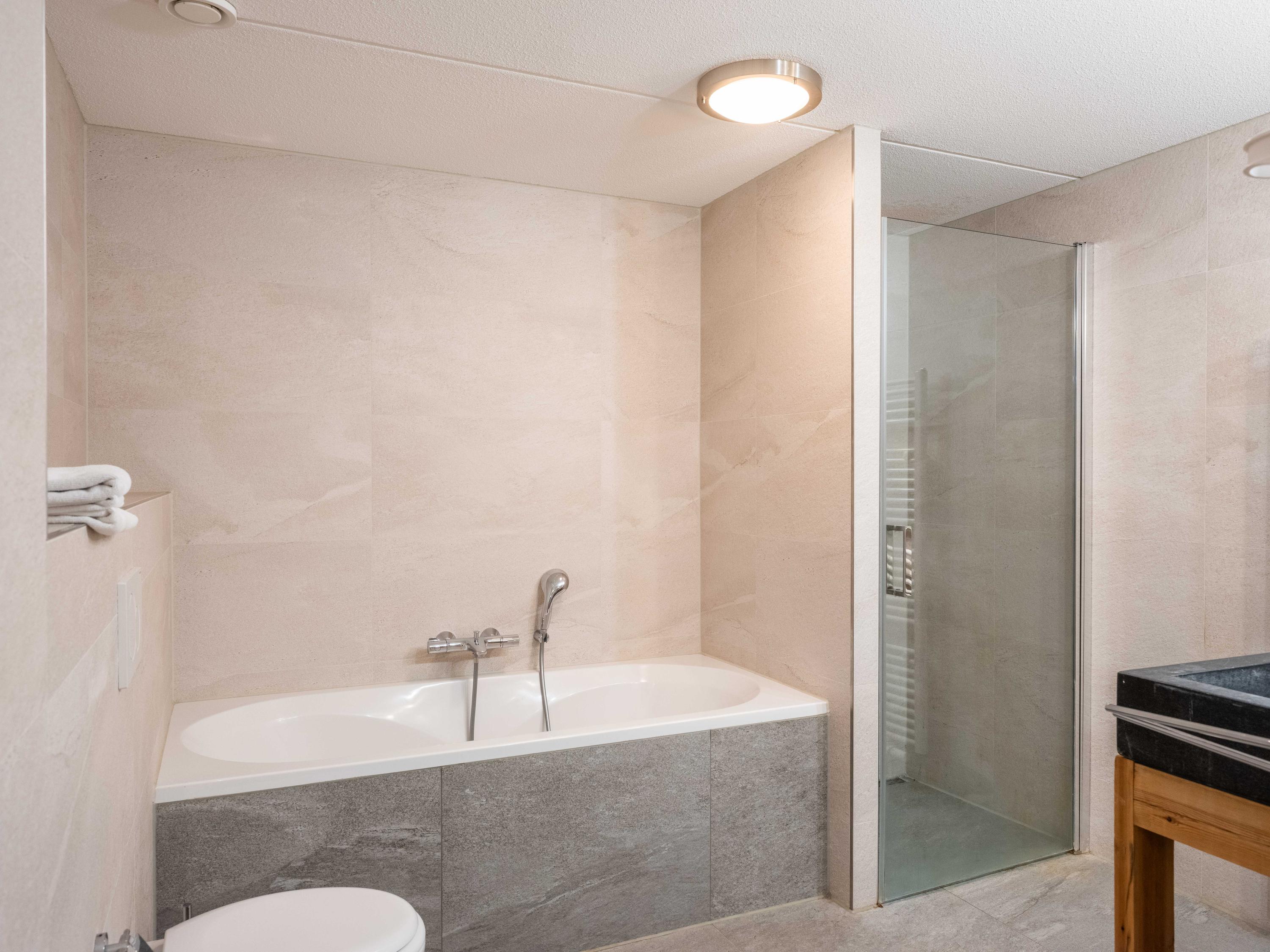 The main living area is spacious and filled with light, featuring an open kitchen, dining space, and a seating area with a gas fireplace. The kitchen includes a four-burner gas stove, dishwasher, combi-microwave, and an extractor hood. Wide doors connect the living room to the private garden and terraces, perfect for relaxing or entertaining. Both the ground floor and basement benefit from underfloor heating and tiled flooring.