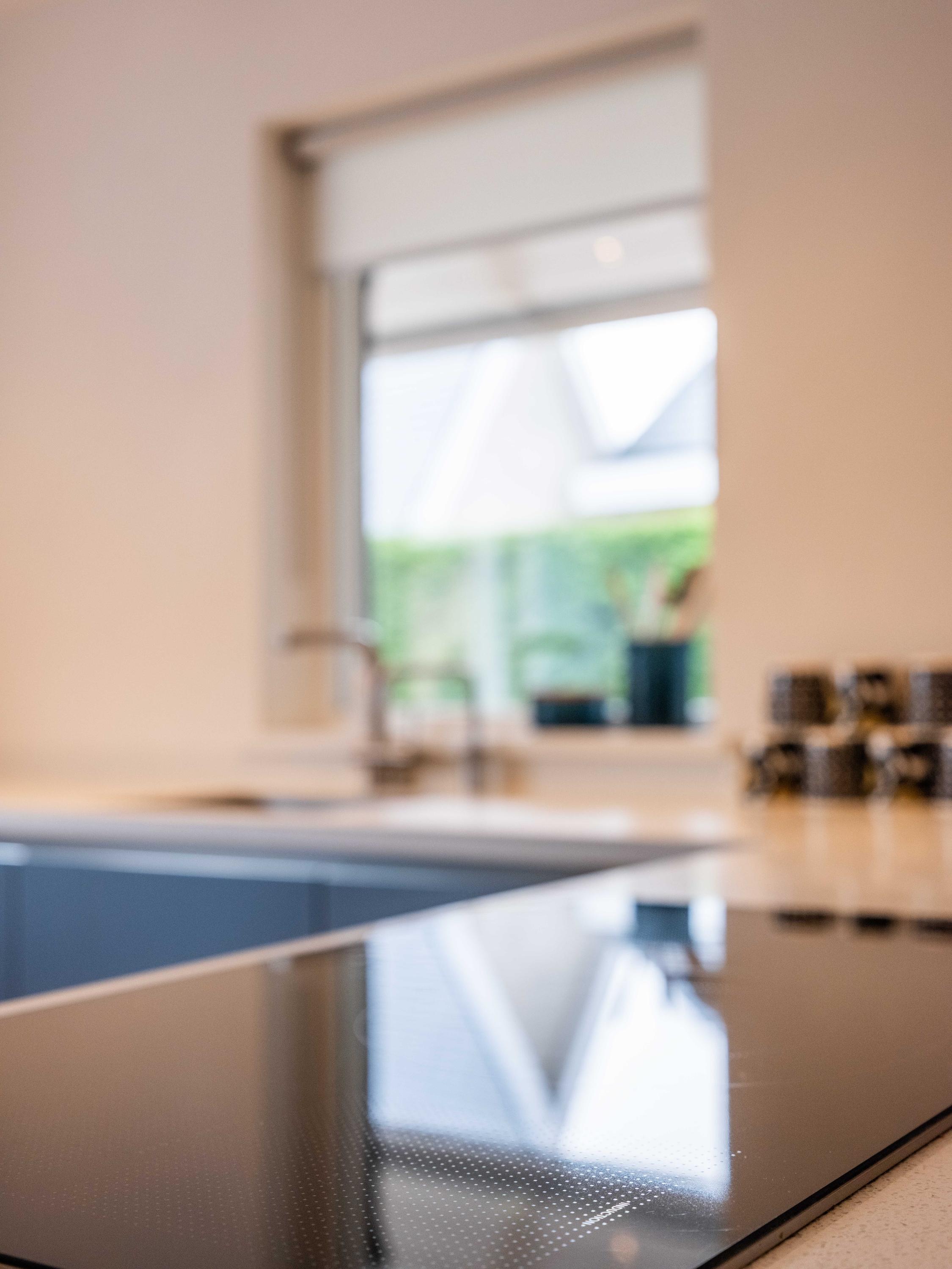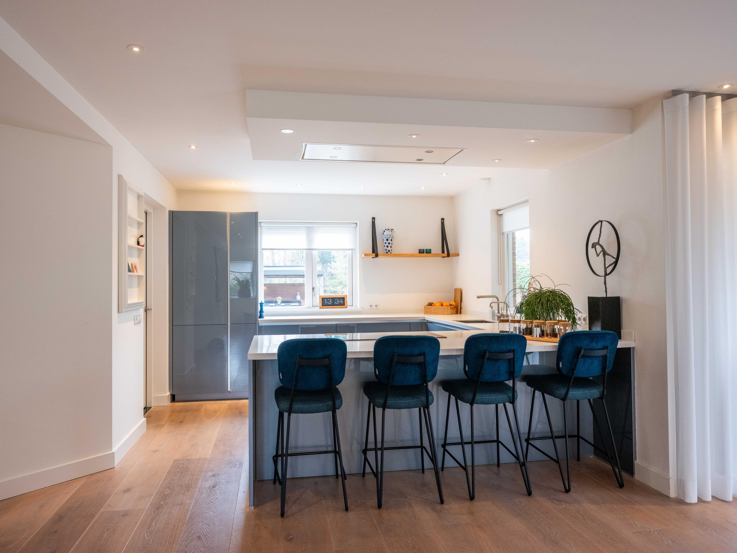 The open kitchen is attractively decorated and equipped with a cosy bar with seating. From the kitchen, you can enjoy a beautiful view of the garden and there is a direct connection to the living room. Thanks to the open layout and abundant light, everything feels spacious, fresh and inviting.