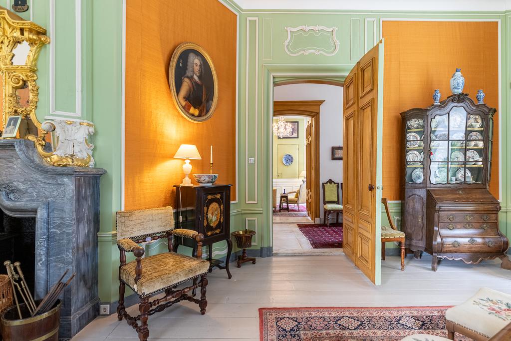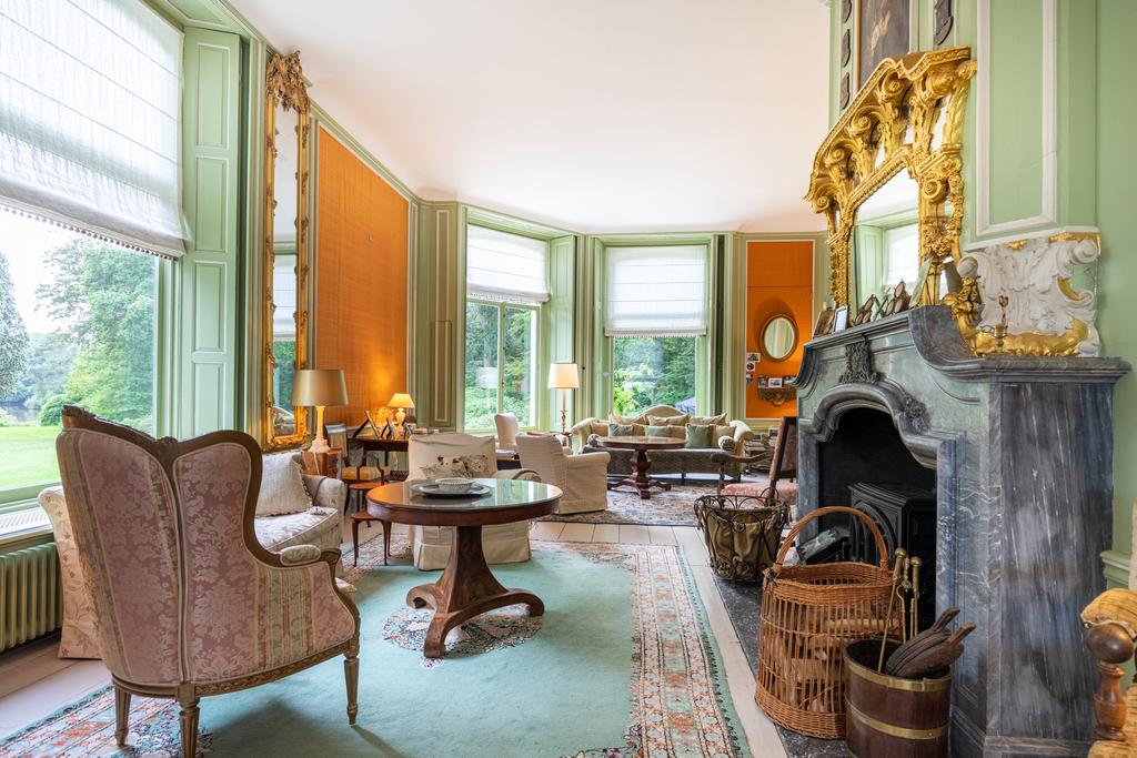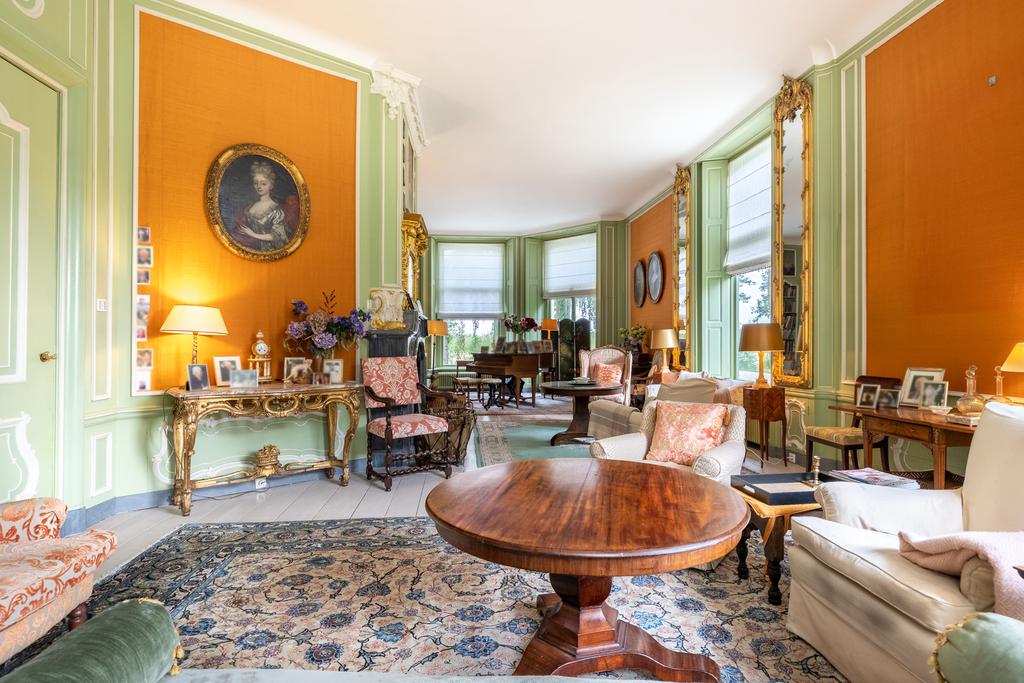 The interior is rich in period details, including ornate fireplaces, damask wall coverings, refined staircases and bespoke finishes.