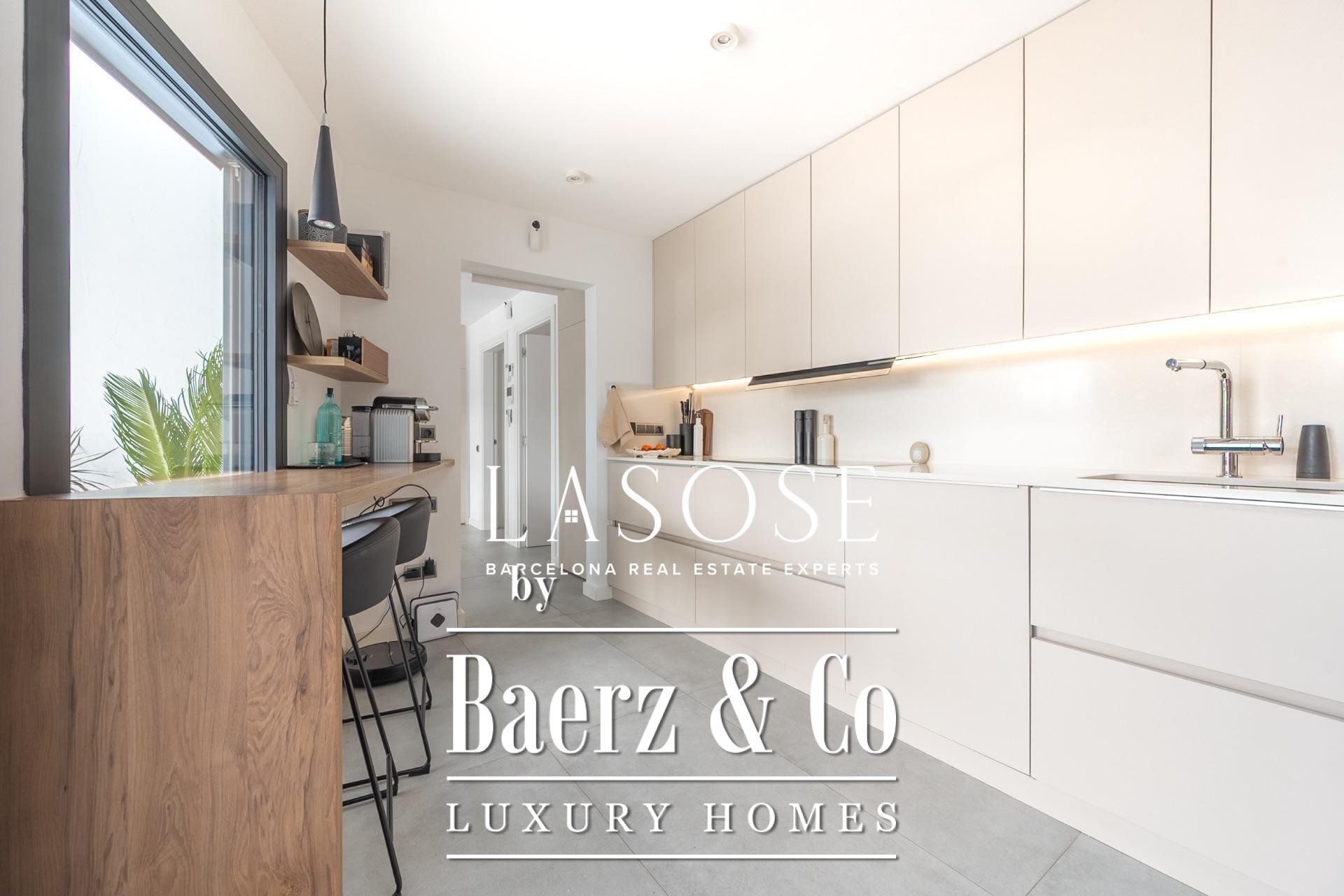 A modern kitchen, finished with premium materials and appliances, connects both to the heart of the home and to an inviting covered dining terrace for effortless alfresco entertaining. The primary suite features a designer bathroom and a spacious dressing area, while the second bedroom offers direct access to a full bath—balancing comfort with elegant privacy. Year-round climate control is ensured by hot and cold air pumps in every room; double-glazed windows and adjustable blinds reinforce thermal and acoustic insulation. Details from lighting to finishes embody timeless restraint.