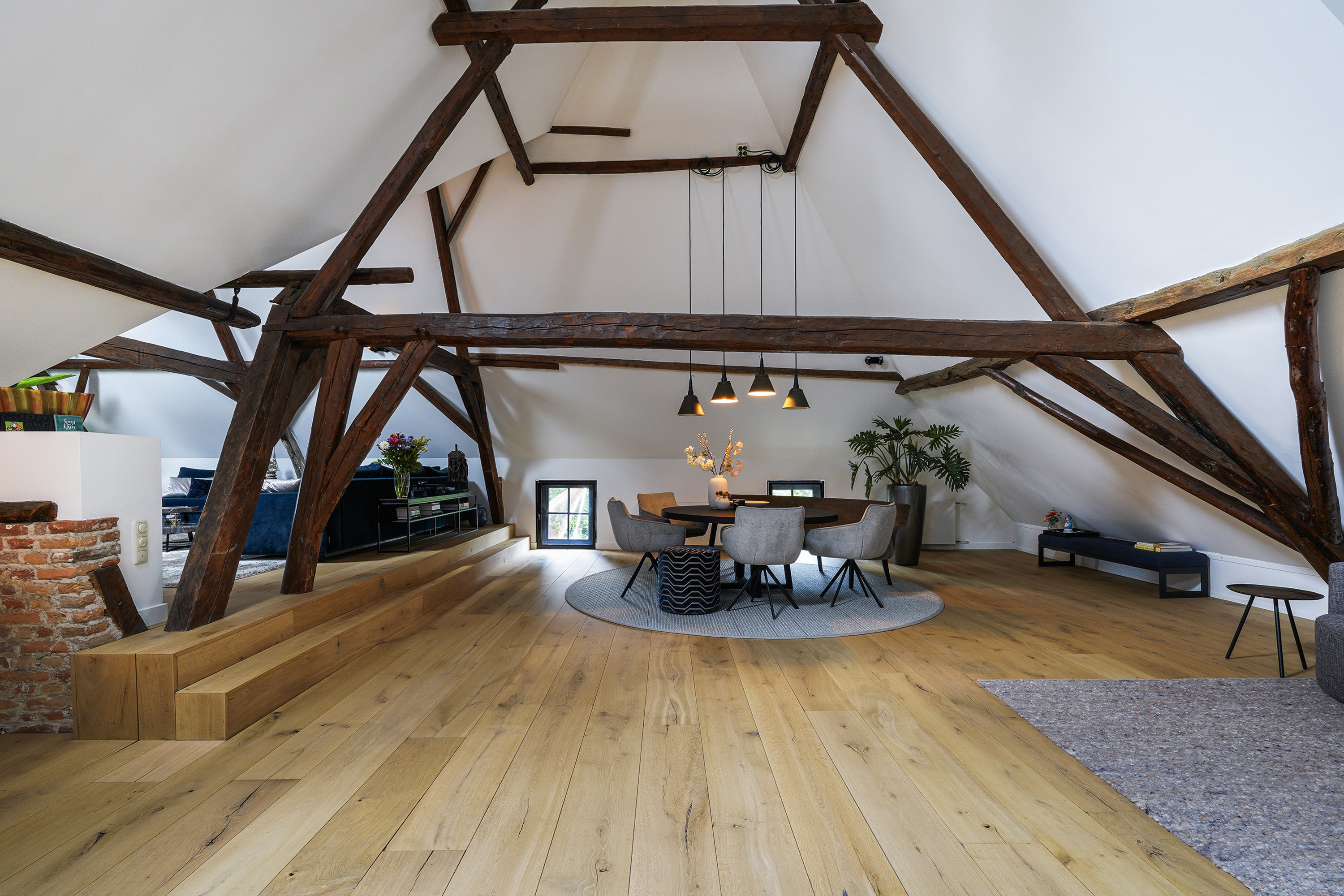 Heritage house Sprang-Capelle embraces history and considered renovation, offering a rare 420 m² living area within a 658 m² plot. This national heritage property is marked by extraordinary provenance, its 17th-century origins woven into exposed wooden beams, vaulted ceilings, and a grand sense of arrival. The main living room of nearly 90 m² is anchored by a pellet stove and illuminated by tall windows, with volumes softened by white plaster and timber floors. The heart of the home is a bespoke kitchen crafted in 2024, featuring custom cabinetry by Ecker Interieurbouw and generous space for dining, gathering, and quiet observation of the garden.