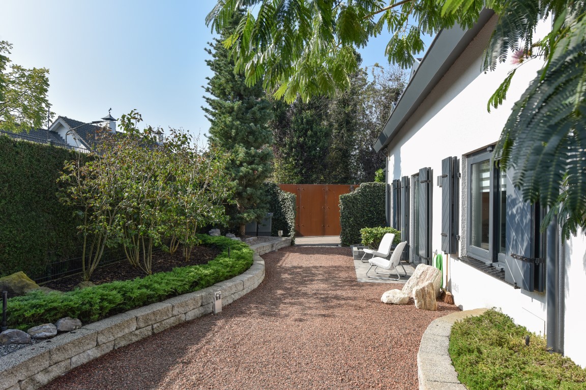 De living is comfortabel ruim en licht van opzet, beschikt over een Cinewall en een 3-tal schuifpuien richting de tuin rondom. Vanuit de eethoek loopt de sfeer vloeiend over richting de open woonkeuken met alle luxe van dien. Denk aan een royaal granieten werkblad, hoogwaardige inbouwapparatuur, granieten vloeren, inbouwverlichting en bovenal een zeer neutrale kleurstelling.