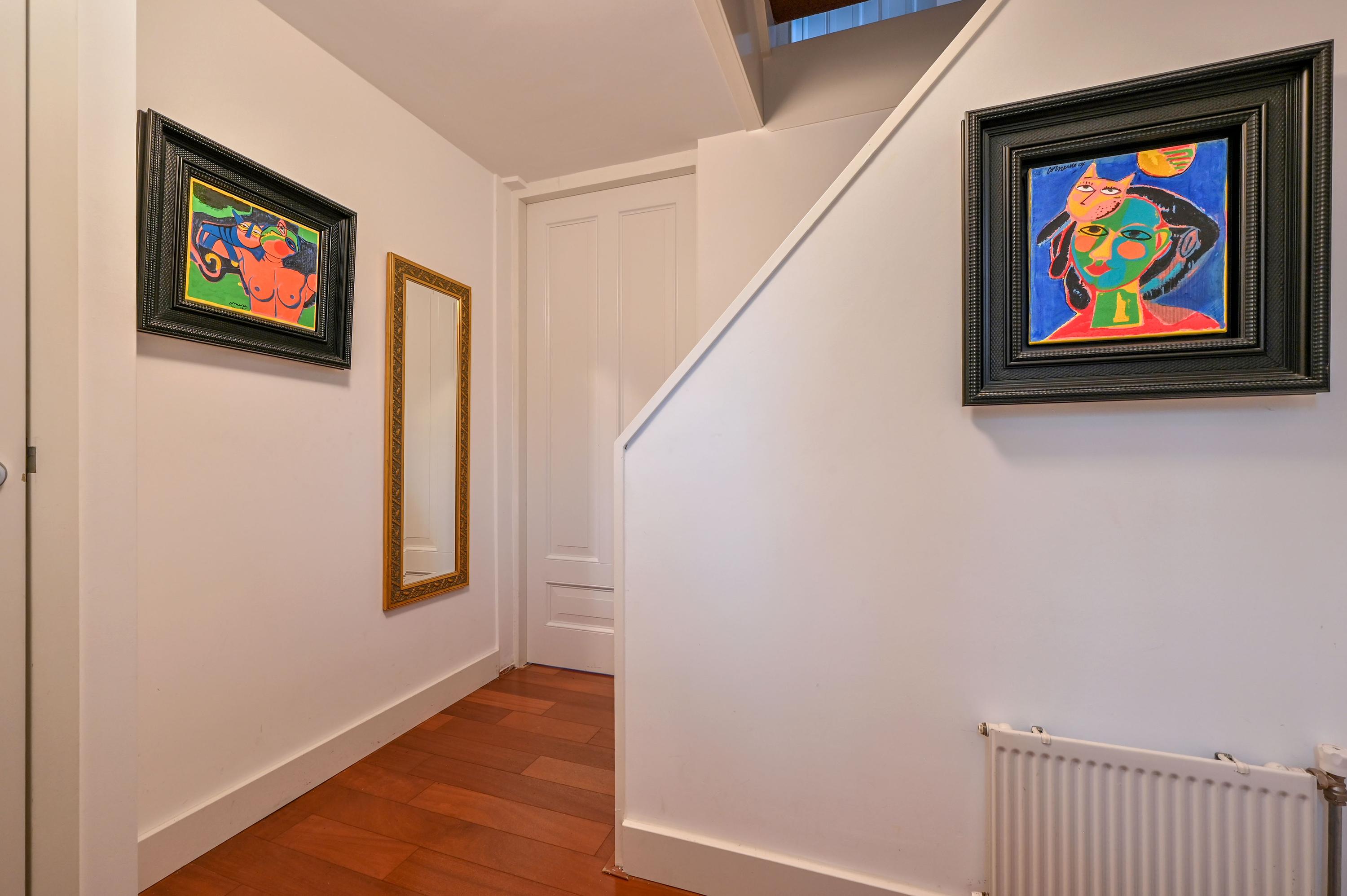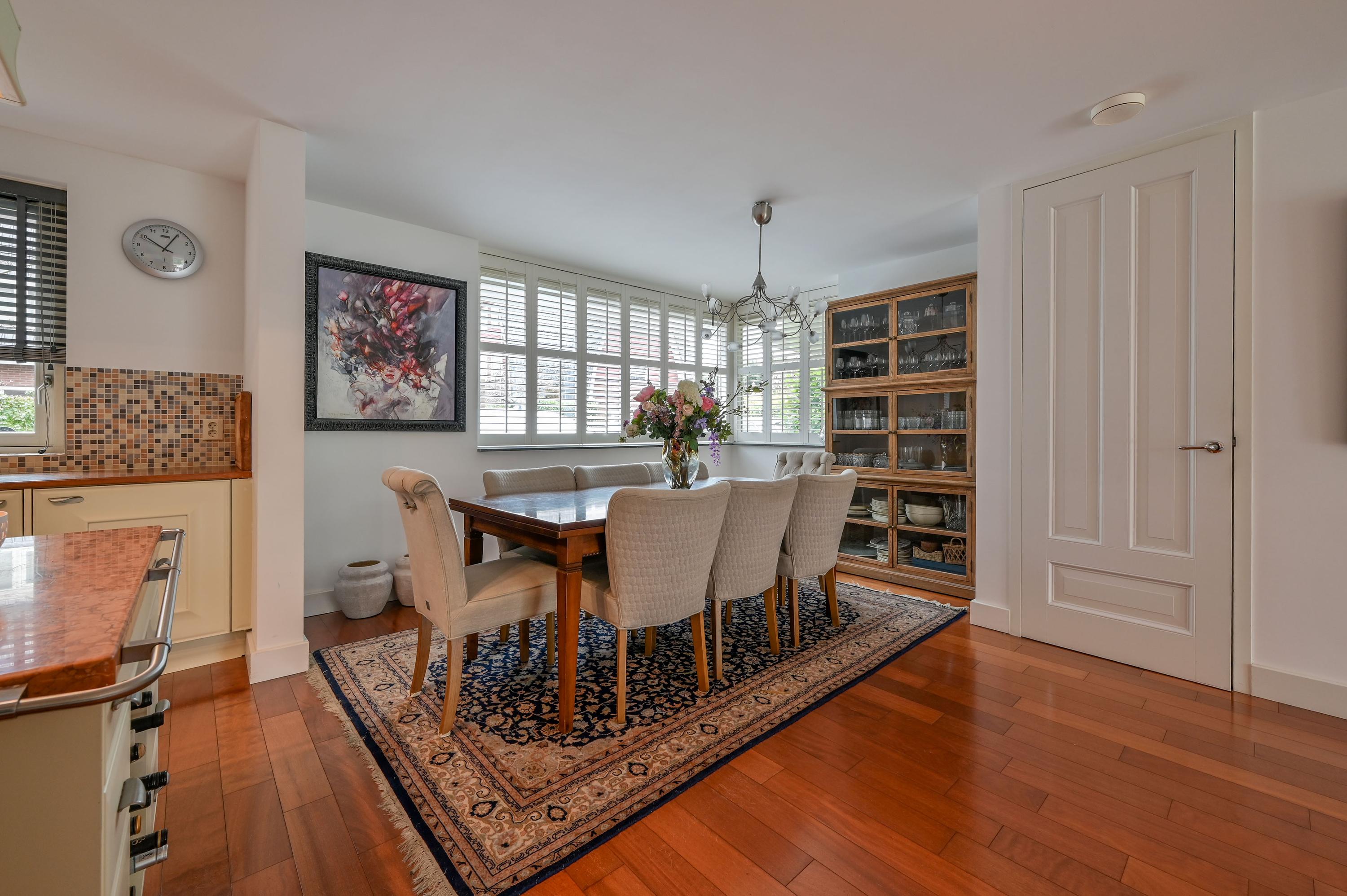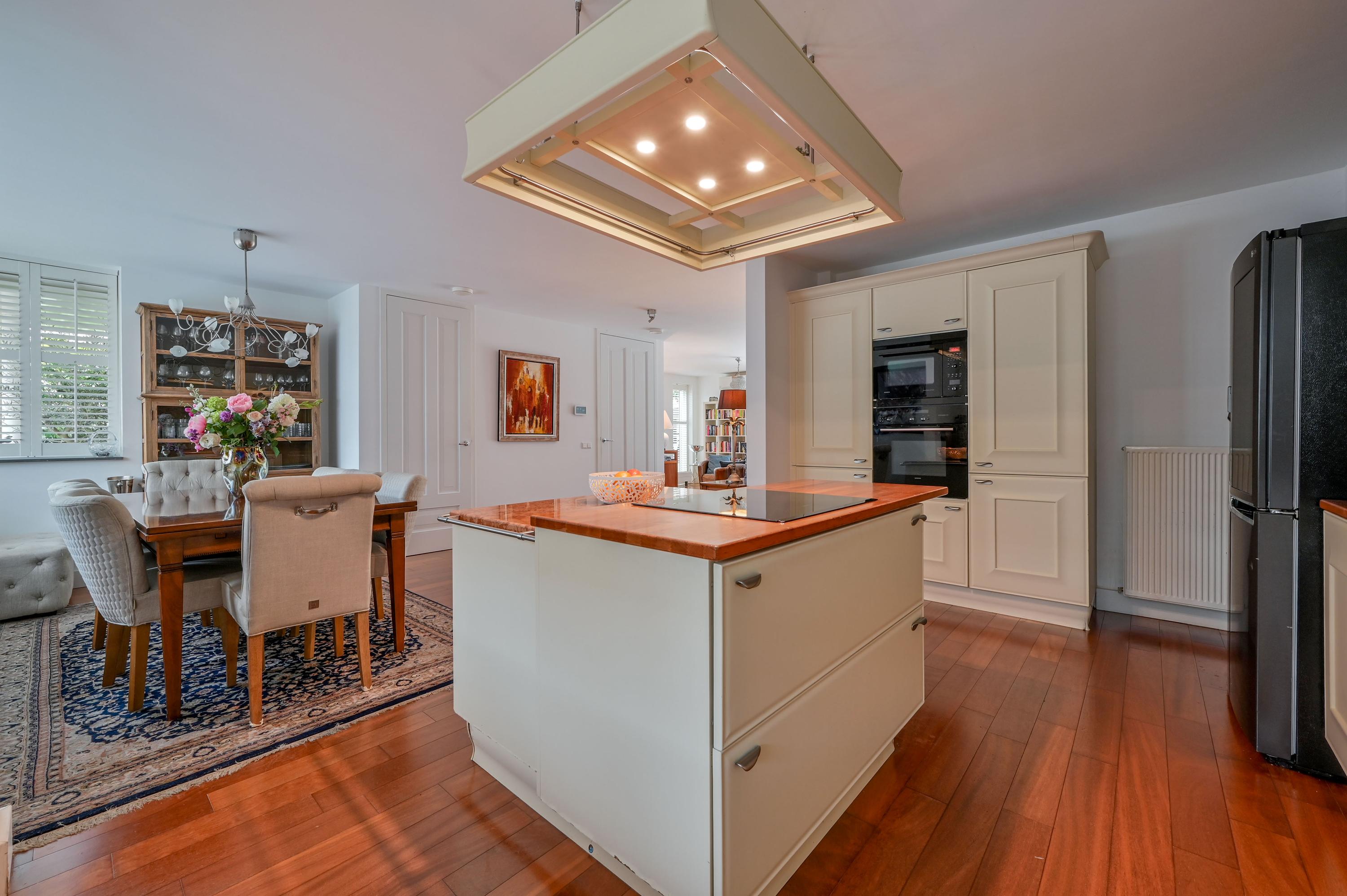 The kitchen at the front is bright and spacious, with large windows and a corner window at the dining area fitted with charming shutters – an ideal spot for cozy meals. The country-style kitchen features a central island with an induction hob and practical drawers on both sides, complemented by an elegant wine rack. The L-shaped countertop provides ample space and is equipped with luxury built-in appliances, including a grill plate, fryer with extractor hood, and built-in food processor. At the window side, there is the sink area with a double sink, Quooker, and dishwasher. A large cabinet wall with a combination microwave, additional oven on the other side of the kitchen, and space for a large double fridge/freezer with ice machine (available for takeover) completes the setup. Under the stairs, there is also a convenient cupboard for coats and extra storage.