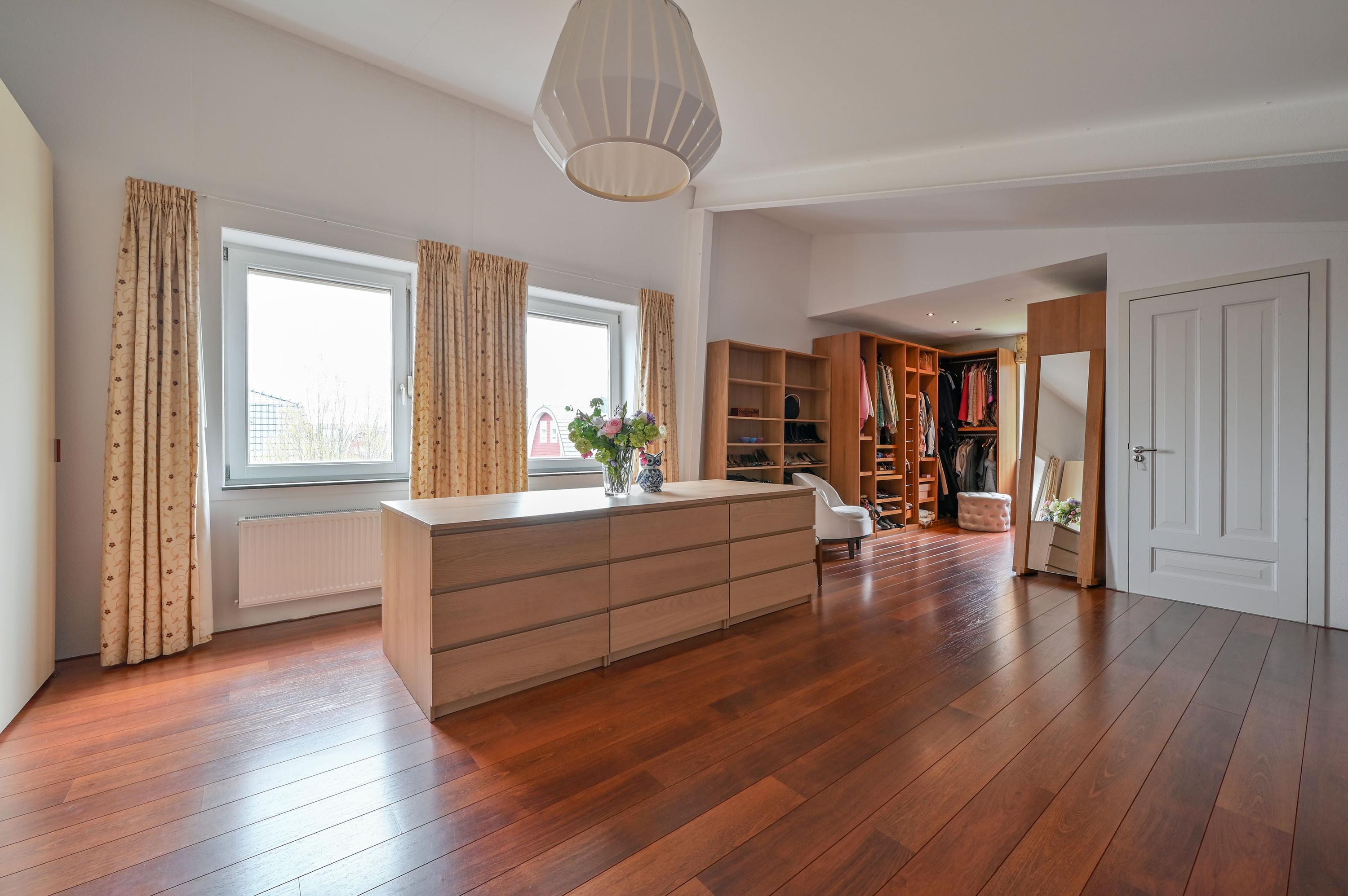 Via an open staircase, you reach the second floor, where the master suite is a true showstopper. This spacious room offers plenty of options for a luxurious and practical layout. The room features an open walk-in closet with a window overlooking the side garden, and a built-in wardrobe – both from the Italian brand Poliform – ensuring stylish and efficient storage. Two front windows and the side window provide ample natural light and are fitted with sunscreens. Laminate flooring and air conditioning complete the space. Due to its generous size, this floor also offers potential to add two attic rooms. Additionally, there is a spacious storage room with central heating and mechanical ventilation unit, ideal for extra storage and practical facilities.