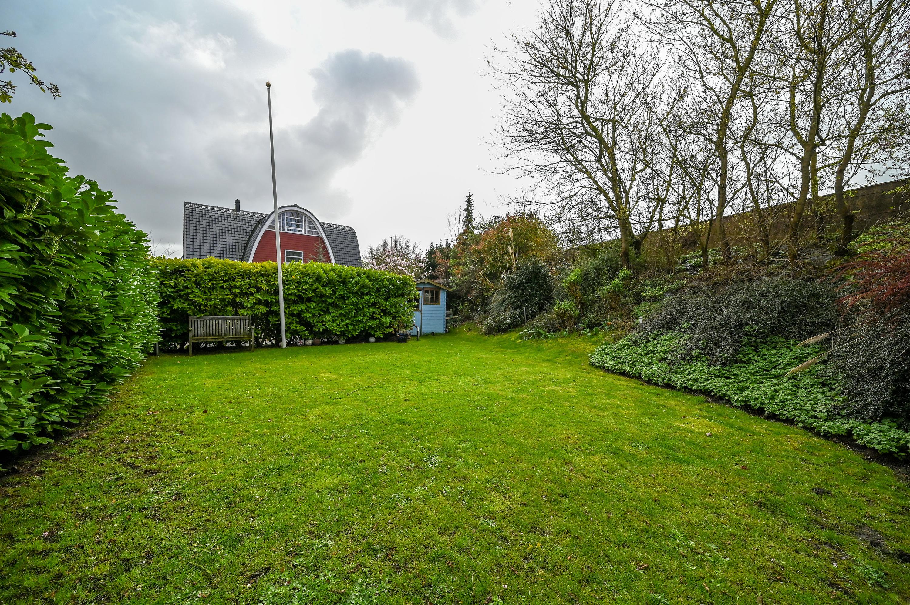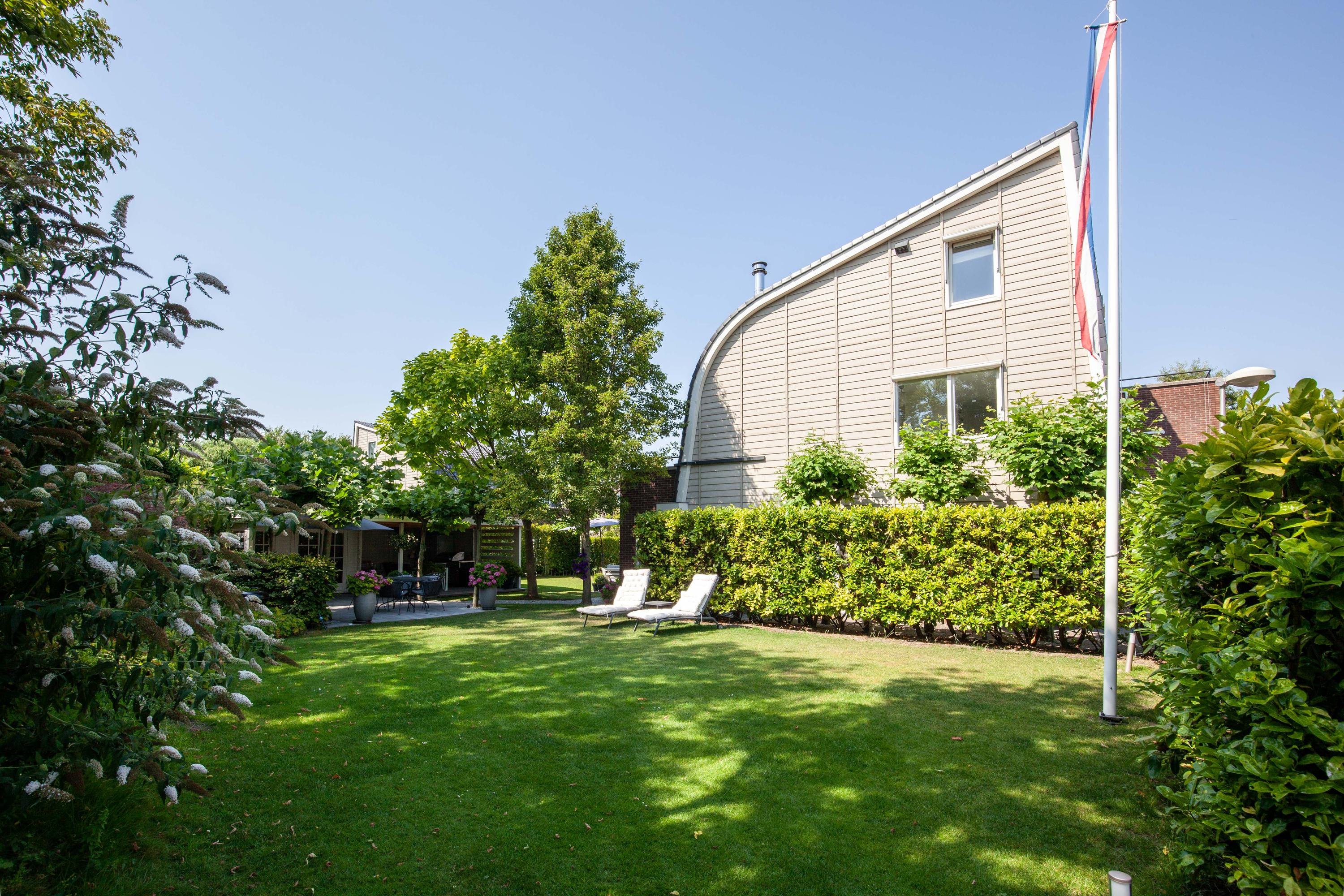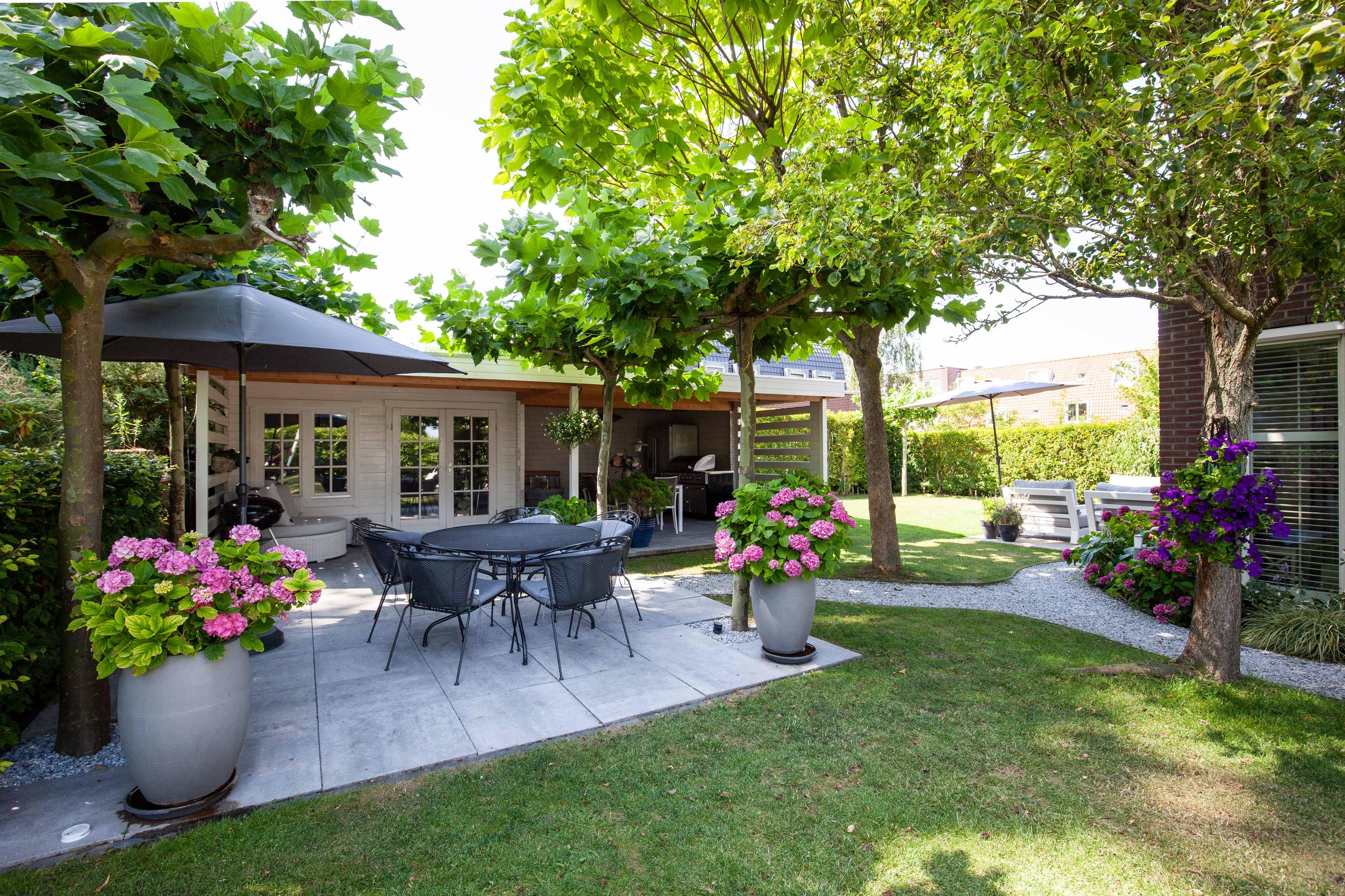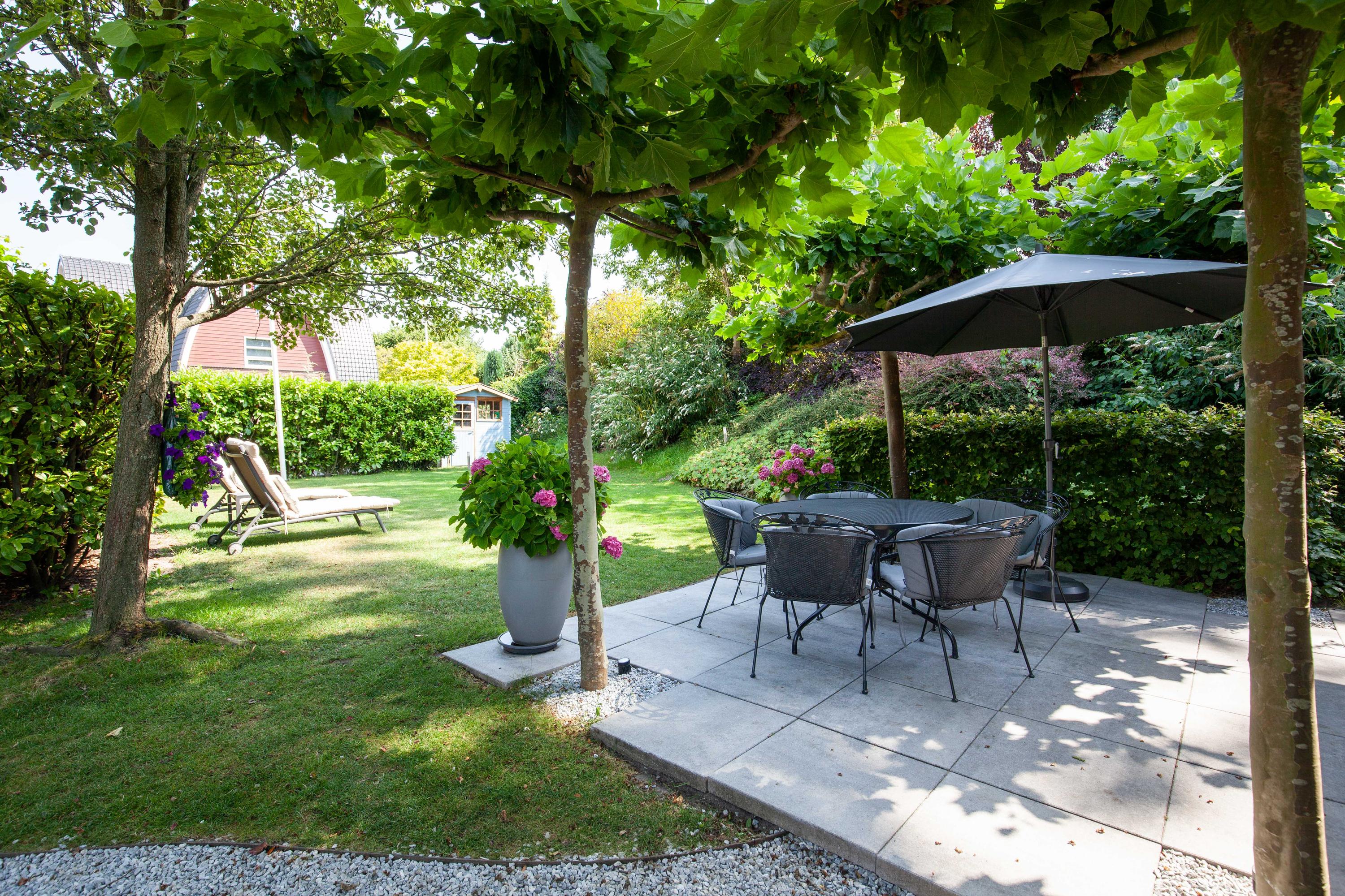 The beautiful garden is a true outdoor paradise, directly accessible via the sliding doors in the living room and via the side of the house through a charming open gate. The garden offers plenty of privacy and enjoys sunlight throughout the day, perfect for enjoying the outdoors. At the rear, there is a spacious terrace with a cozy seating area, complete with an awning spanning the full width of the house, ideal for both sun and shade. At the back of the garden stands a charming garden house with a covered area, perfect for a dining area with barbecue. The garden house features a neat wooden floor, electricity, and water, making it perfect as a workspace, hobby room, or for storage. Adjacent to the covered area is an additional terrace with seating, sheltered by a natural canopy of four beautiful plane trees, creating an idyllic spot to relax or entertain guests.