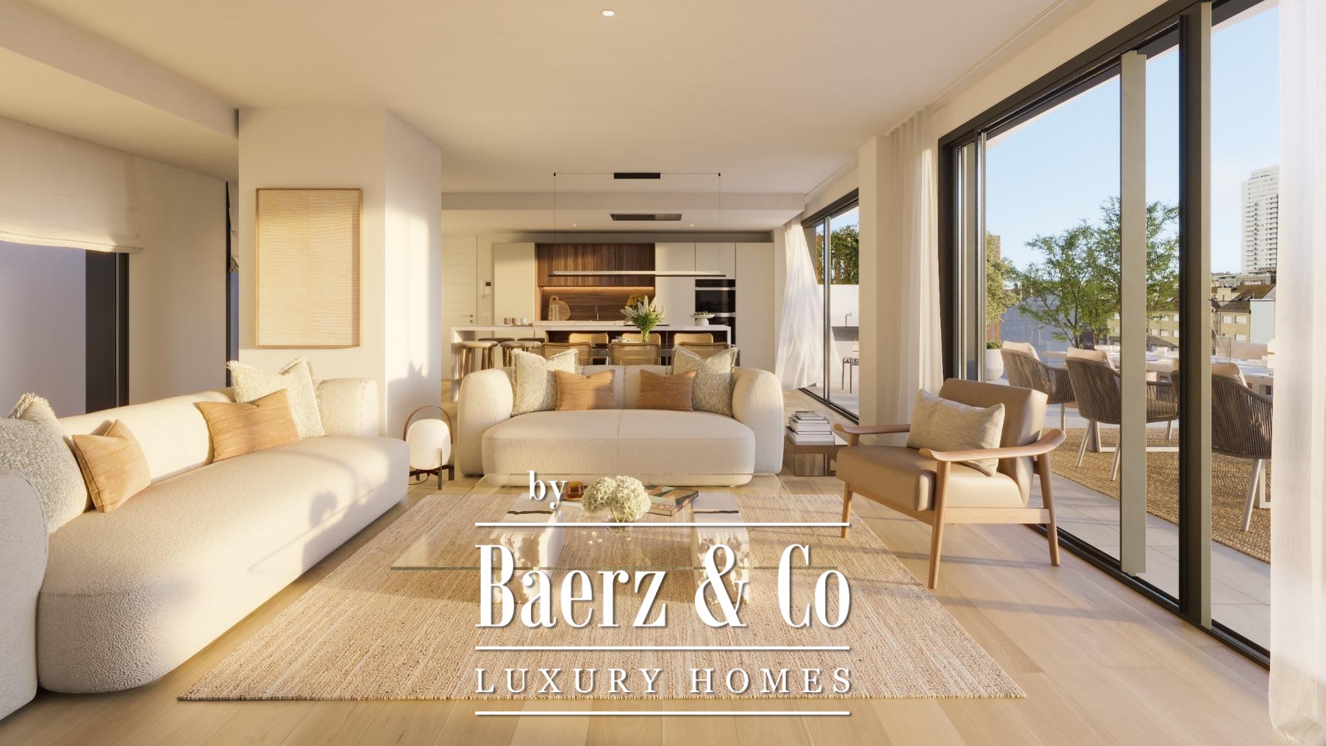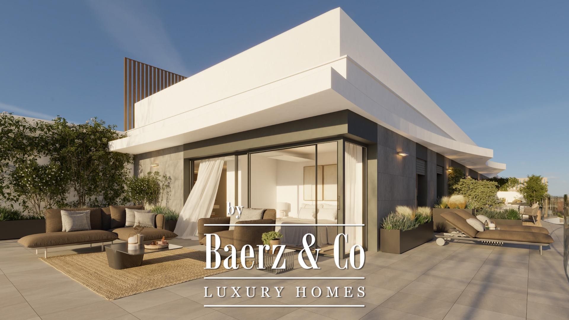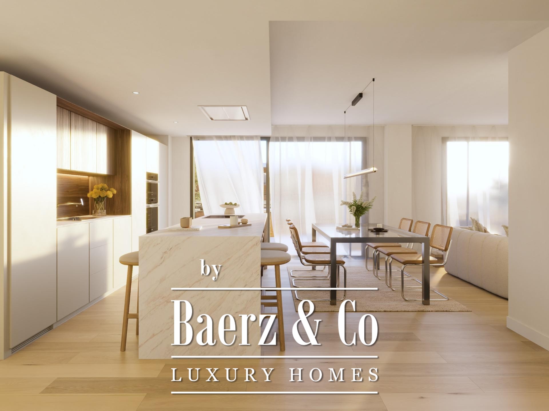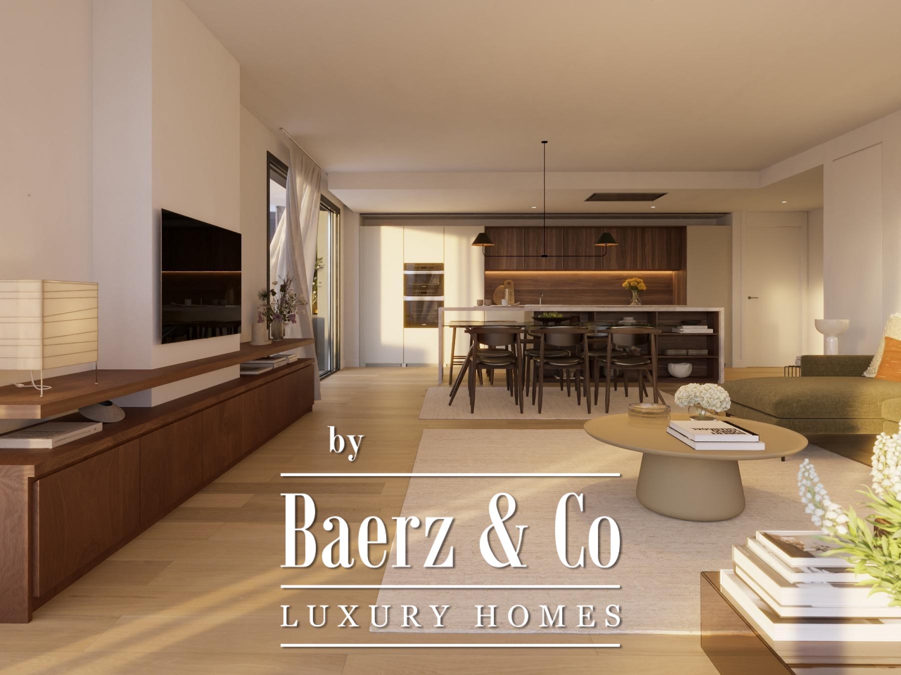 Three bedrooms and two bathrooms are composed with refined materiality, from Porcelanosa coverings to the underfloor heating ensuring year-round comfort. The high-end Santos kitchen integrates appliances discreetly, complementing the consistent quality found throughout. Amenities include a private garage, storage, a gym, adult and children’s saltwater pools, and a social club, supported by a concierge. The BREEAM certification affirms the development’s commitment to sustainability and construction excellence.