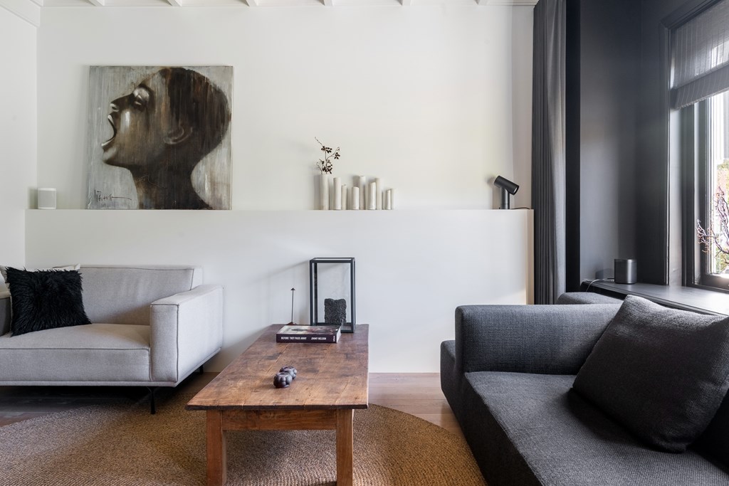 You enter the house through the entrance and hallway, both featuring authentic terrazzo floors. From here, you access the toilet, staircase, and the spacious living room. Large windows allow plenty of natural light to flow in. The stylish gas fireplace is a true eye-catcher and adds a luxurious, cozy atmosphere.