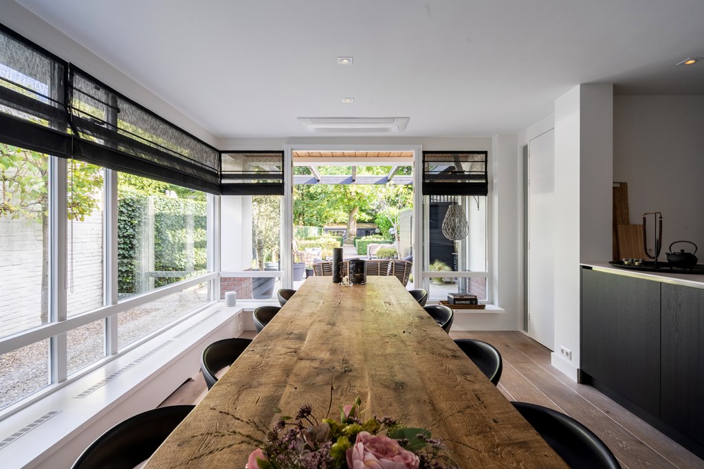 At the rear is the generous dining area, equipped with air conditioning and direct access to the modern kitchen. The kitchen is fitted with high-quality built-in appliances, including a Miele steam oven and second oven, an induction cooktop, a Quooker tap, and a spacious Liebherr refrigerator.