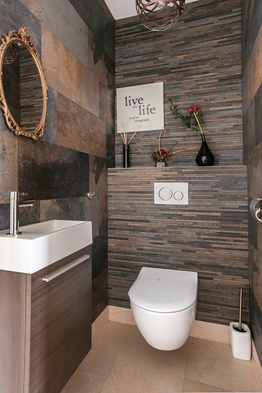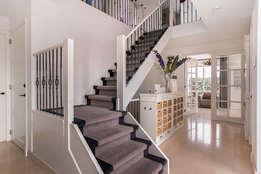 Enter via a hall highlighted by an impressive staircase—an elegant, open structure that leads to both upper floors and the basement. The hall also provides access to the tiled WC with washbasin, the utility room, and the living room.