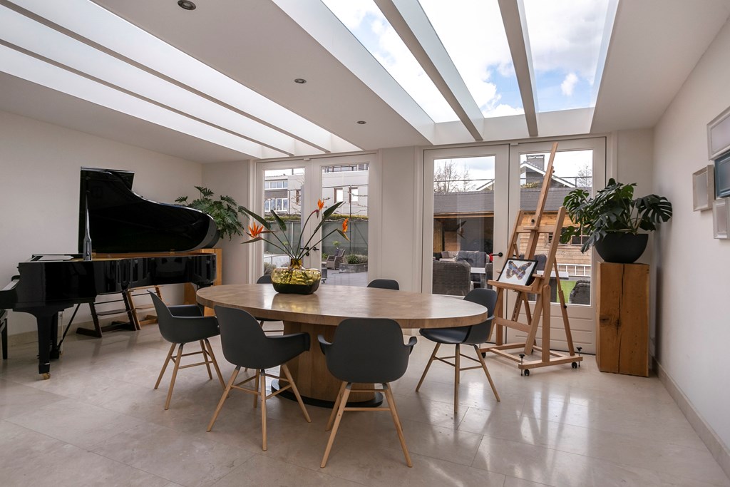 Double doors open to the extended, garden-facing living room, bathed in light from multiple windows, two pairs of French doors, and a generous roof light. The extended section creates a conservatory-like feel with delightful views over the landscaped rear garden. There’s ample space for a large seating area to gather and relax.
