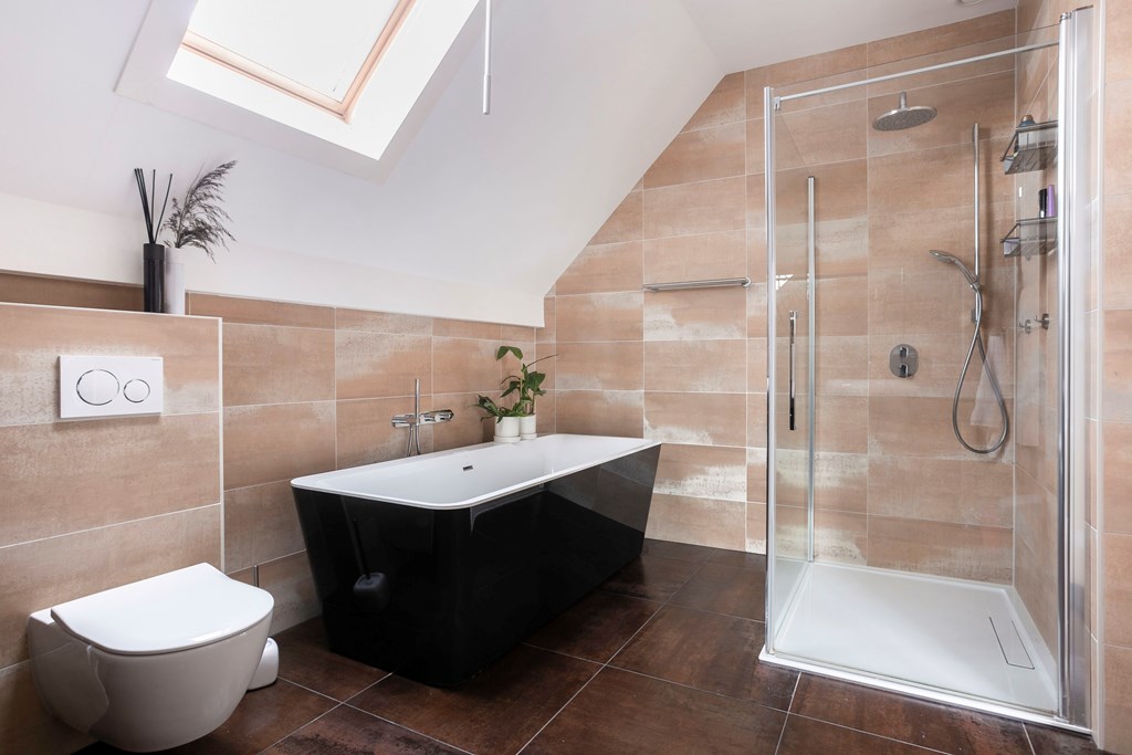 A roomy landing leads to the primary suite with en-suite bathroom at the front. Here, double doors open onto a lovely south-west facing balcony—perfect for fresh air and afternoon sun. The tiled en-suite includes a freestanding bathtub, double vanity, walk-in shower, toilet, and a roof window for daylight and ventilation.