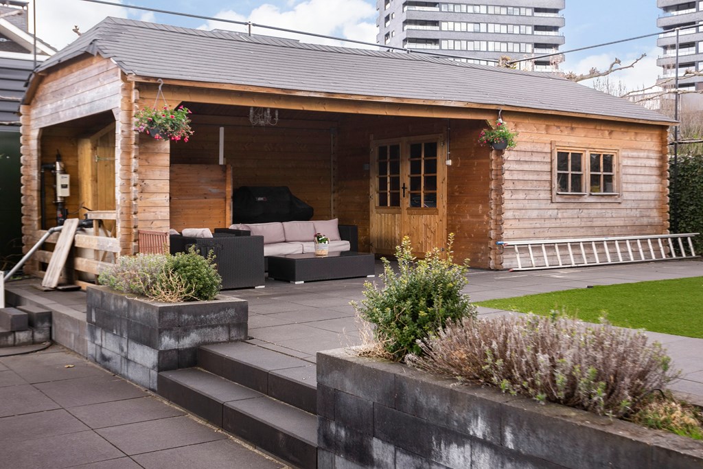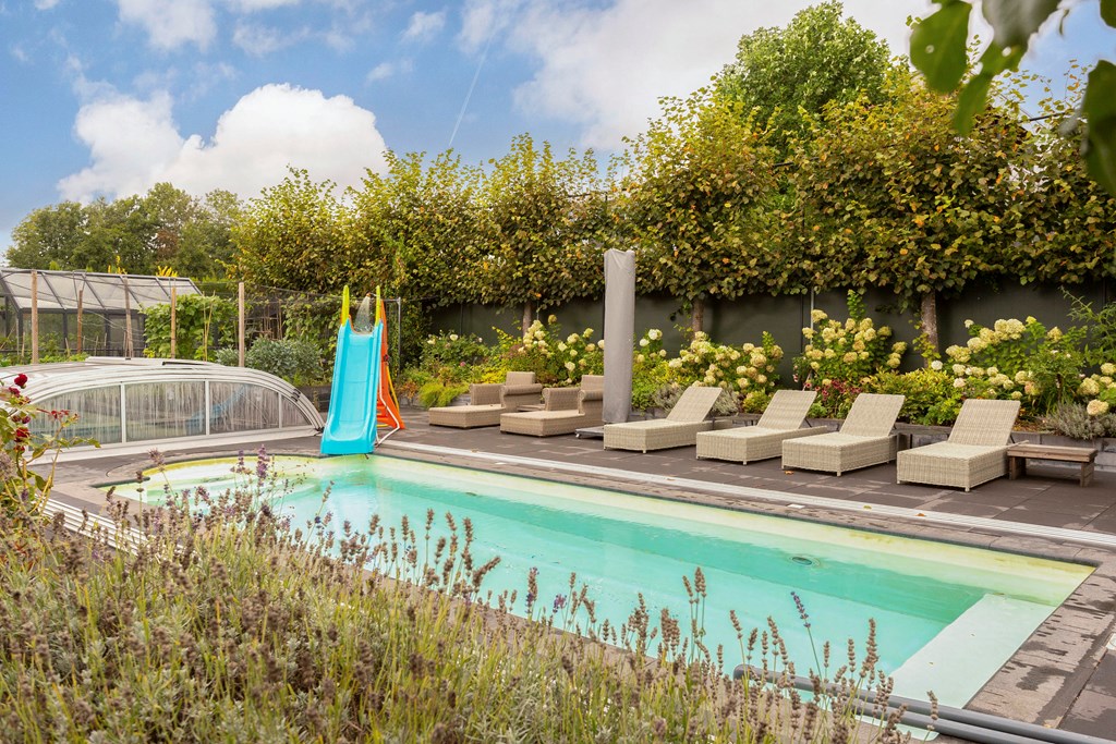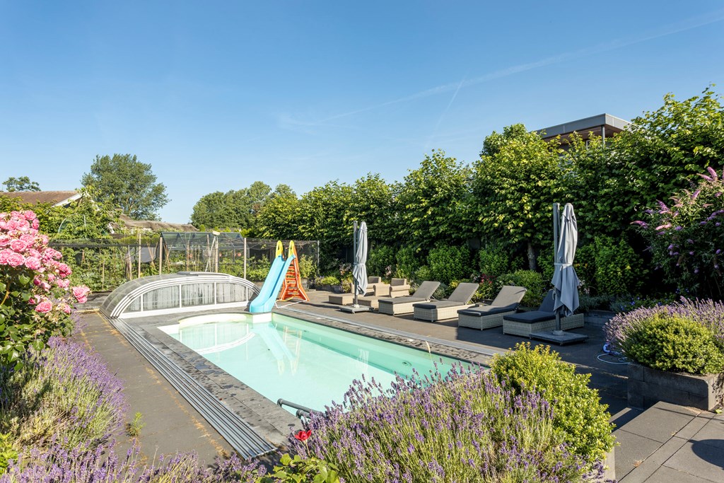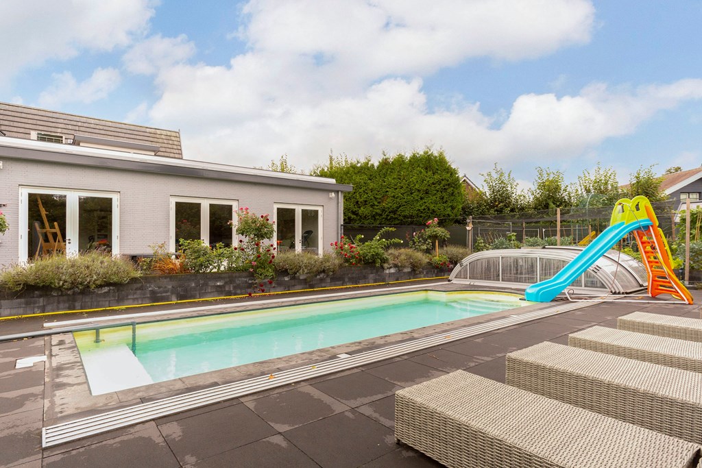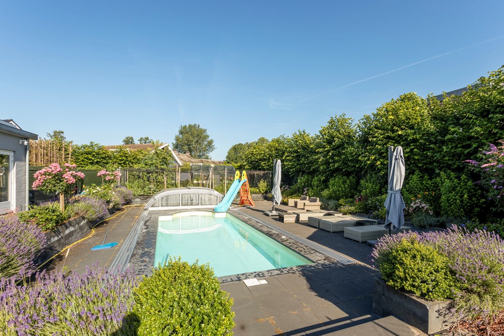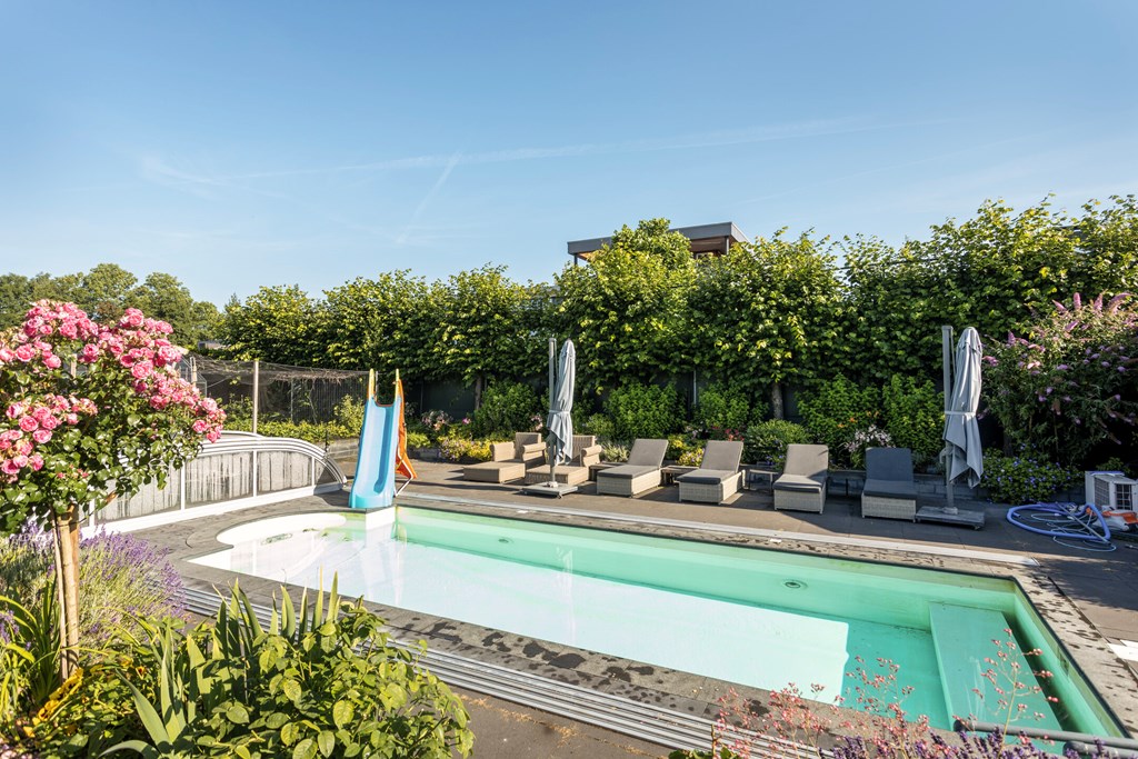 A second, covered terrace has also been created so you can enjoy the garden in all weather; this canopy forms part of a large storage structure. On this generous plot of approx. 1,180 m², the garden offers lounge areas by the pool, children’s play spaces, and your own kitchen garden—something for everyone.
