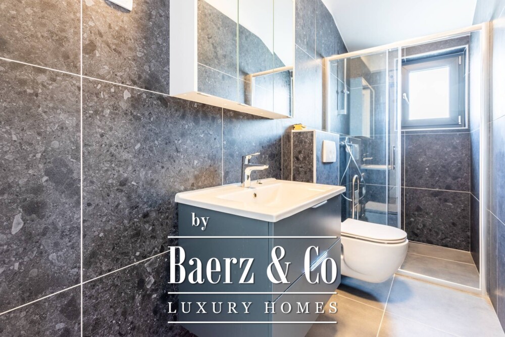 On the ground floor, an open rhythm connects the entrance hall, a generous living room, kitchen with dining area, and yard access, all designed for ease and flow. A bedroom with private accessible bathroom, as well as a guest bathroom, anchor the main level’s versatility. Upstairs, four bedrooms, each with ensuite bath, include two with terraces for private contemplation. The basement offers a dedicated storage and engine room. Air conditioning in every room enhances comfort.