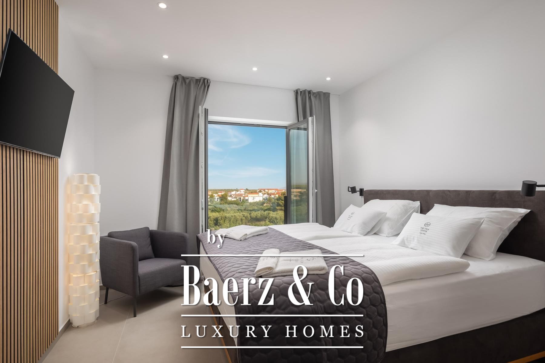 Vodice, modern villa with a swimming pool and sea view, 332.92 m2. The villa was built in 2022. It is being sold fully furnished and equipped, and is ideal for a vacation or tourist rental.Built on 2 floors on a plot of 838 m2. It consists of a ground floor with 2 bedrooms, each with its own bathroom, a garage, a toilet, and a spacious living room with a kitchen and dining room. The living room opens onto an outdoor terrace with a large heated pool next to which there is a sunbathing area, and a summer kitchen equipped with top-quality appliances. On the first floor there are three more bedrooms, each with its own bathroom, and a laundry room with a washing machine and two dryers. The bedrooms open onto
