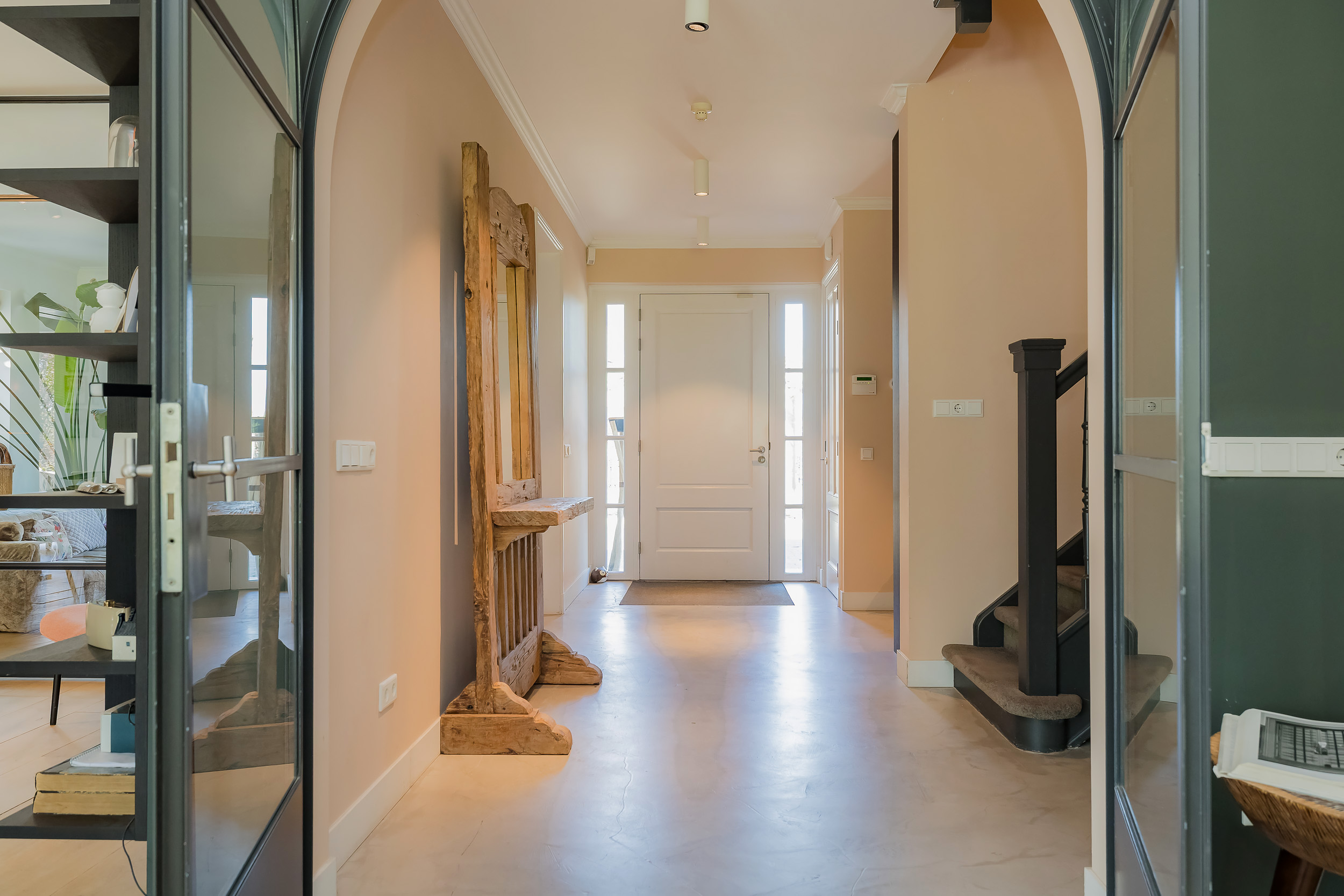Step into the spacious hall with guest toilet and immediately feel the stylish atmosphere that continues throughout the house. The spacious living room with a beautiful sandstone fireplace and large windows offers a fantastic view of the surrounding garden. For cozy movie nights, there is a separate TV room directly to the right of the entrance. The beautiful concrete-look floor (hallway and living kitchen), luxury steel doors and the high-end kitchen with work island and high-quality appliances provide a modern, yet warm feel. In the living kitchen is further created a lovely sitting area, with access and view of the garden and a modern gas fireplace. Furthermore, on the first floor you will find a practical utility room, double garage, and have access to a spacious porch and a large terrace, where you can fully enjoy the outdoors.
