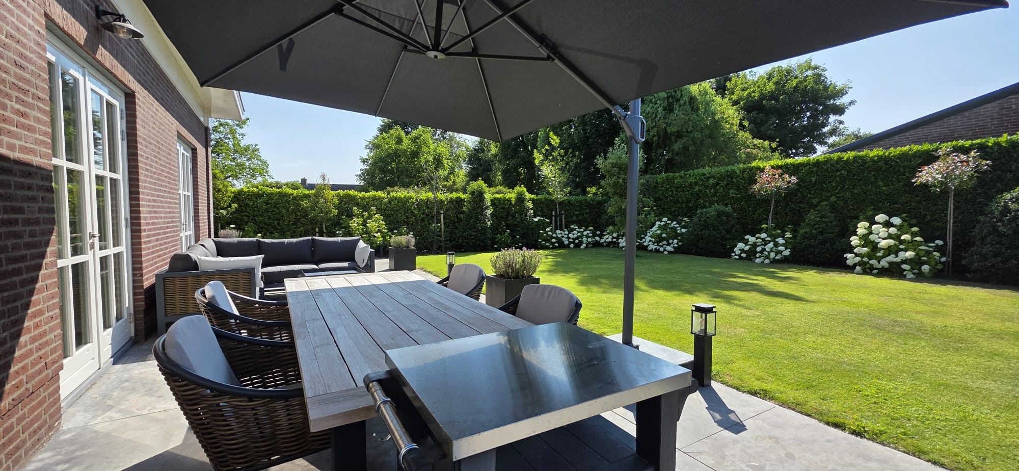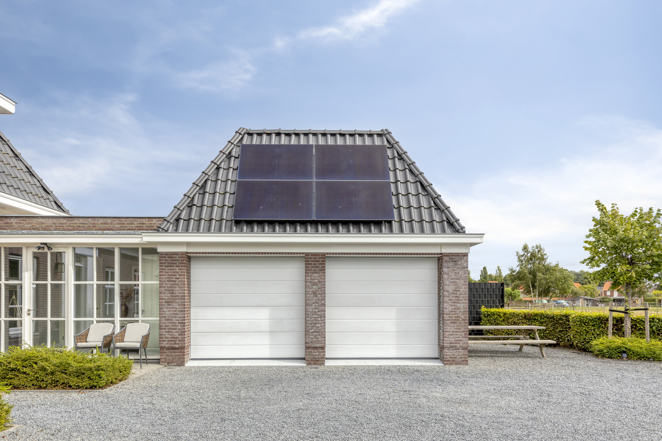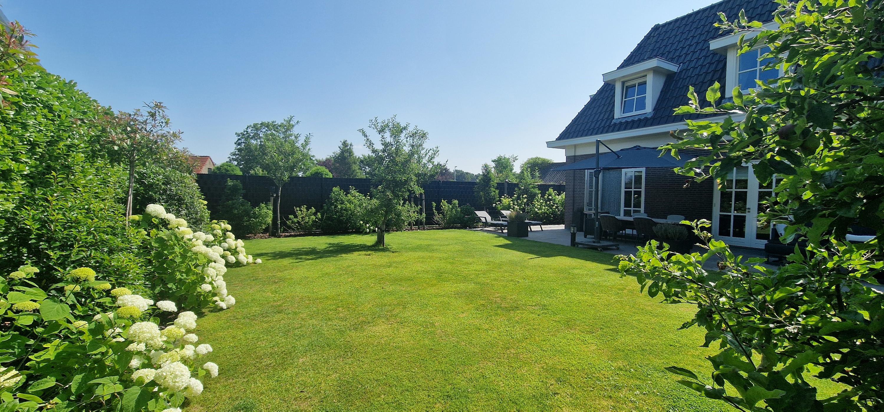Outdoor living has been carefully designed. The garden is beautifully landscaped and excellently maintained, featuring natural stone terraces, lush greenery and an automatic irrigation system. The sunny orientation, the double garage with polished and coated concrete floor, and the generous driveway – accessed via a two-part electric gate that radiates class and quality – all contribute to the premium character of this property. The views of the surrounding fields and the Wouw windmill are stunning.