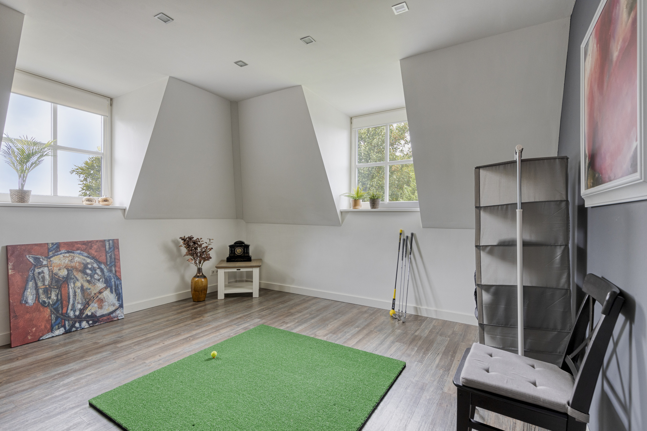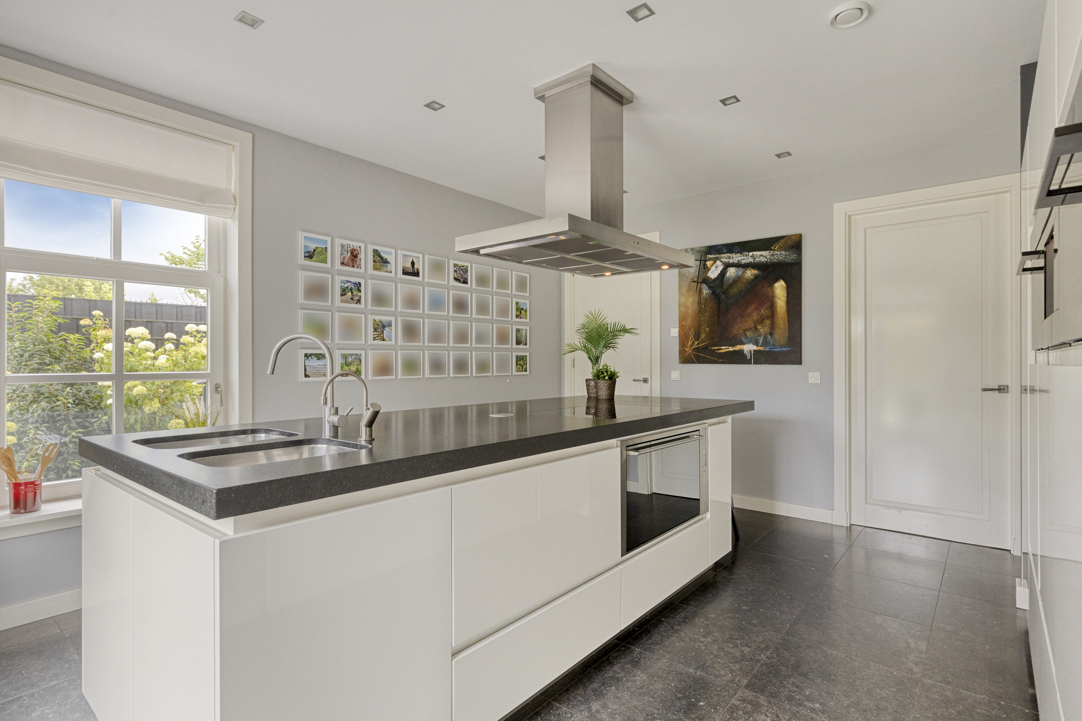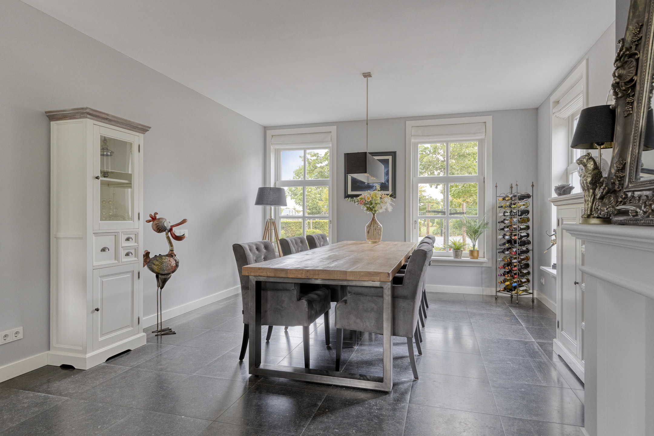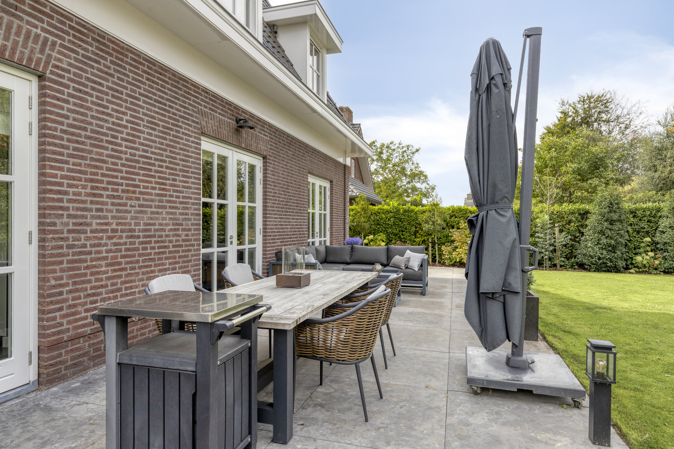 Outdoor living has been carefully designed. The garden is beautifully landscaped and excellently maintained, featuring natural stone terraces, lush greenery and an automatic irrigation system. The sunny orientation, the double garage with polished and coated concrete floor, and the generous driveway – accessed via a two-part electric gate that radiates class and quality – all contribute to the premium character of this property. The views of the surrounding fields and the Wouw windmill are stunning.