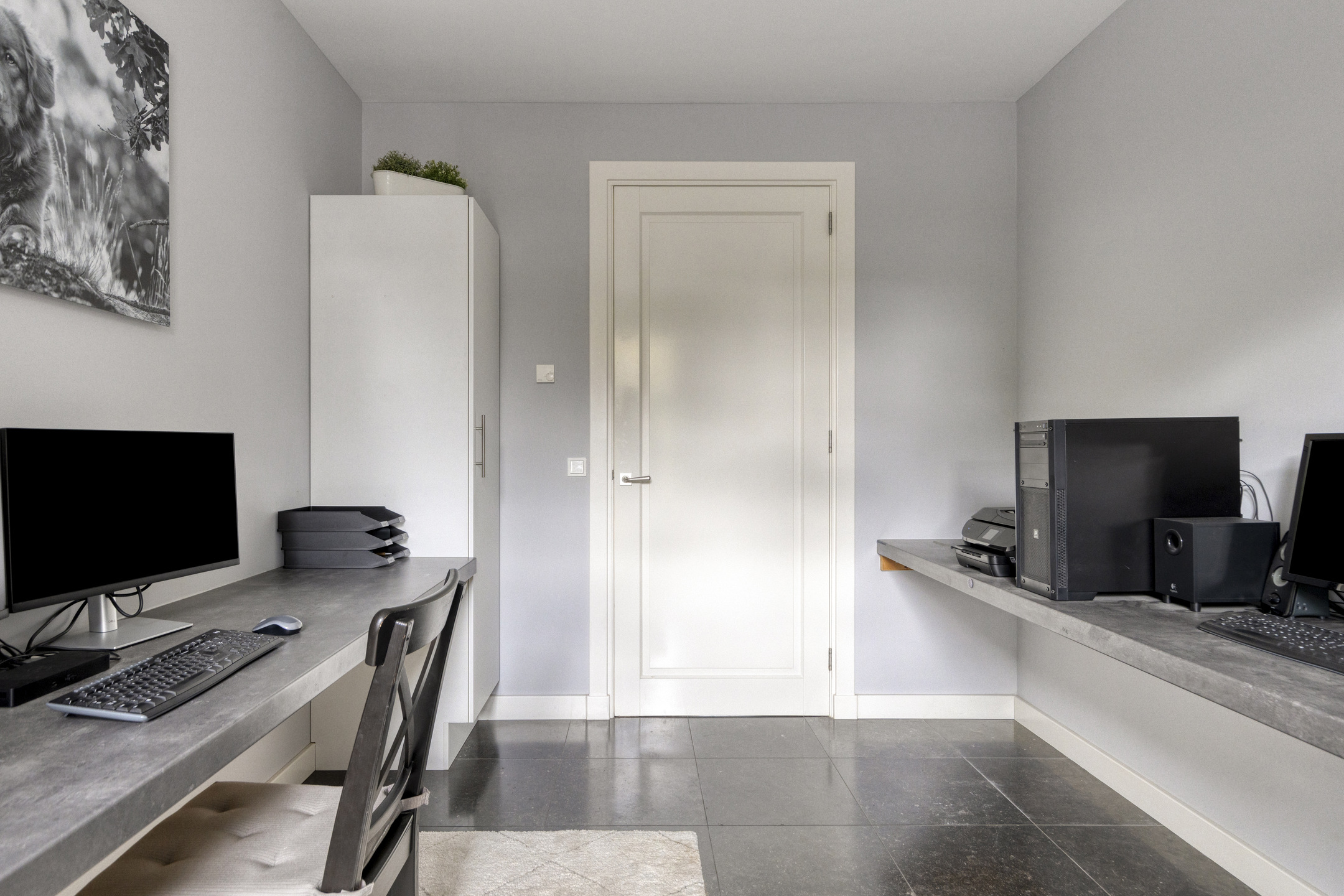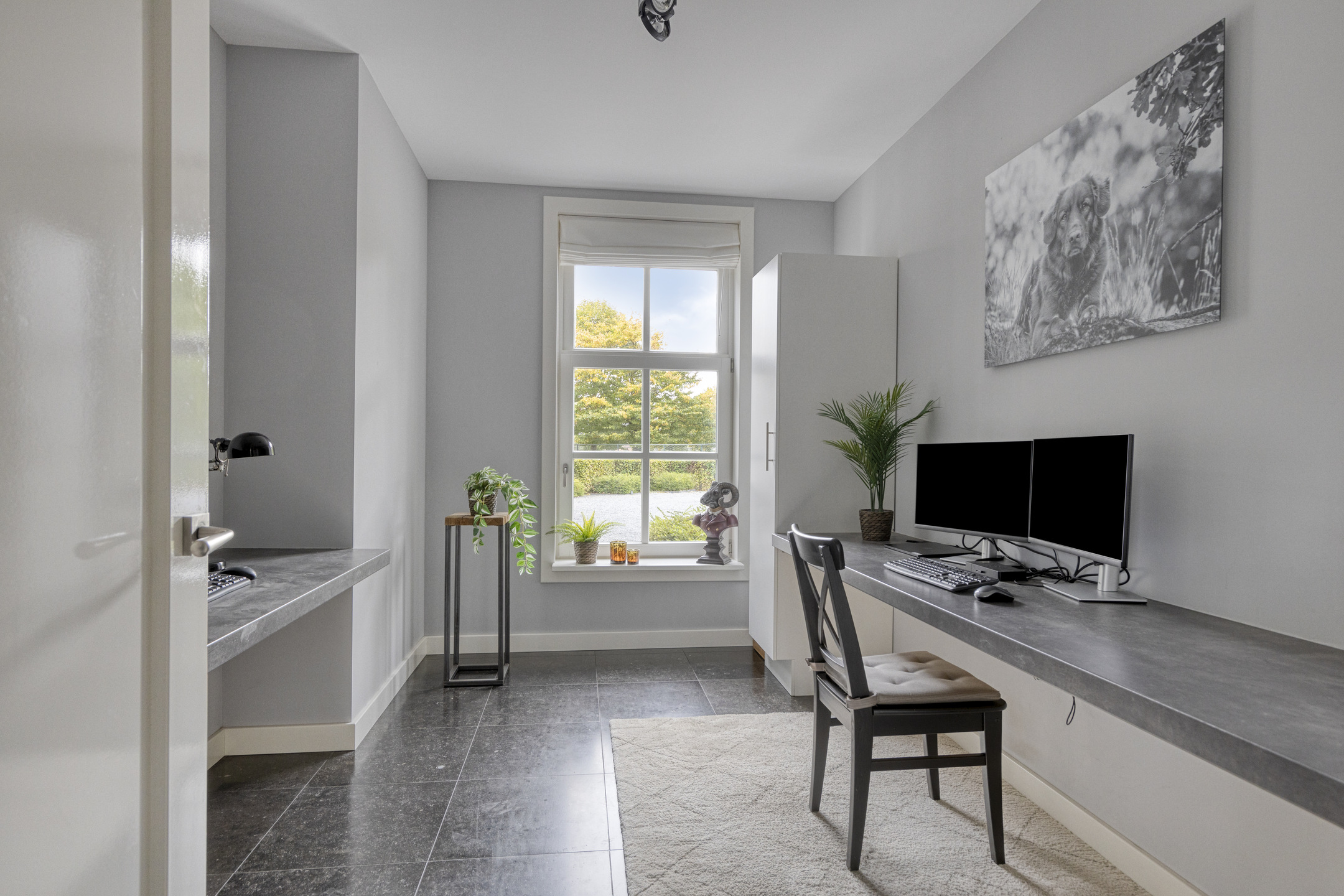 Office or playroom: plastered walls, natural stone floor, plastered ceiling.