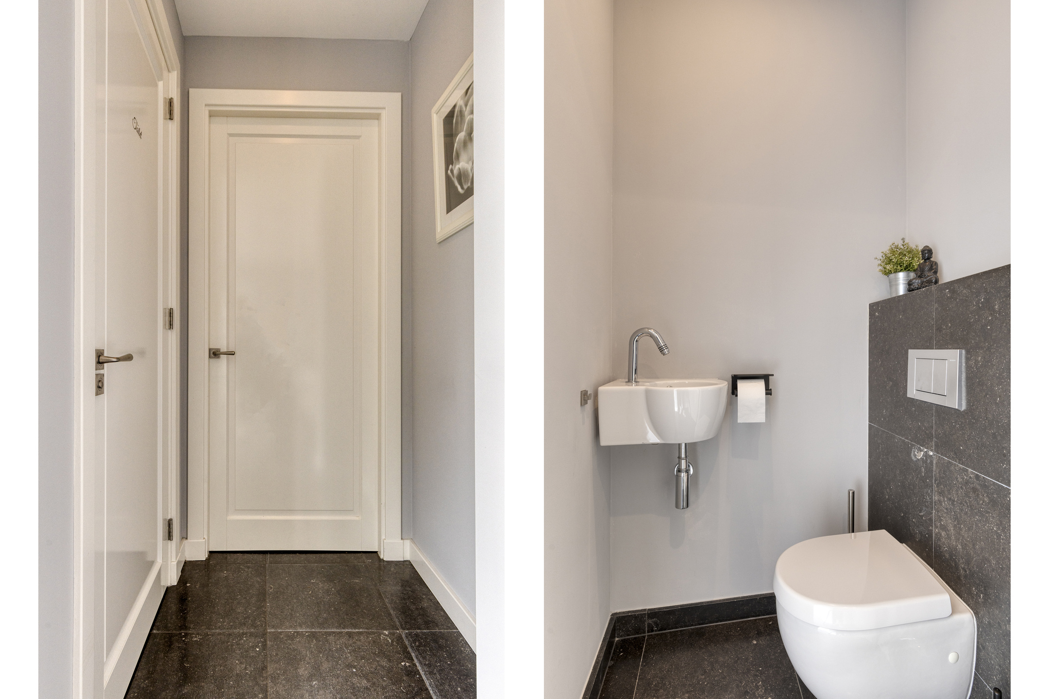 Toilet: modern tiling, a wall-mounted toilet and small wash basin; walls finished in plaster and natural stone; natural stone floor; ceiling with recessed lighting.