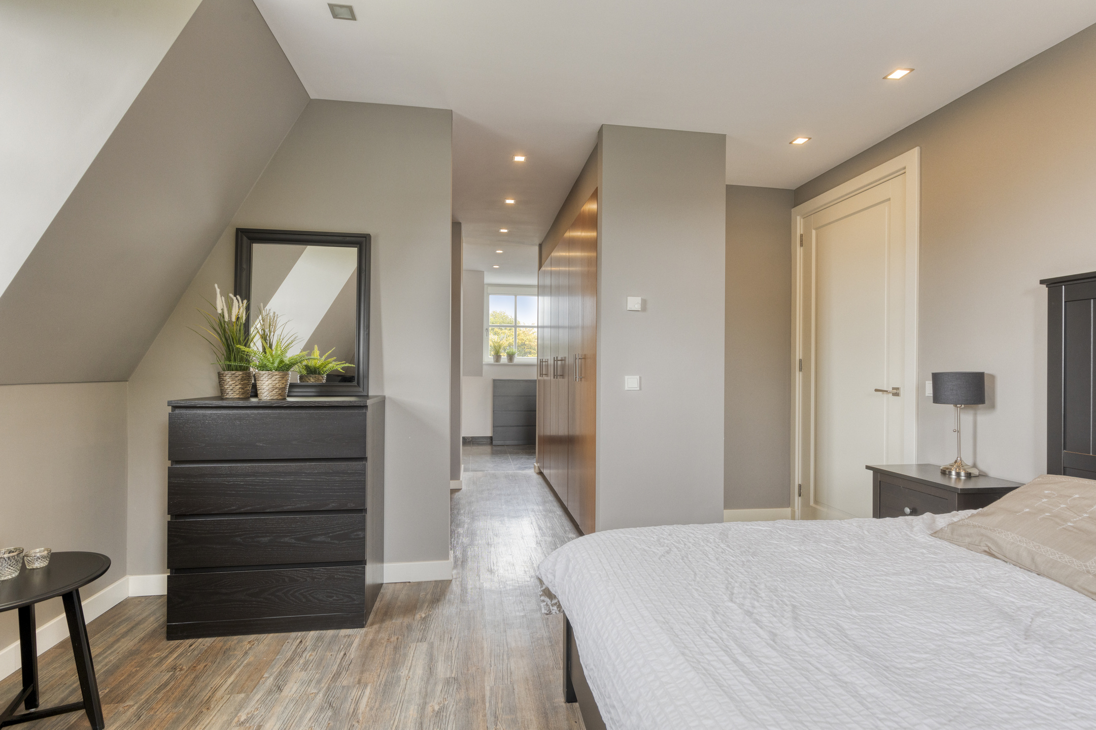 Master bedroom: with walk-in closet; plastered walls; PVC flooring; ceiling with recessed lighting.