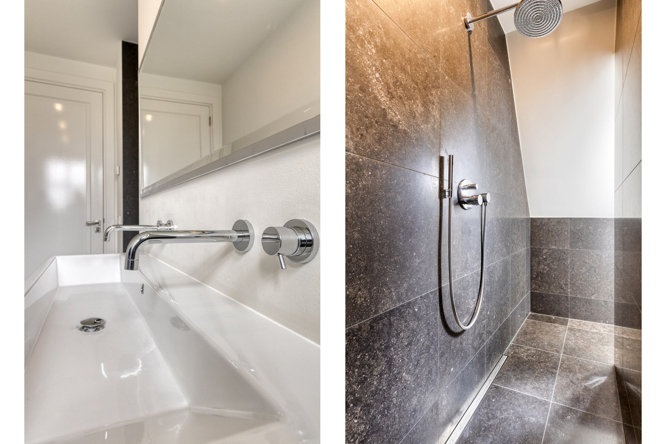 Second luxurious bathroom (for children or guests): finished in natural stone; with dormer window; large walk-in shower and double wash basin.