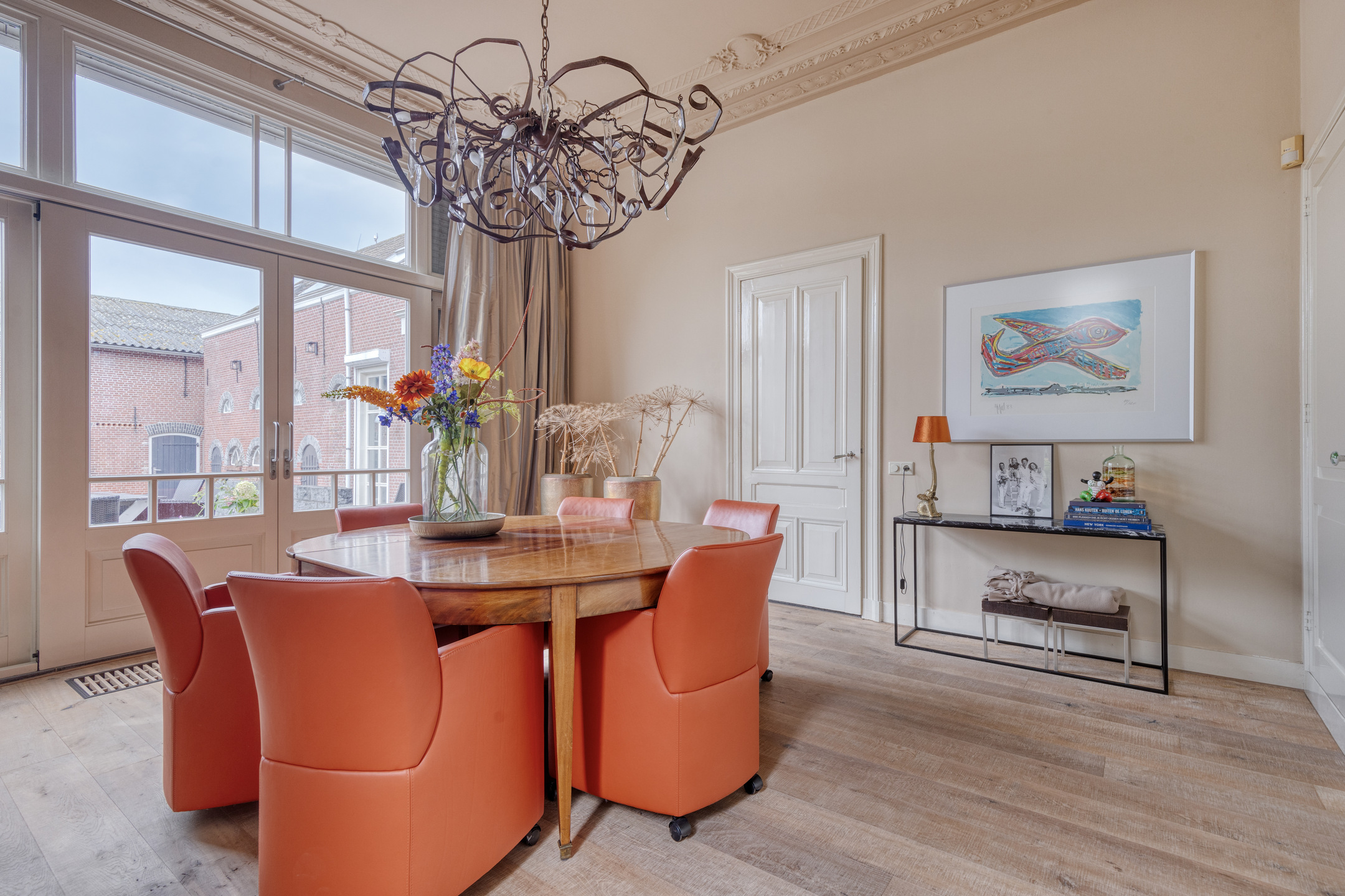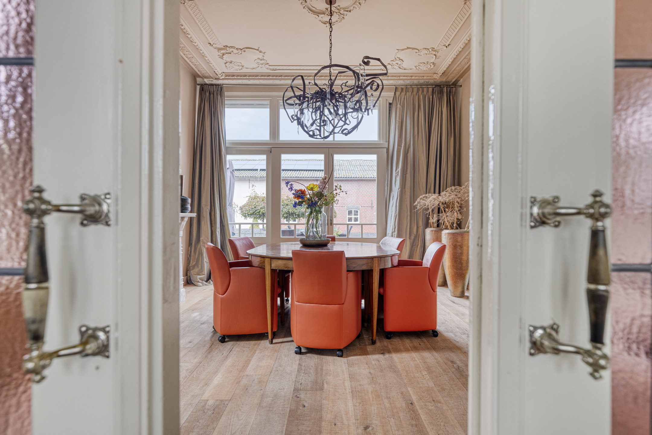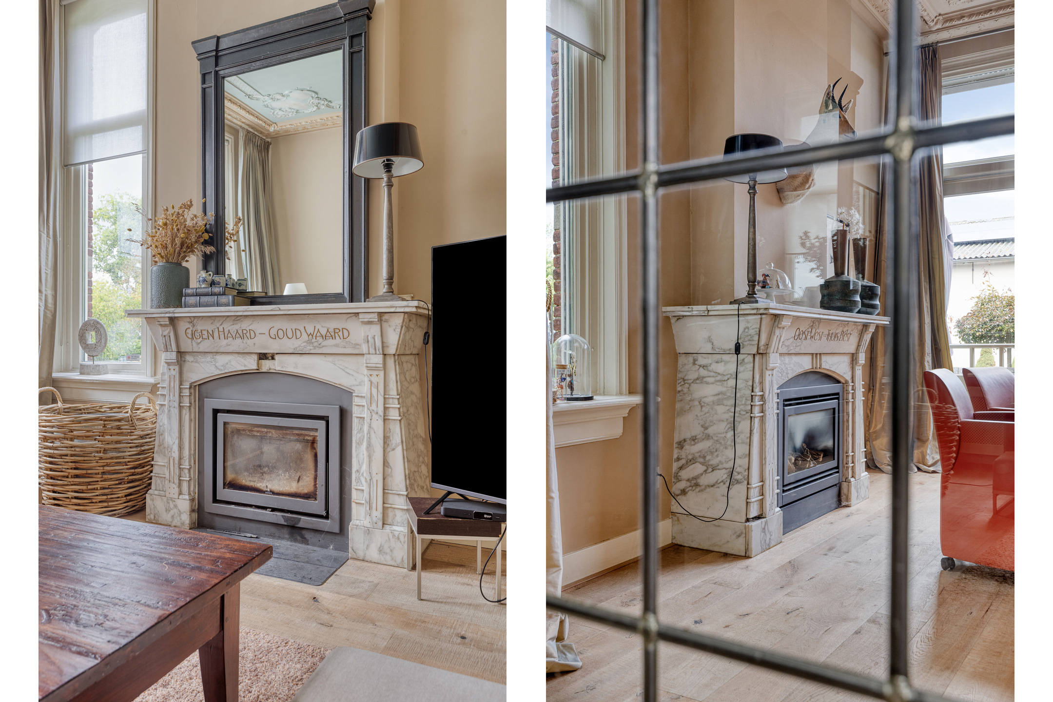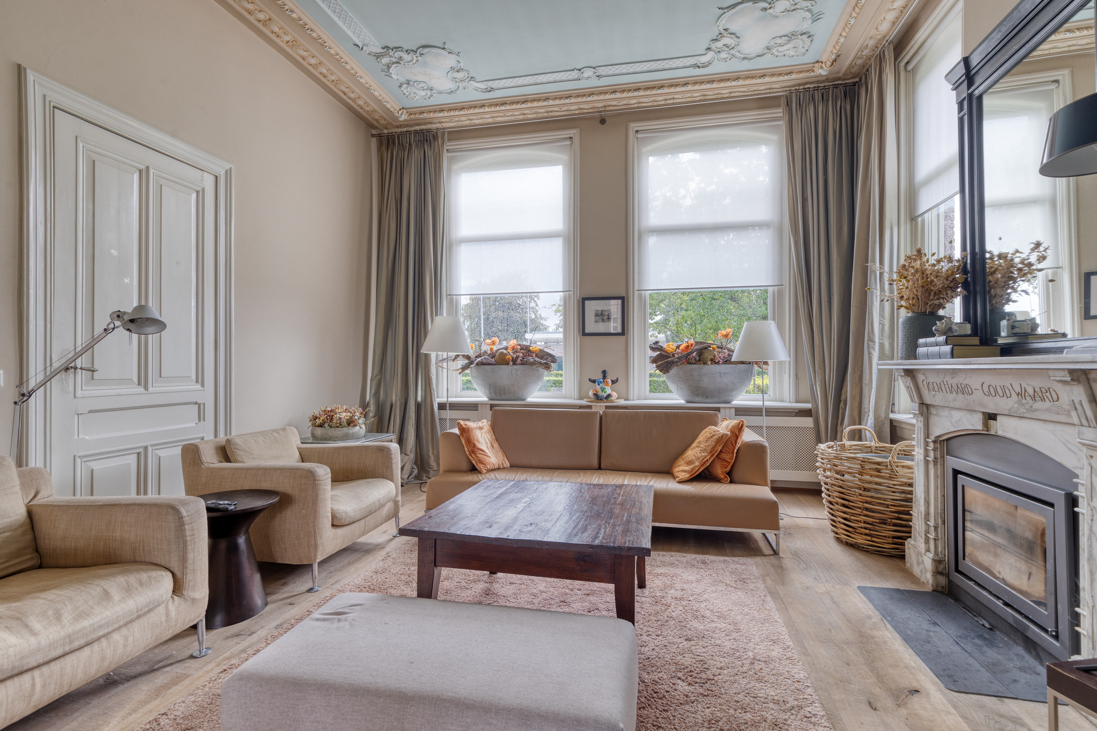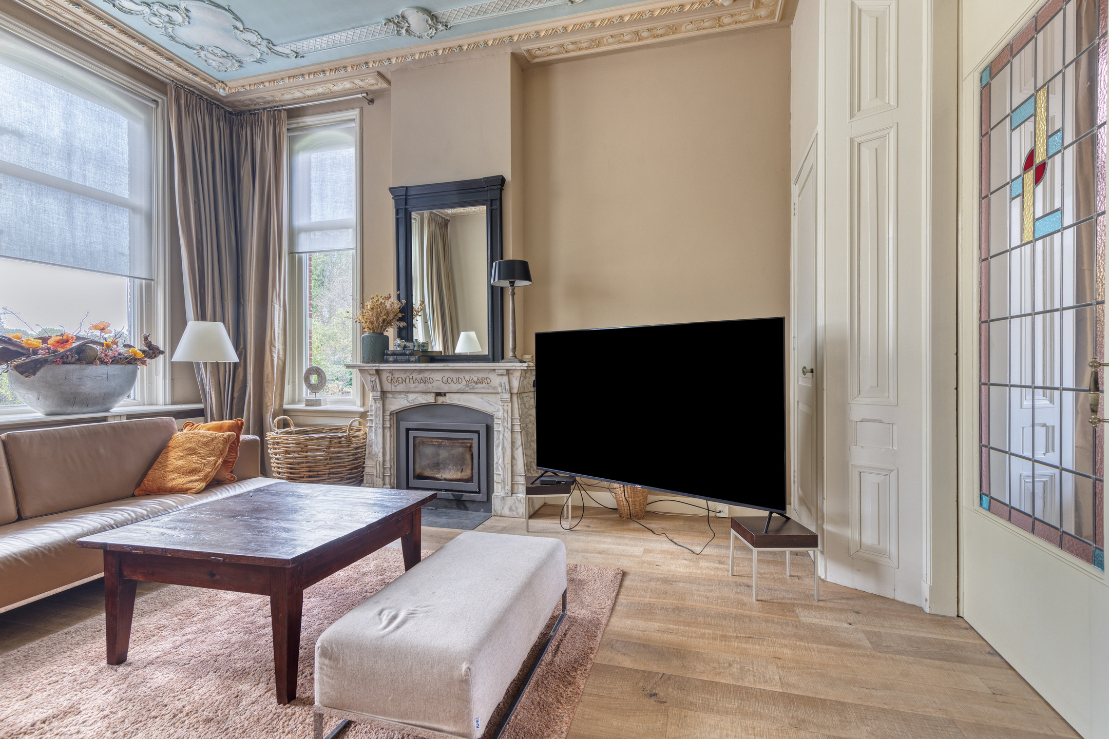 imposante woonkamer en-suite (ca. 50 m²) voorzien van glas-in-lood deuren, inbouwkasten en dubbele marmeren schouwpartijen met een inbouw gashaard en inbouw houtkachel, wandafwerking stucwerk, eiken planken vloer, prachtig authentiek plafond voorzien van sierlijsten en ornamenten;