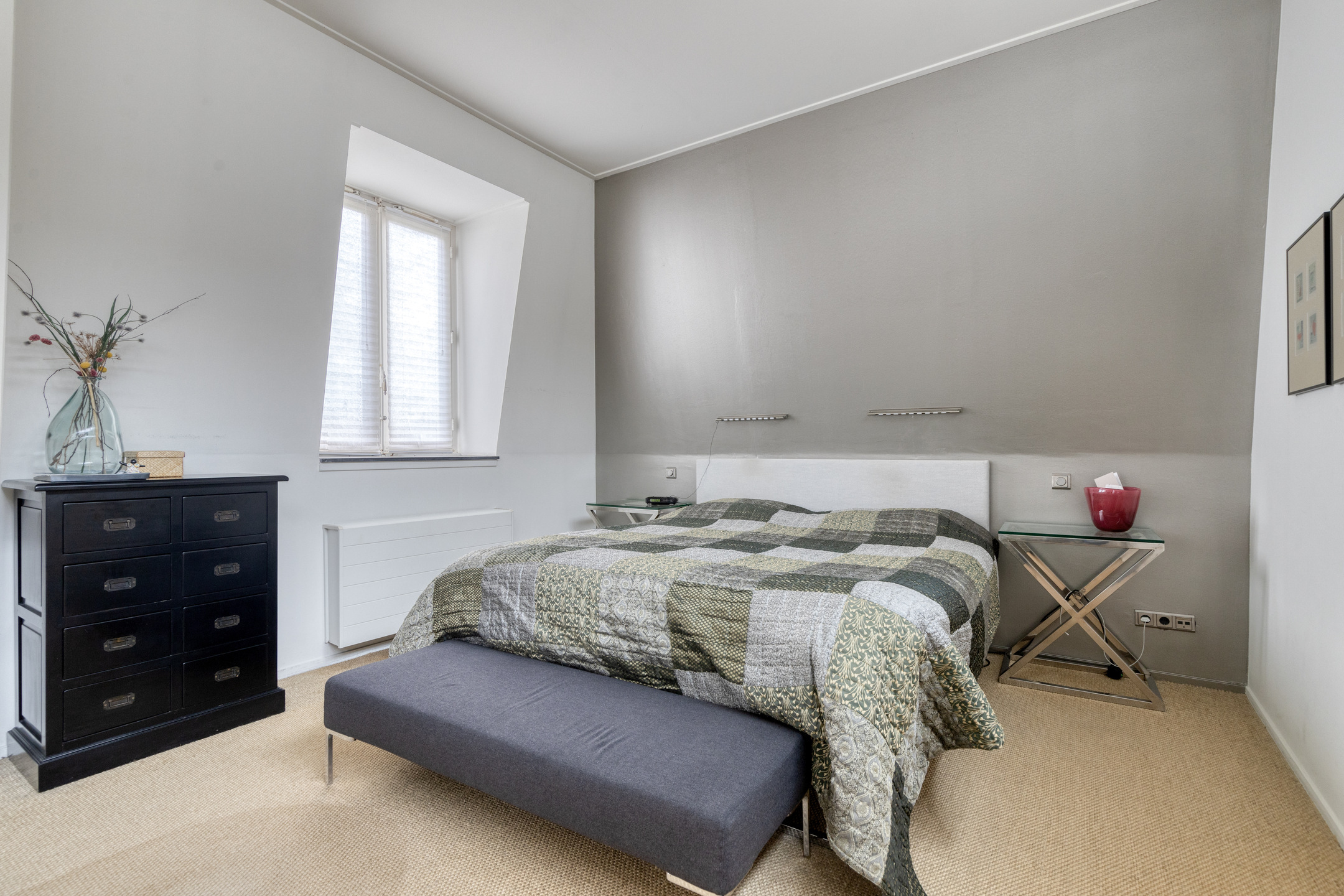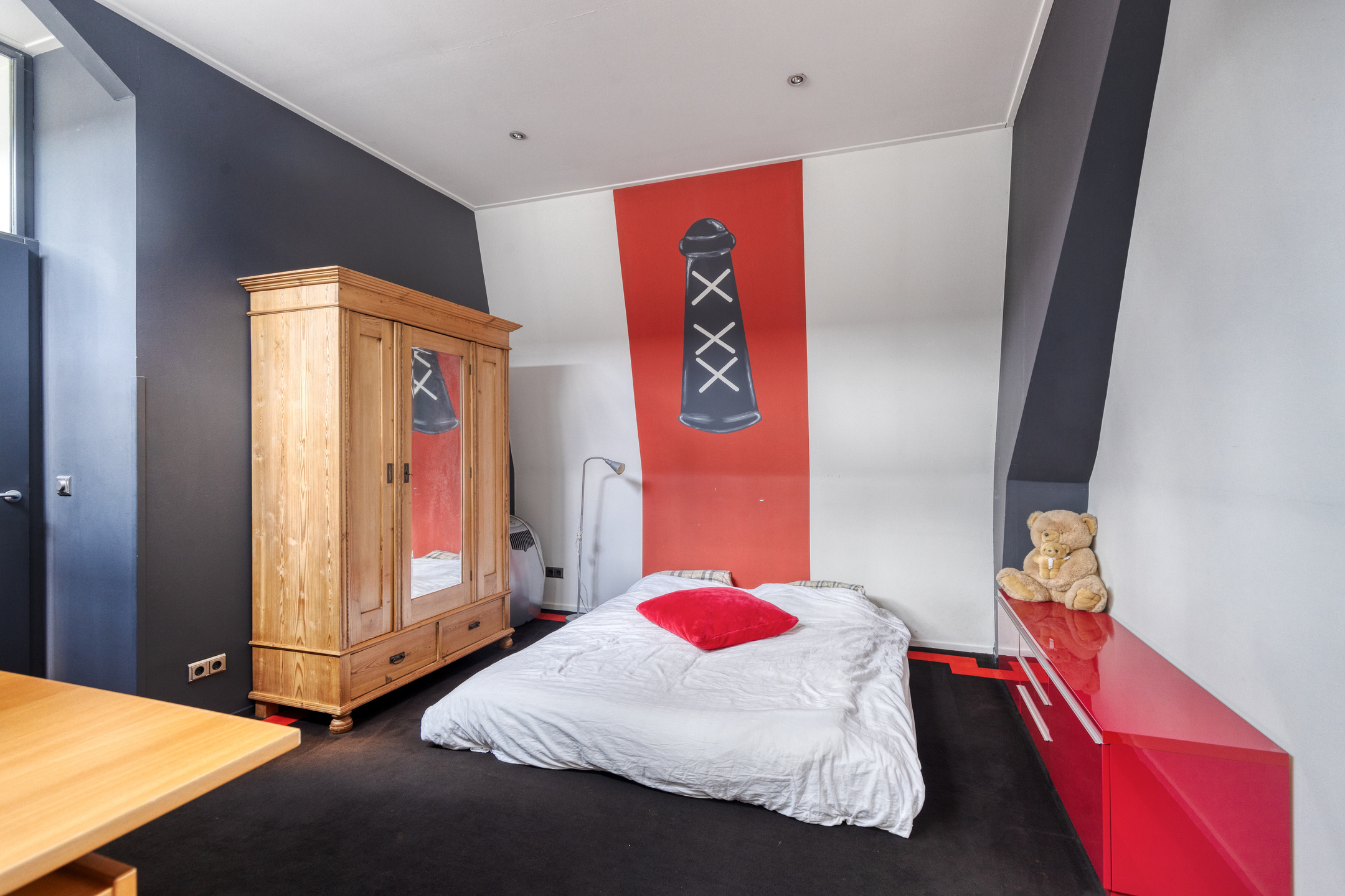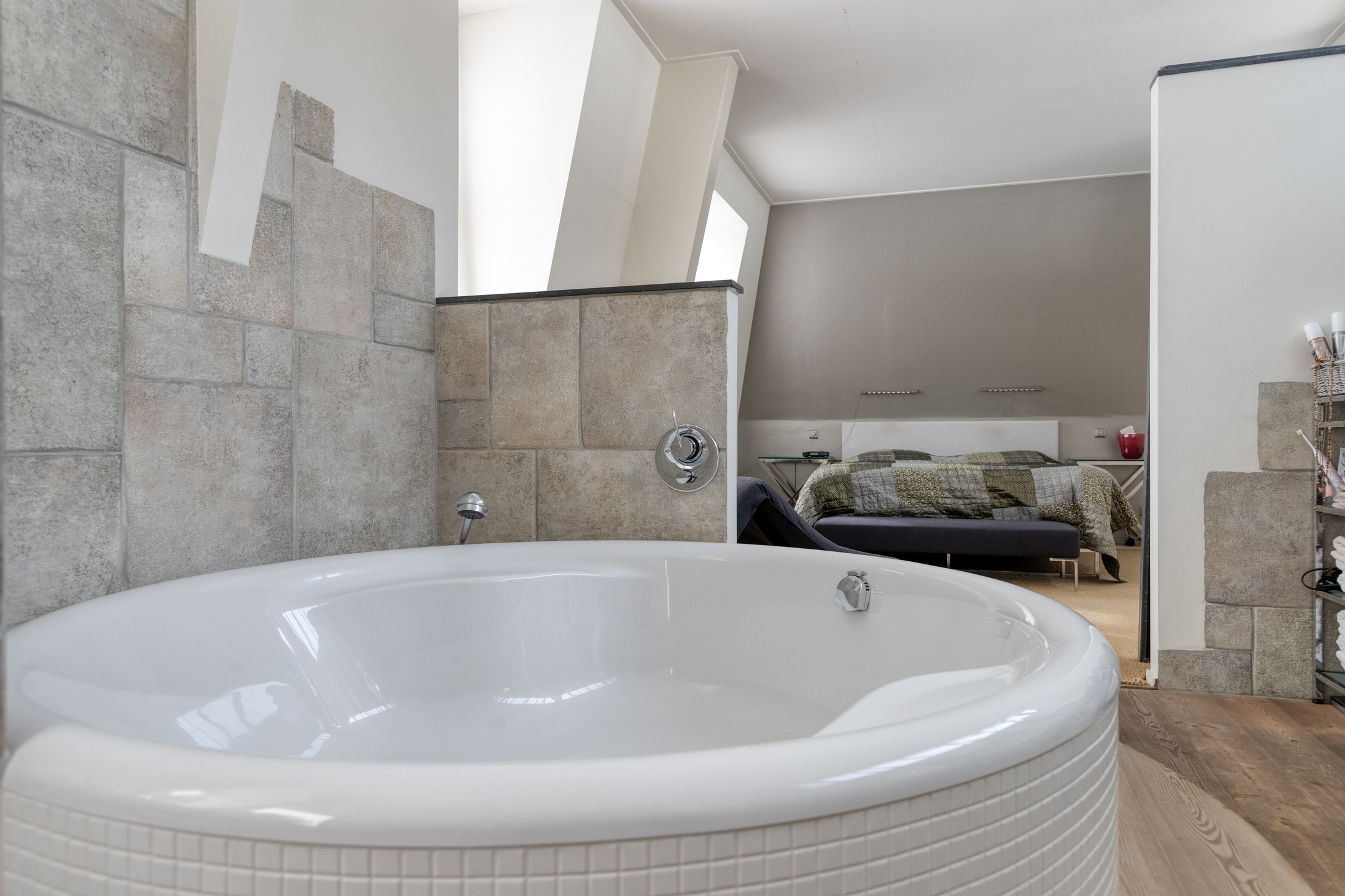 hoofdslaapkamer voor (ca. 40 m² incl. badkamer en-suite), wandafwerking stucwerk, vloer afgewerkt met tapijt, plafond afgewerkt met stucwerk;