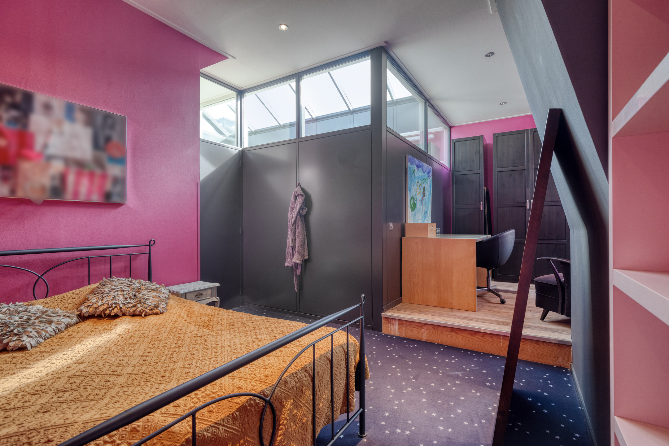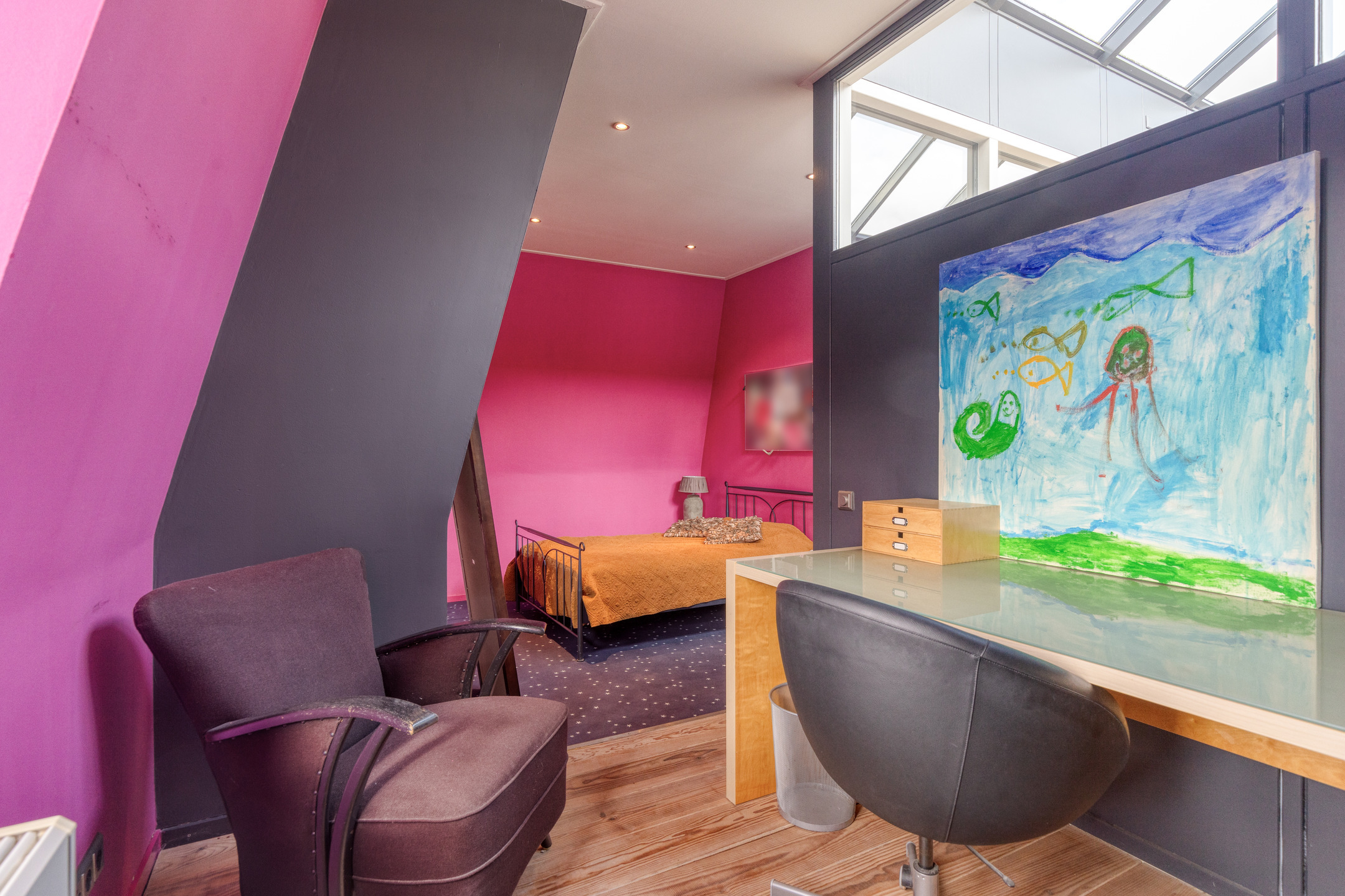 speel/TV/opkamer met een kastenwand, wandafwerking stucwerk, eiken planken vloer, plafond afgewerkt met stucwerk;