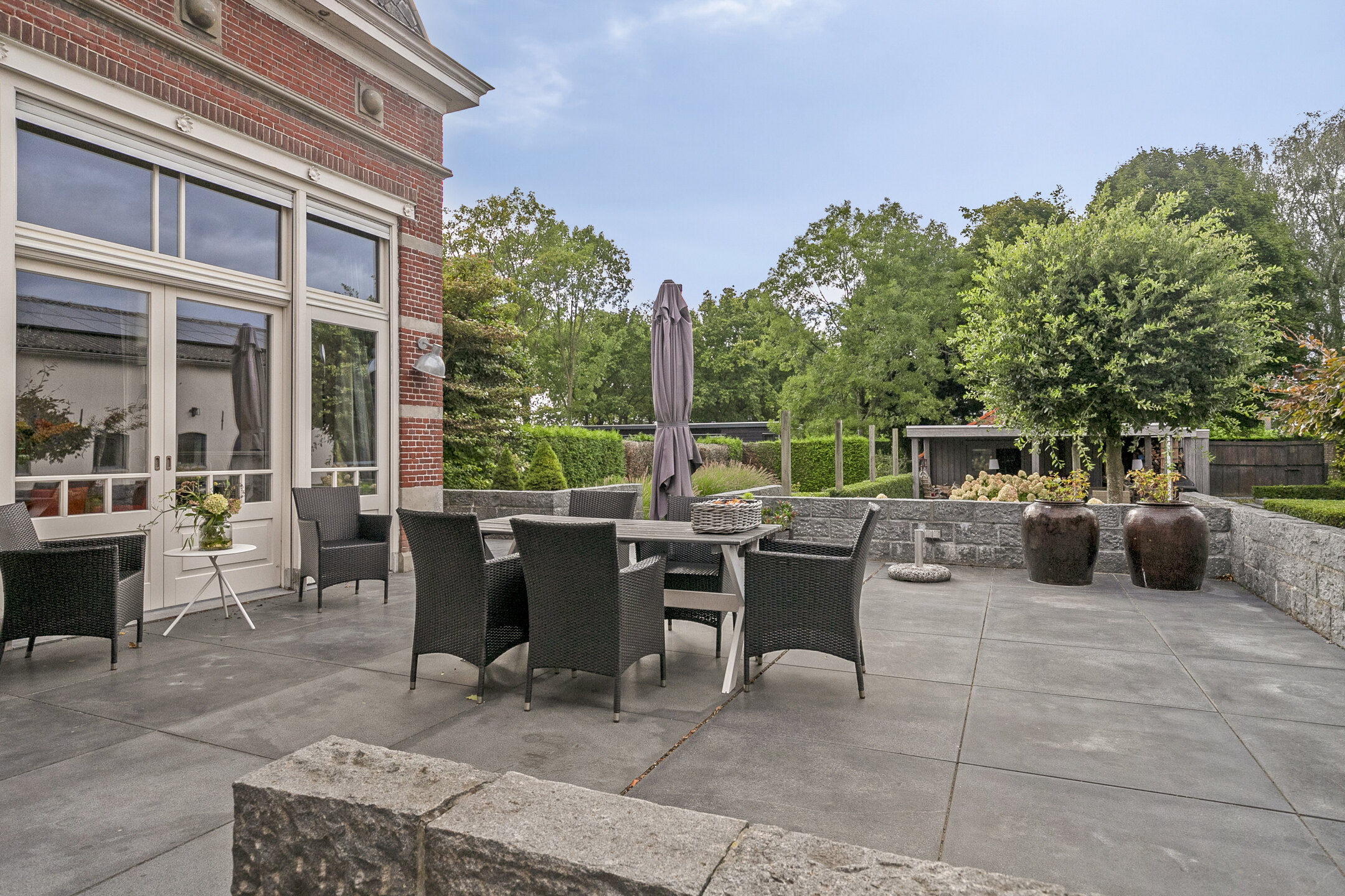 prachtig aangelegde landschapstuin voorzien van diverse terrassen verhard met granieten tegels, borders en gazon voorzien van diverse tuinkamers;