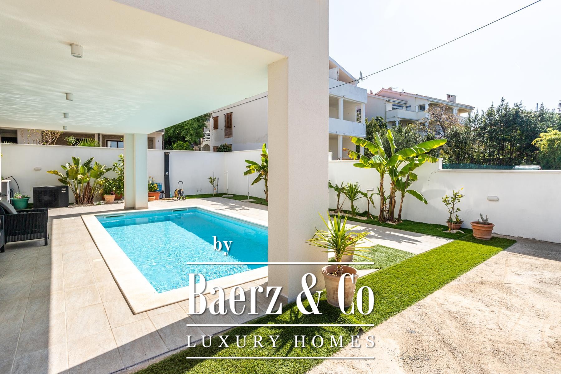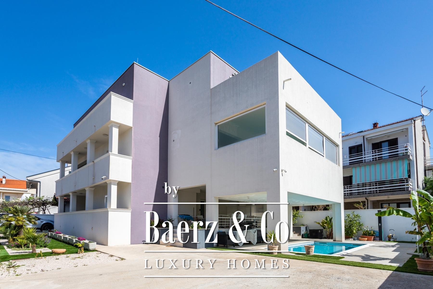 Zadar, Diklo, luxuriously decorated villa is located in the most attractive location that offers a peaceful and pleasant environment. The villa of 485m2 is spread over a plot of 596m2, has three floors, luxuriously and elegantly decorated, eight bedrooms with all hotel accessories such as mini bar, safe, private balcony, etc., nine luxuriously designed bathrooms, with an indoor pool on the second floor. which is also used in the winter months and the outdoor pool in the garden. Beautifully decorated garden with Mediterranean herbs and olive trees. The comfort of this luxury mini-hotel stands out for its easy access by car or public transport. The villa itself has six parking spaces. Distance from public transport 50 m. Distance from the airport 15 km, distance from the beach 100 m. Key features: Six parking spaces Eight rooms Nine bathrooms Smart video surveillance system with alarm The entire facility is air-conditioned Indoor and outdoor pools