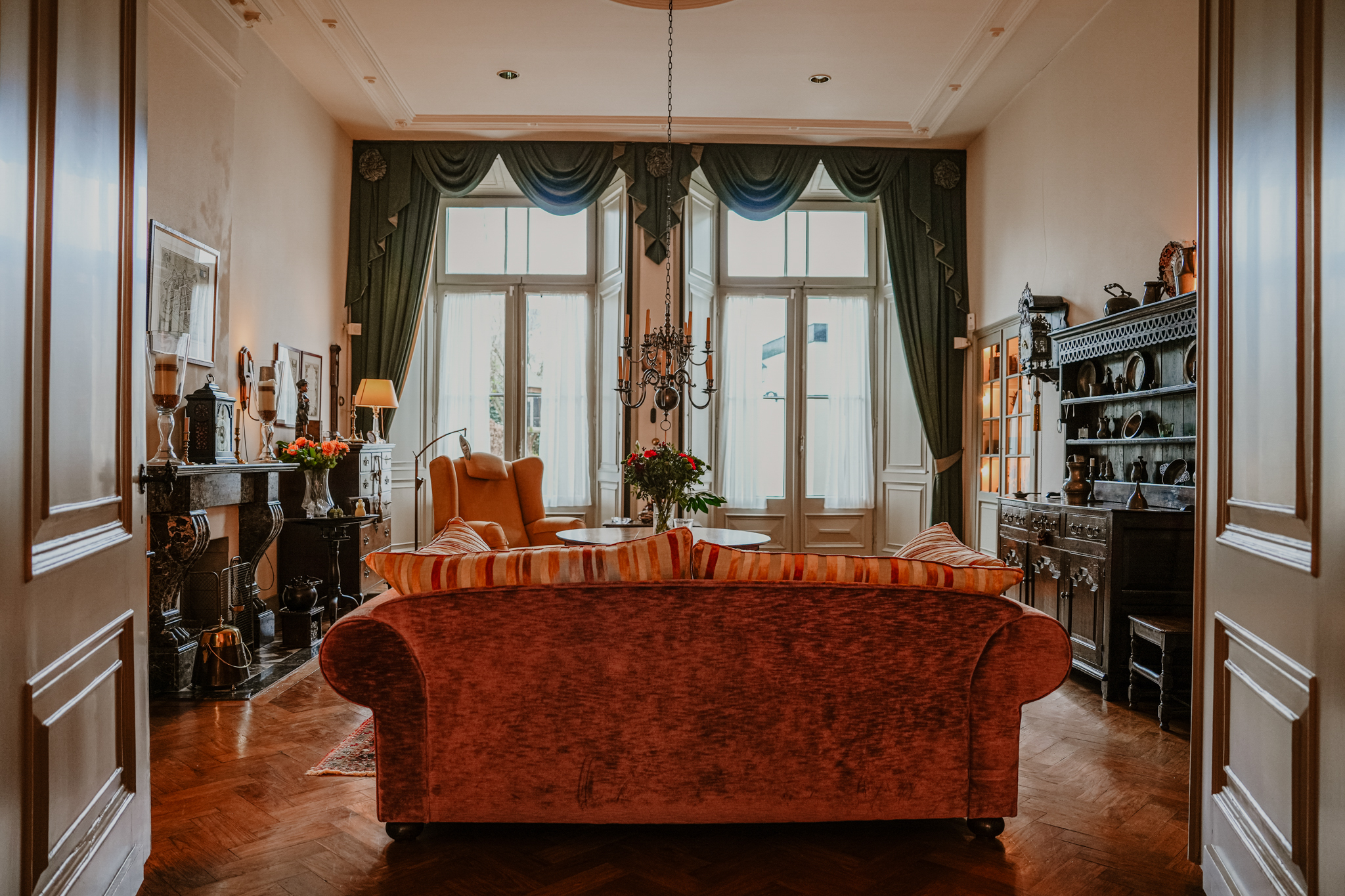 The imposing entrance hall is as large as an average living room. The marble floor continues into an adjoining hallway paved with natural stone. To the left is the expansive living room and en suite, measuring an impressive 70 m². The living room features high stucco ceilings, tall windows with stained glass transoms, two natural stone fireplaces, window seats, interior shutters, fitted cupboards, and herringbone parquet flooring. At the rear, two pairs of French doors open onto the garden.
