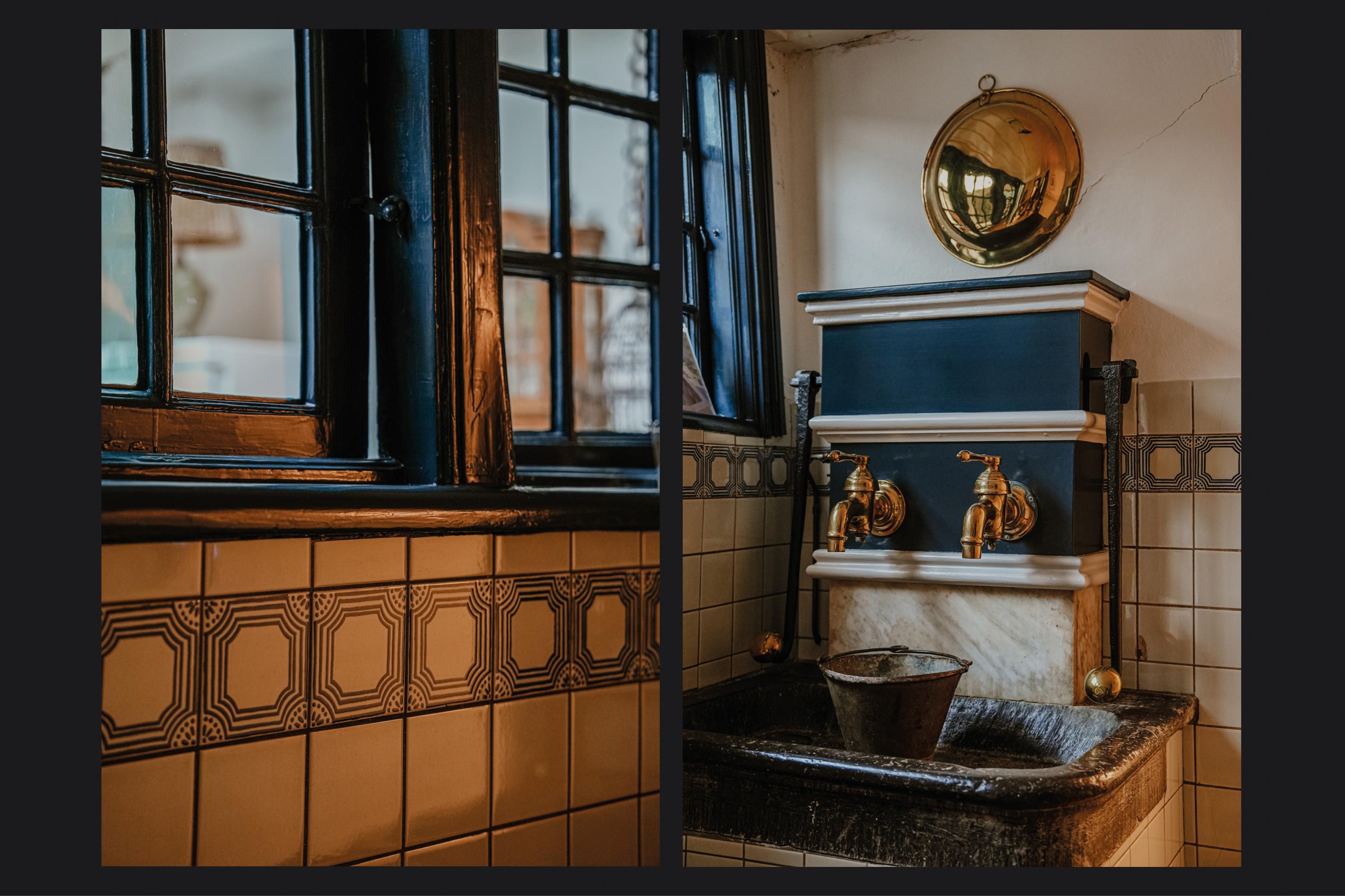Adjoining the hallway are the cellar, utility room, and dining kitchen. A glass panel in the cellar floor reveals the historic water well below. The utility room occupies the former outdoor space of what was once the western house when the property consisted of two separate homes. The hallway retains the original 18th-century pump with a stone basin and brass taps. The dining kitchen is furnished with a classic kitchen unit featuring built-in appliances and a terrazzo countertop. From the kitchen, there is a pleasant view of the garden.