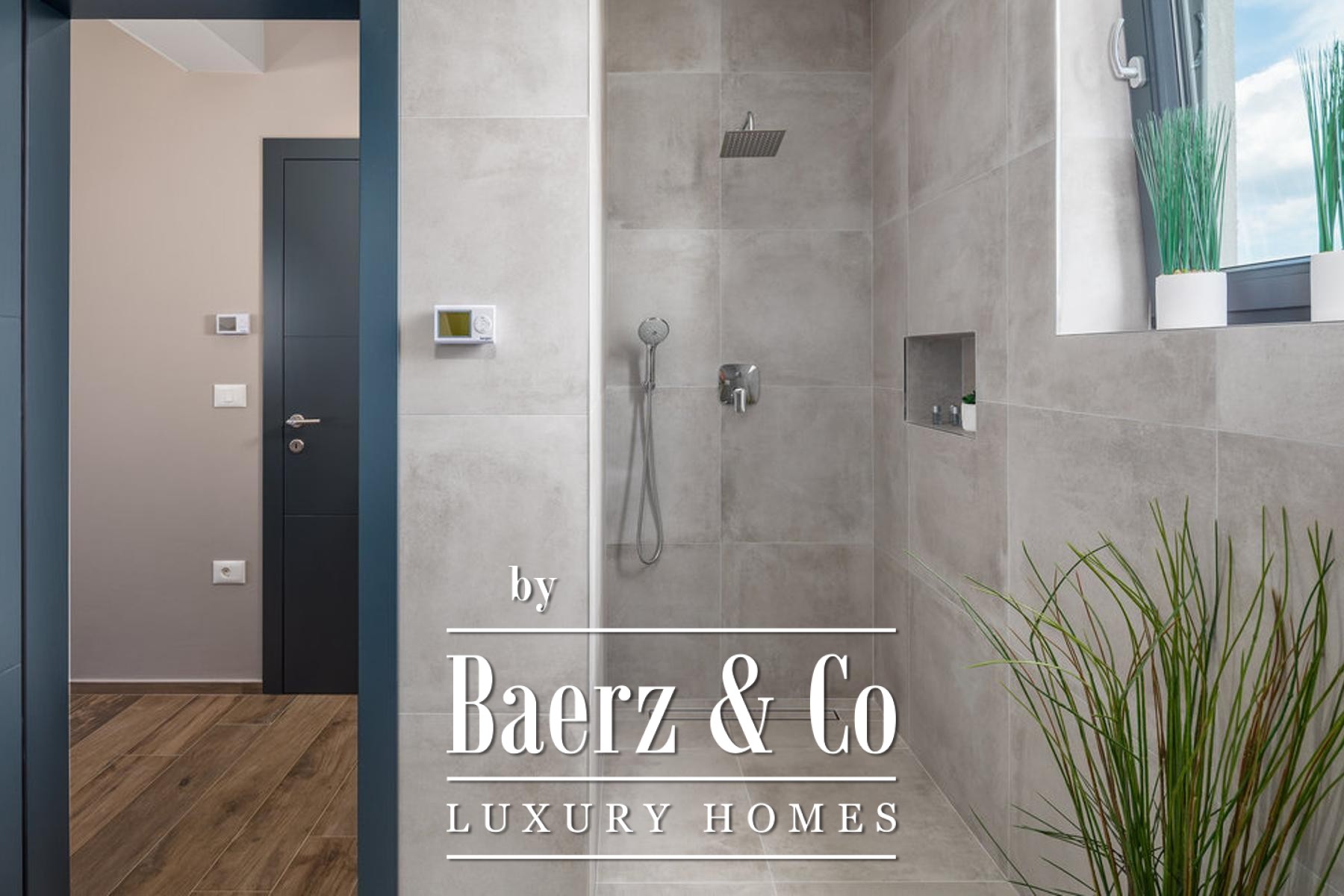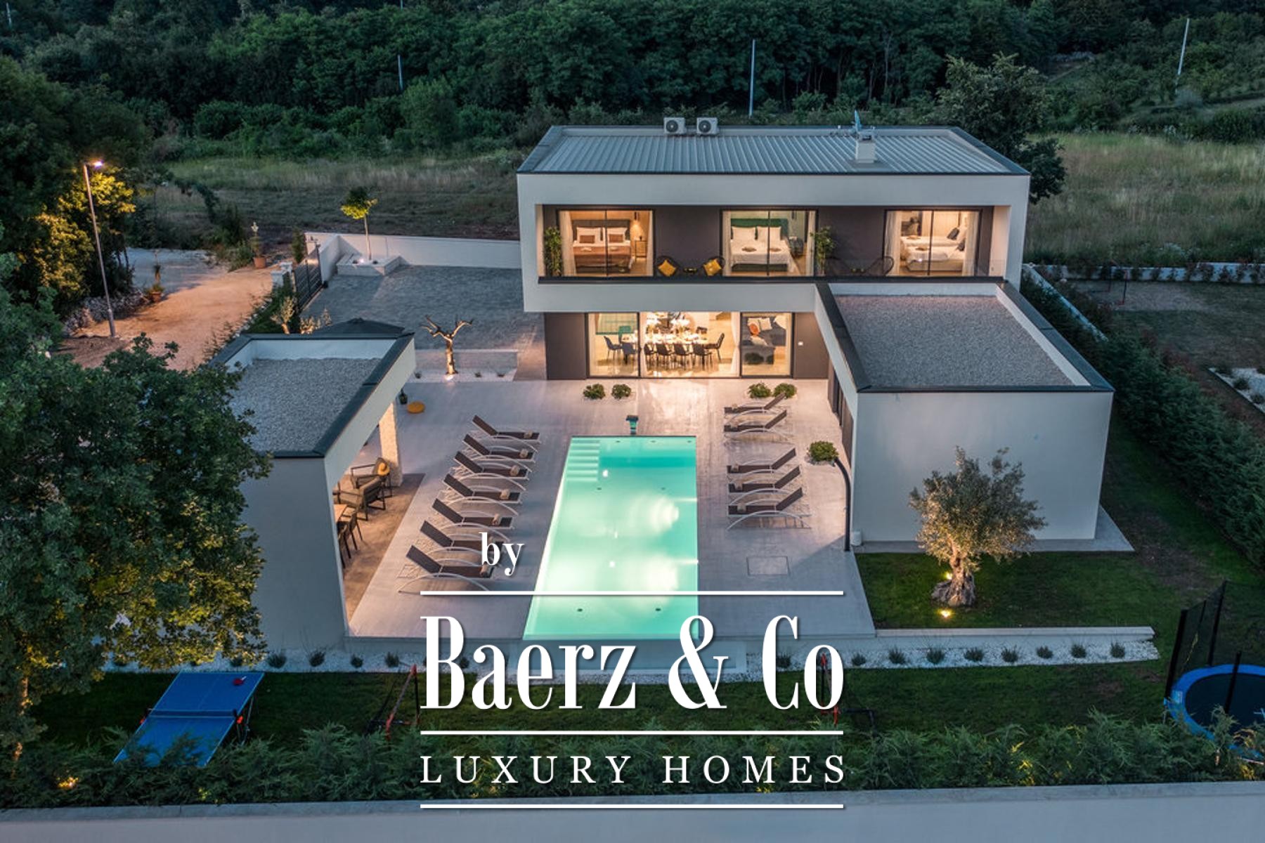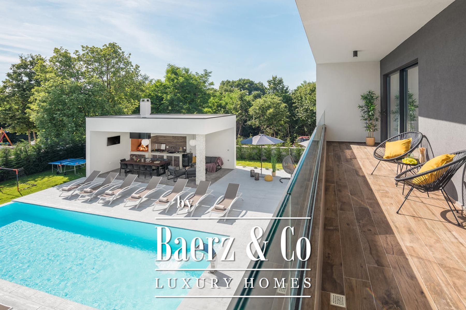 bathroom, and each room has direct access to its own terrace with a beautiful view of nature.On the plot there is a sunbathing area, a heated pool with a heat pump with a total size of 38.50 m2, and a covered area with a barbecue and a place to dine with your loved ones.The best materials and equipment were used for this property, high quality construction, aluminum joinery, underfloor heating system through a heat pump. All rooms are air-conditioned. First-class parquet and ceramics, all furniture is designer and of well-known brands.A first-class property that deserves attention.For more information or to arrange a viewing, please feel free to contact us.