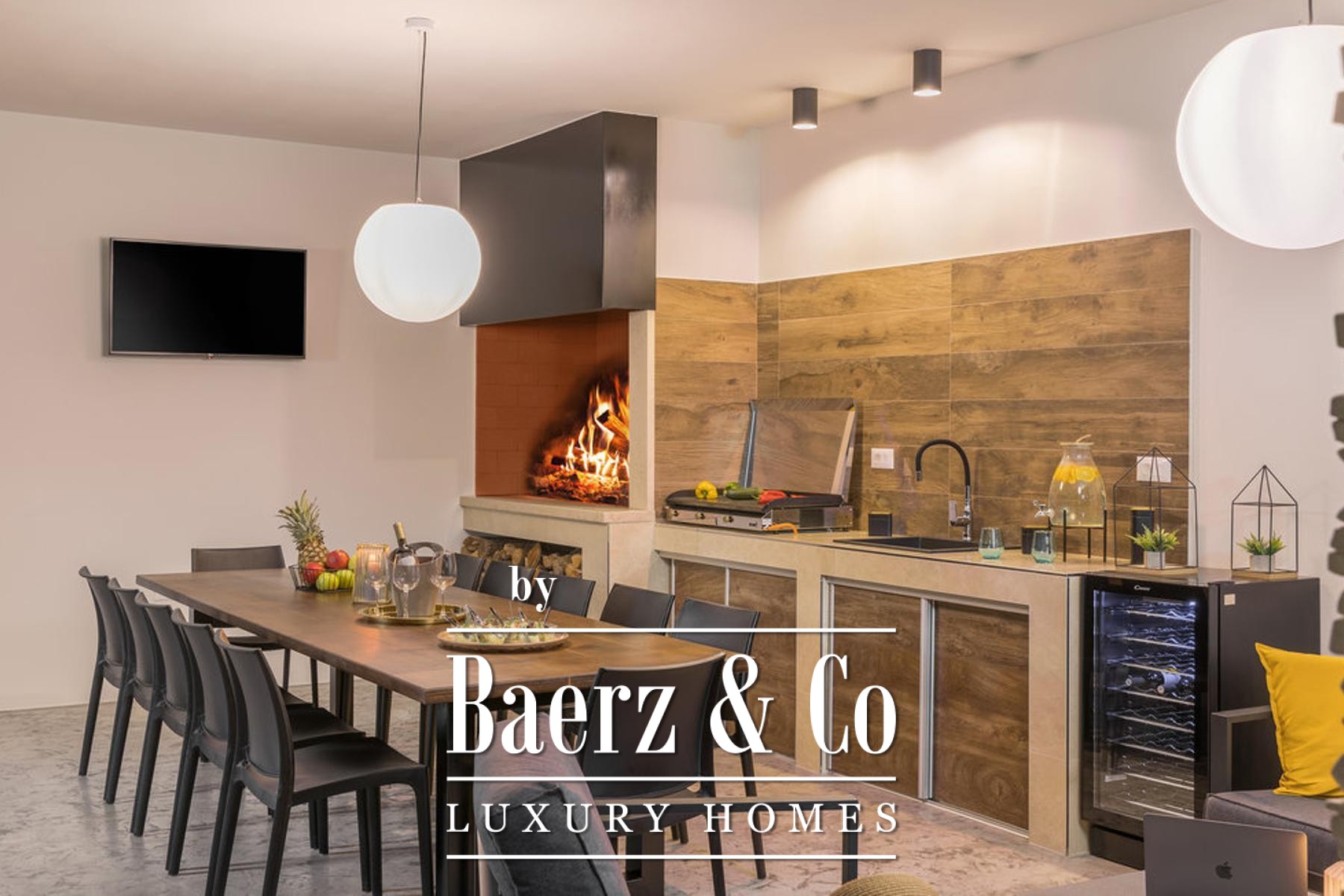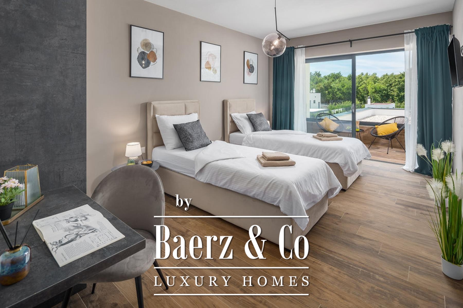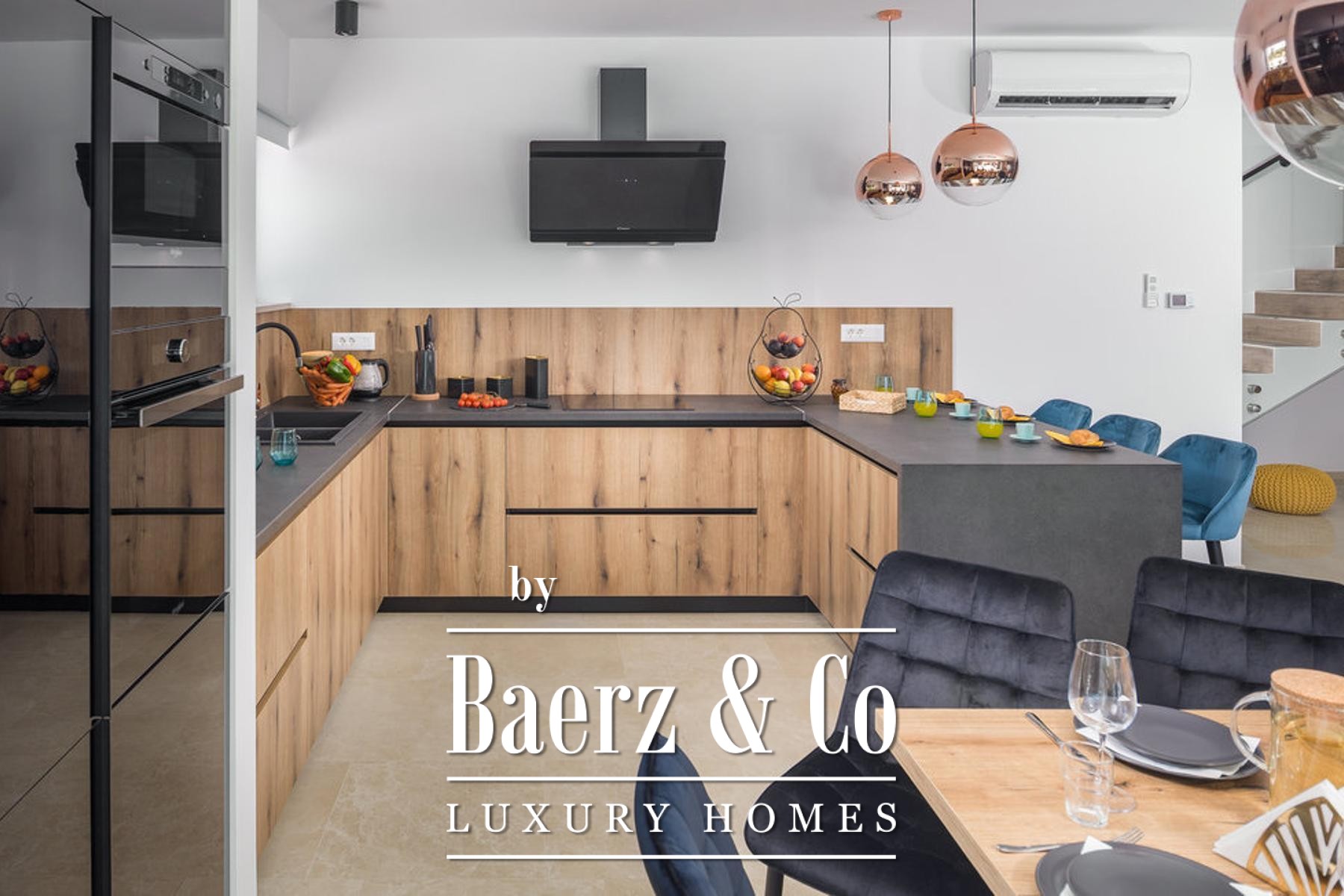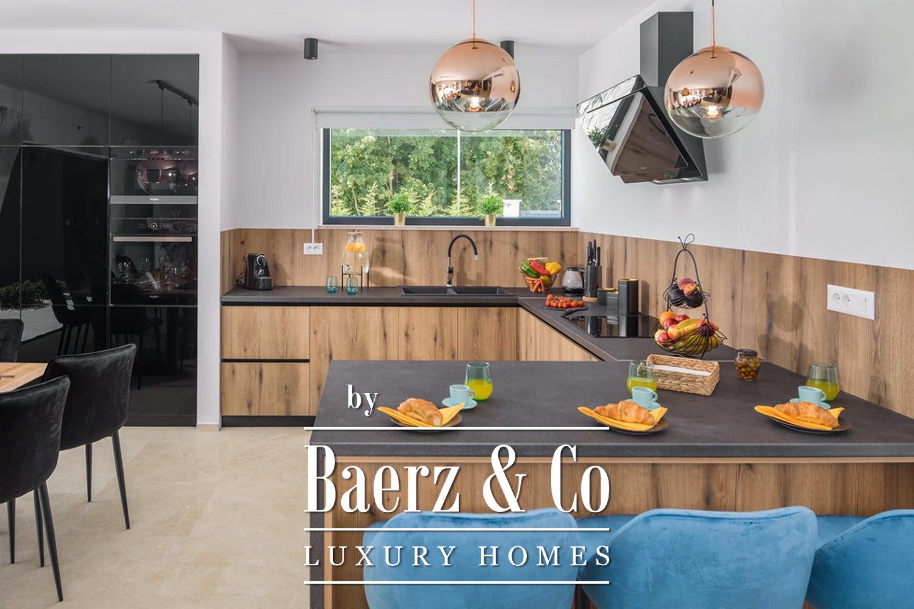 bathroom, and each room has direct access to its own terrace with a beautiful view of nature.On the plot there is a sunbathing area, a heated pool with a heat pump with a total size of 38.50 m2, and a covered area with a barbecue and a place to dine with your loved ones.The best materials and equipment were used for this property, high quality construction, aluminum joinery, underfloor heating system through a heat pump. All rooms are air-conditioned. First-class parquet and ceramics, all furniture is designer and of well-known brands.A first-class property that deserves attention.For more information or to arrange a viewing, please feel free to contact us.