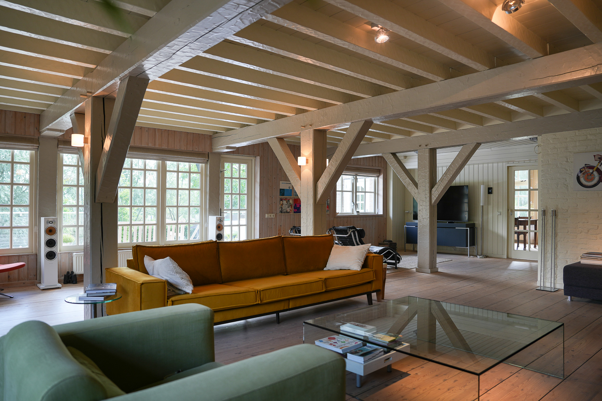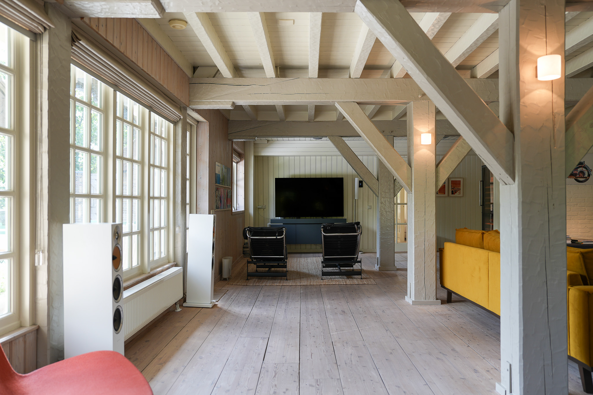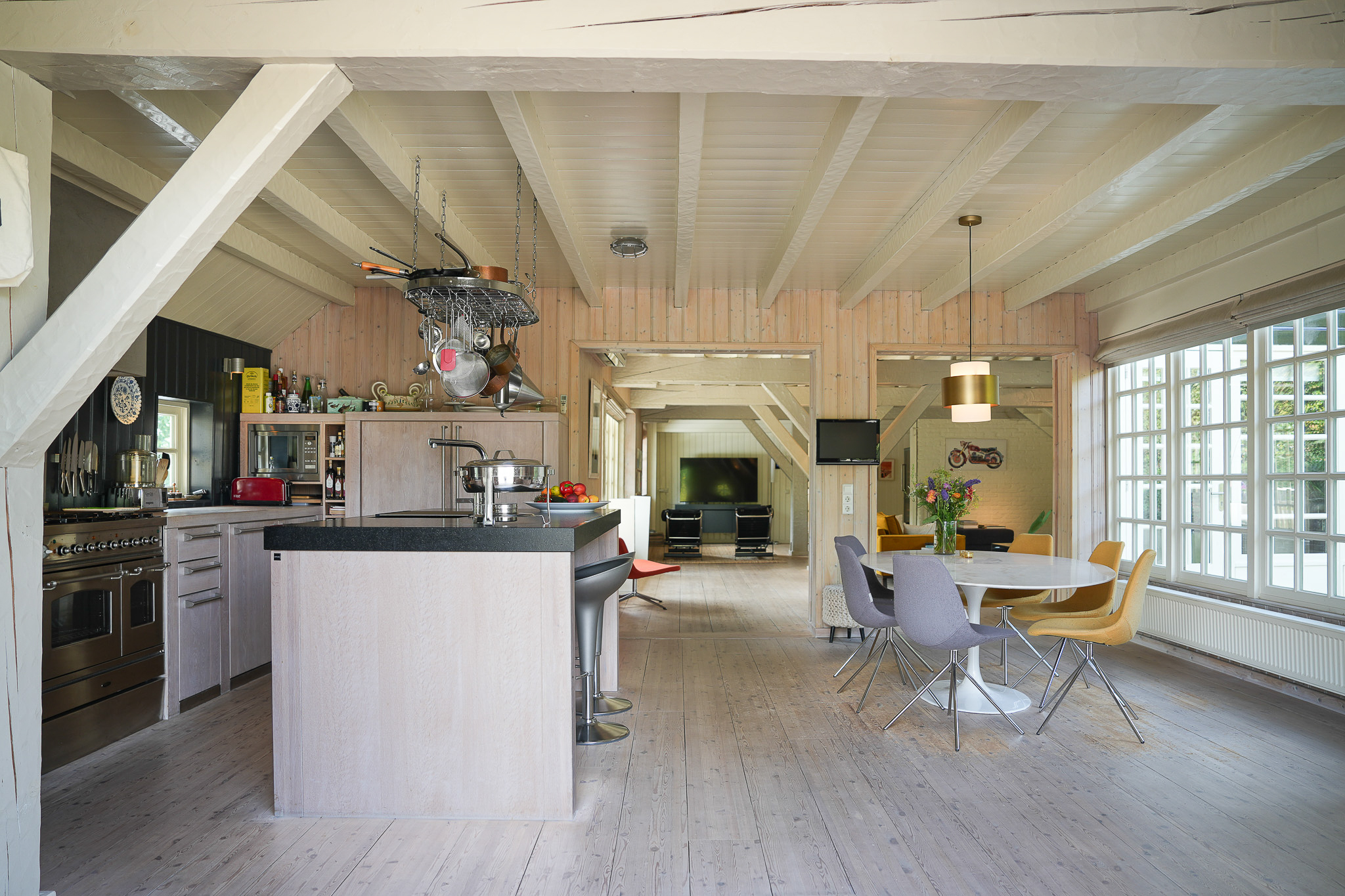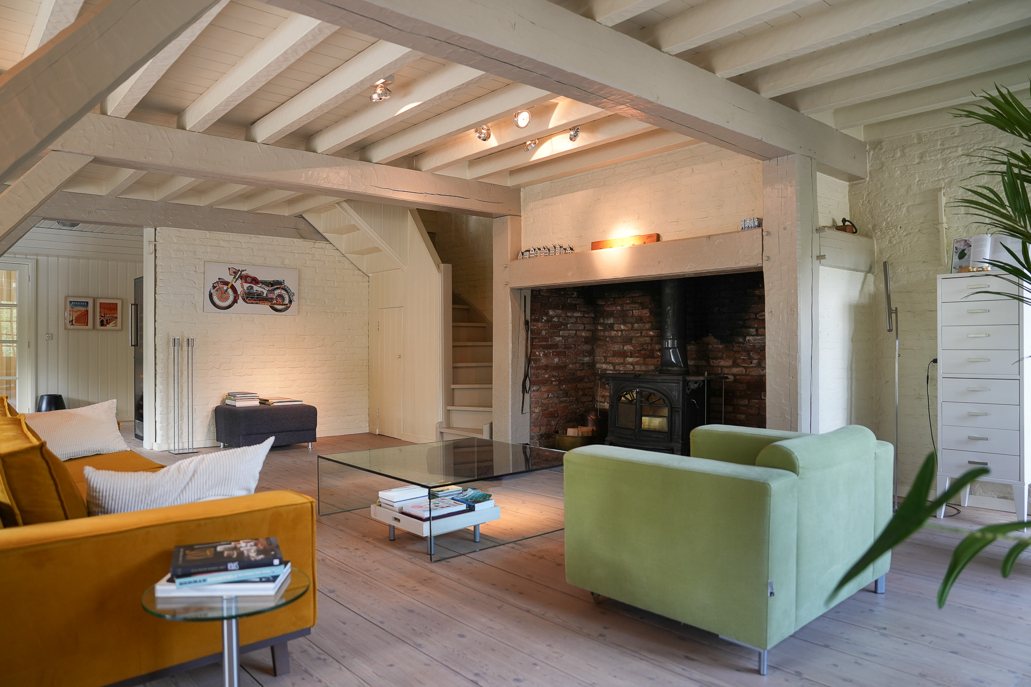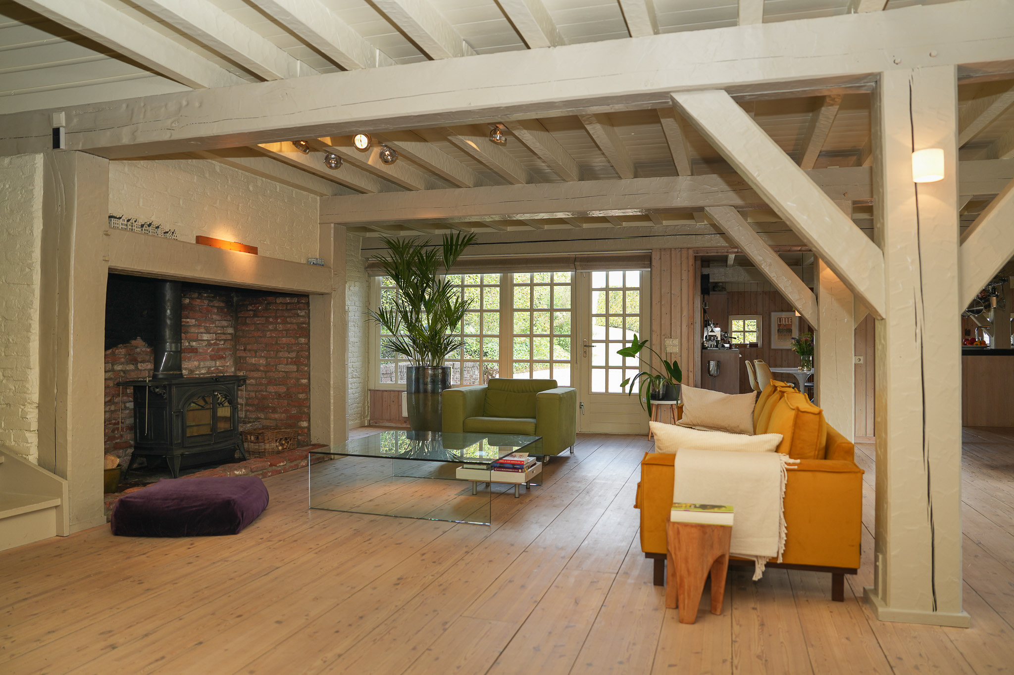 The entrance is located at the rear, by the elevated hardwood terrace. Through wide French doors with mullioned windows, you enter the impressive living space, where broad floorboards, a wood-fired stove, and large windows create a warm atmosphere.