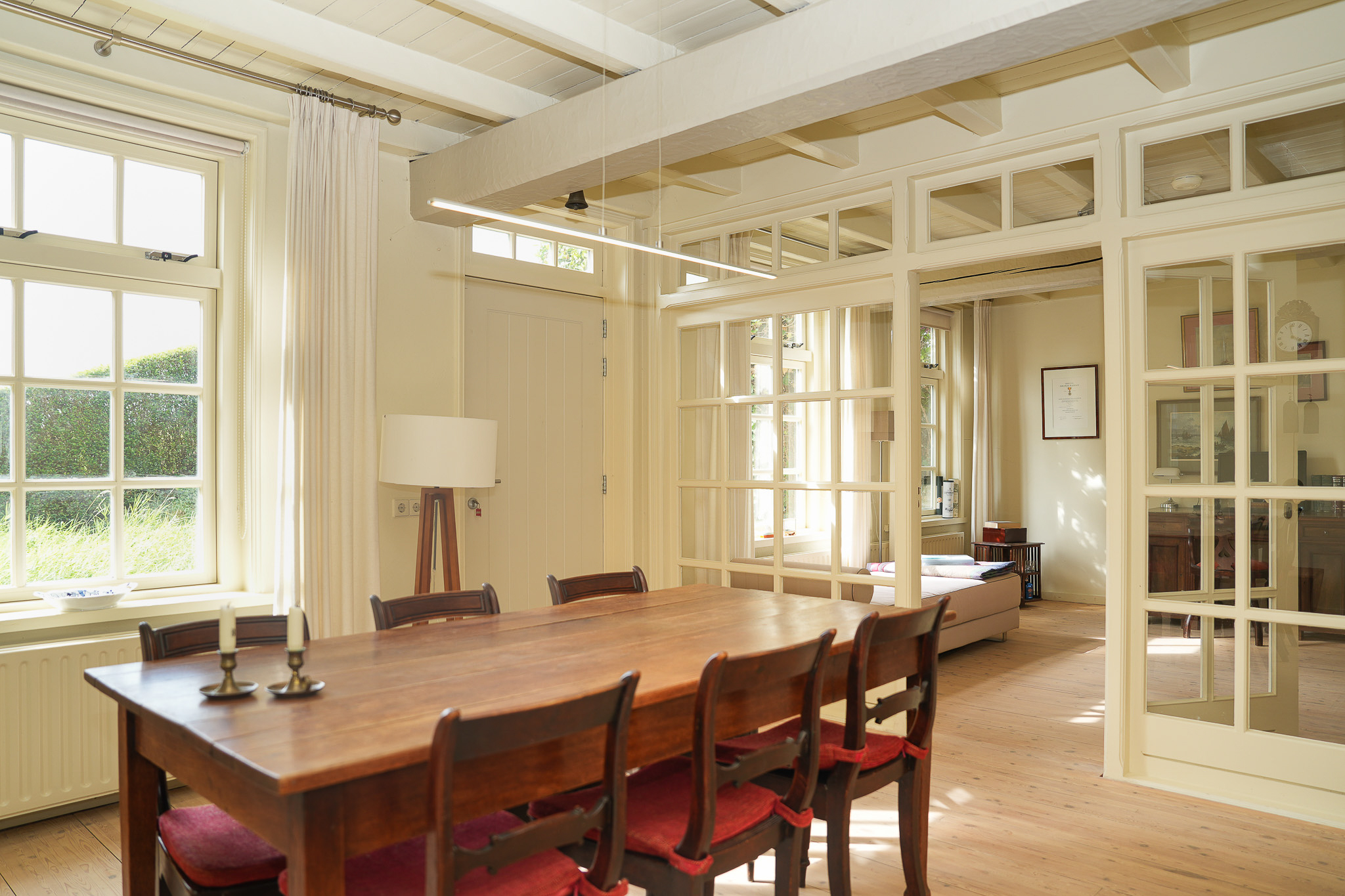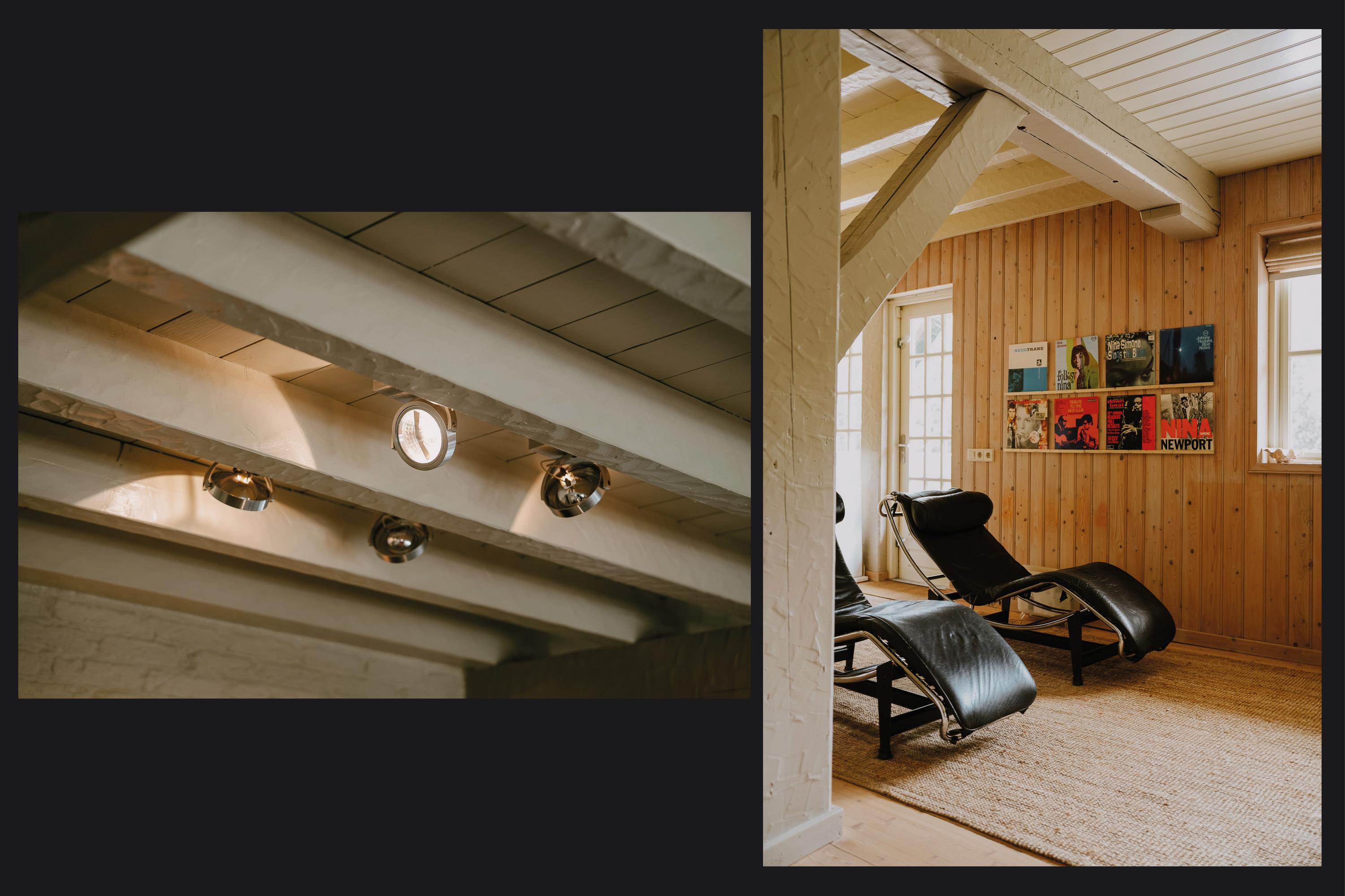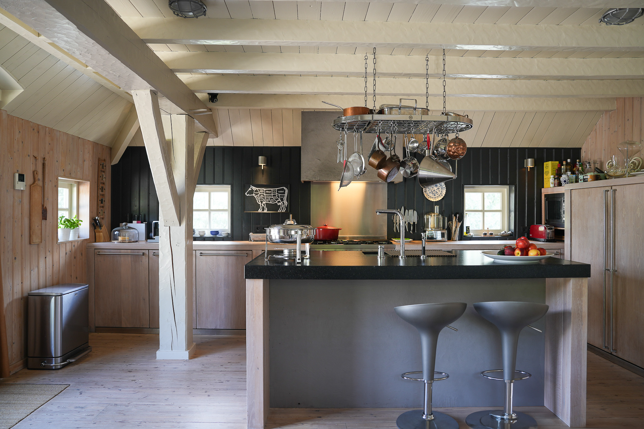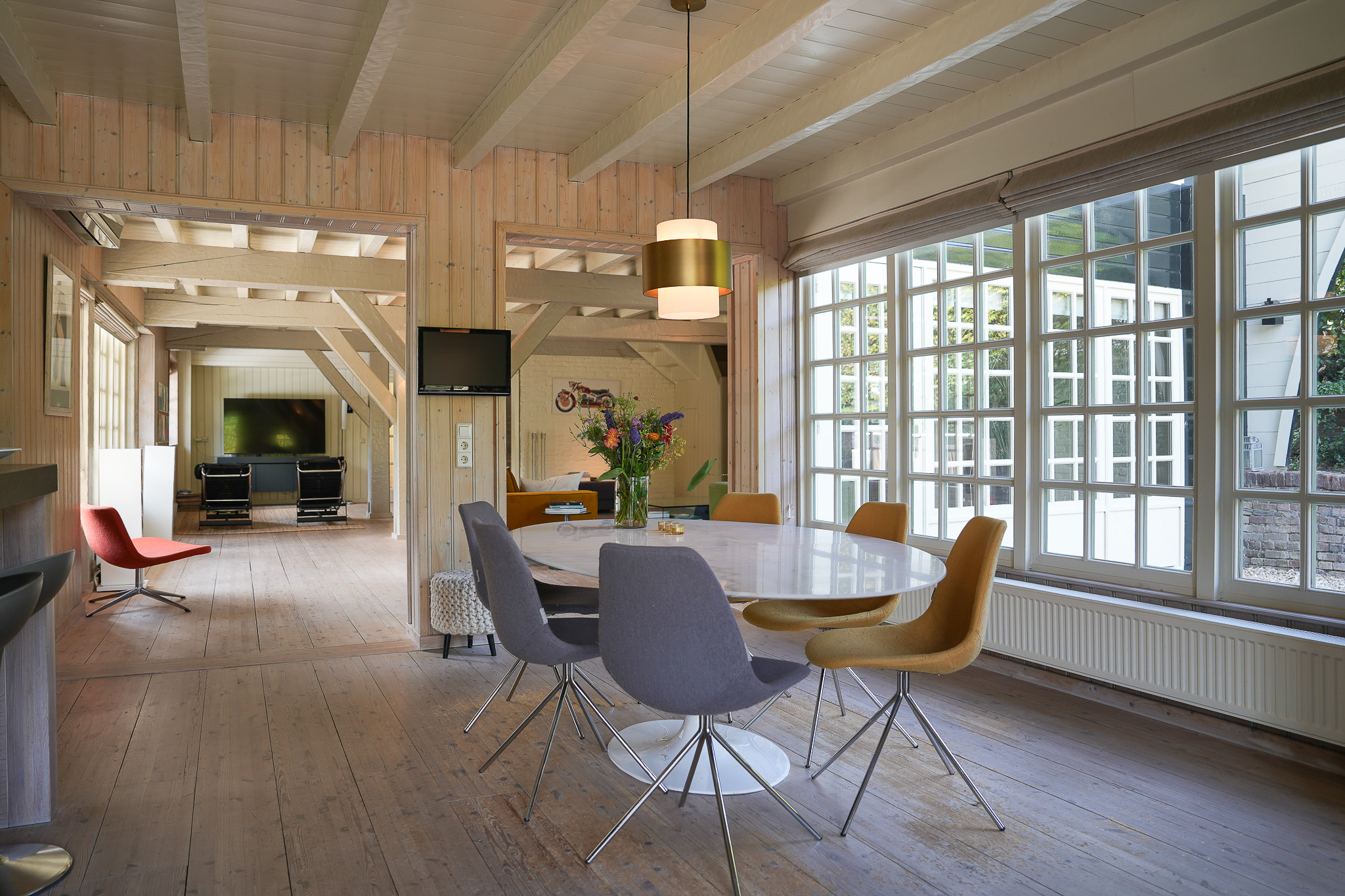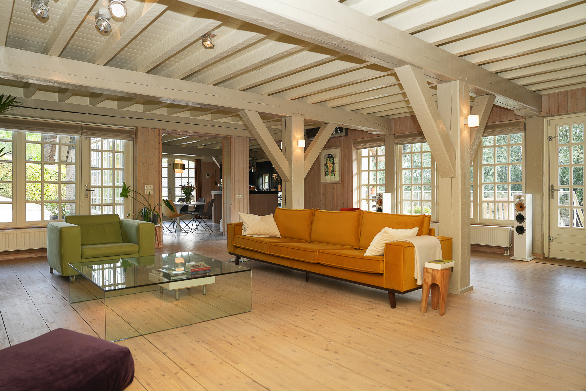 The entrance is located at the rear, by the elevated hardwood terrace. Through wide French doors with mullioned windows, you enter the impressive living space, where broad floorboards, a wood-fired stove, and large windows create a warm atmosphere.