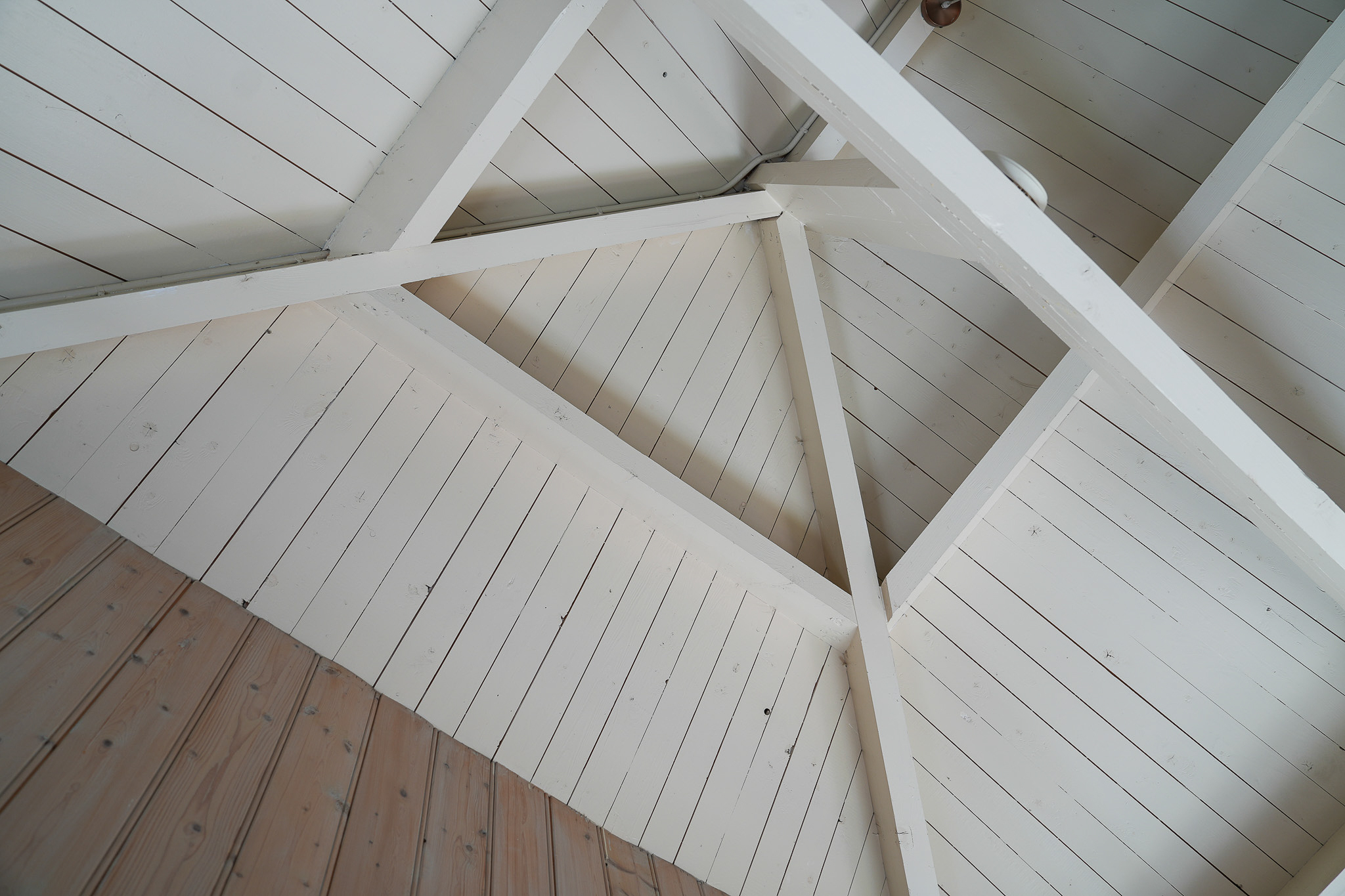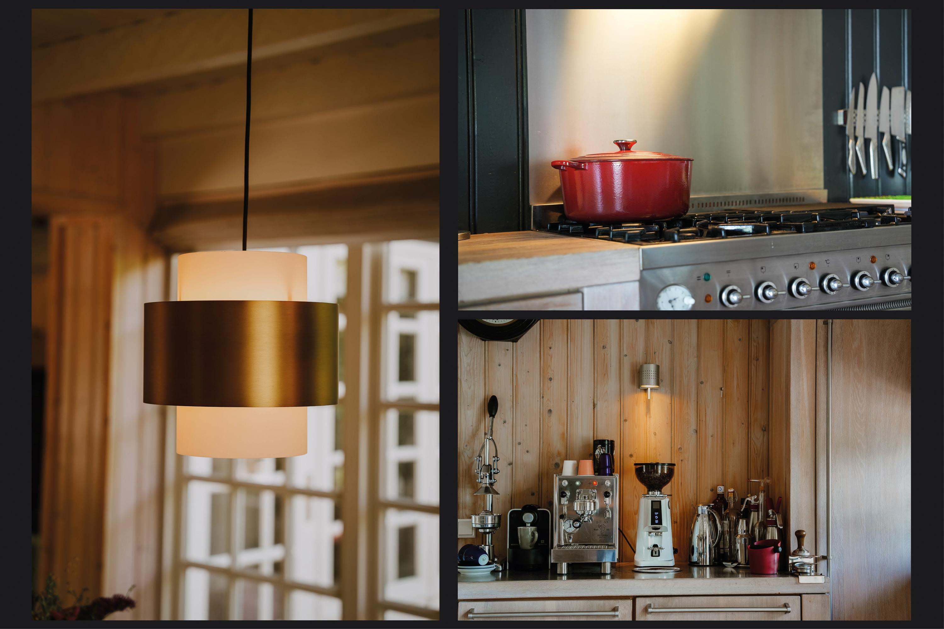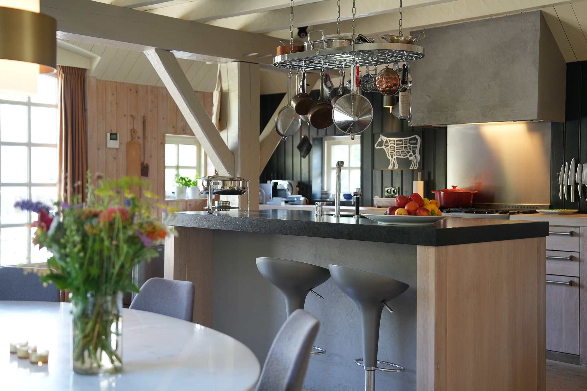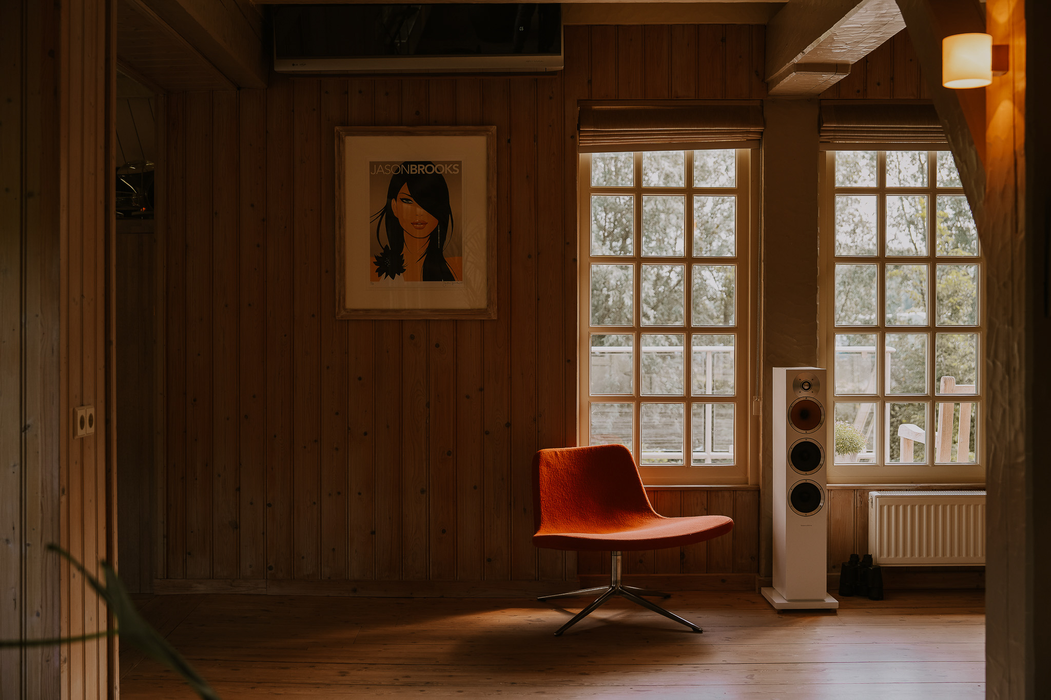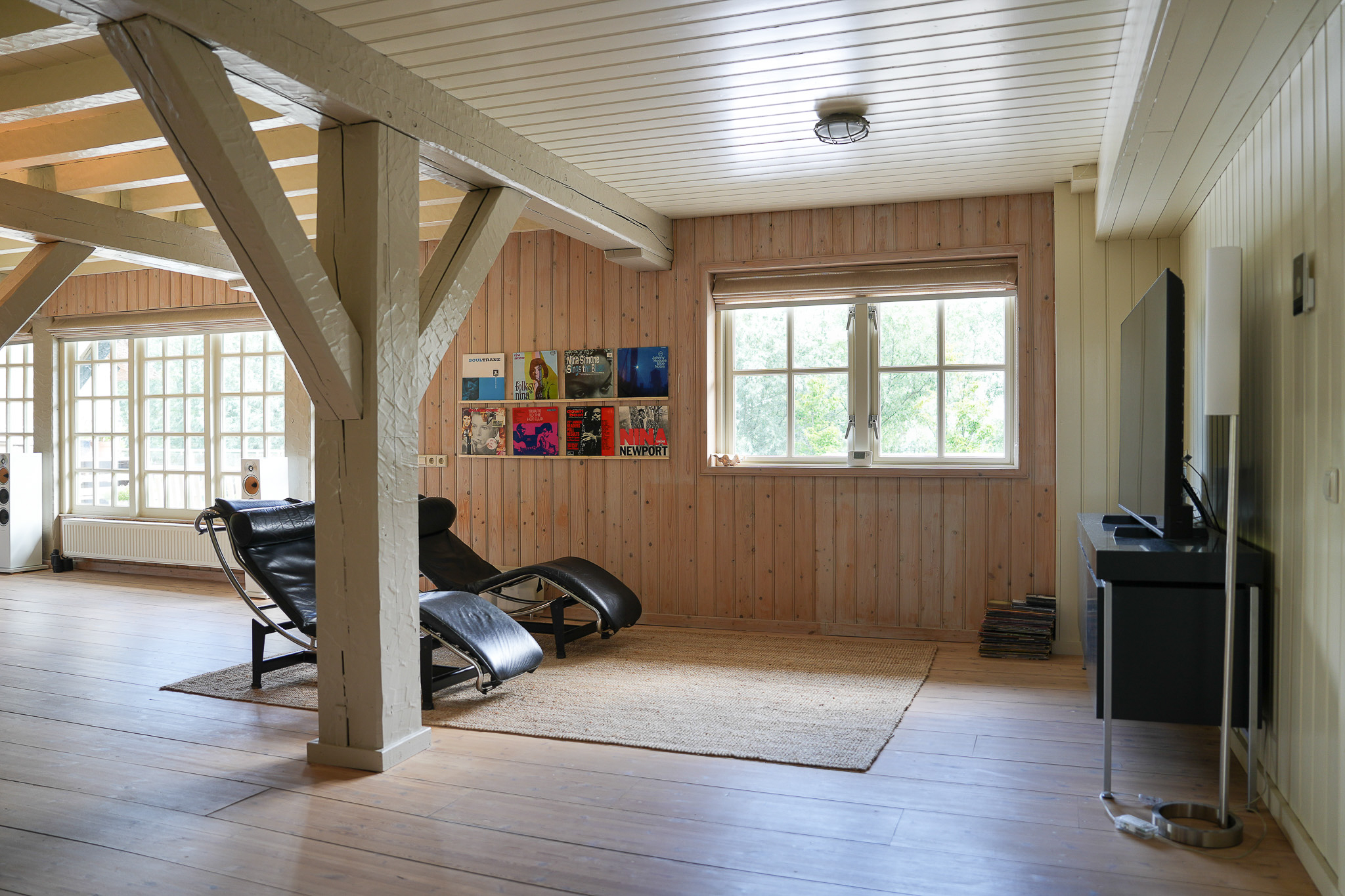 The entrance is located at the rear, by the elevated hardwood terrace. Through wide French doors with mullioned windows, you enter the impressive living space, where broad floorboards, a wood-fired stove, and large windows create a warm atmosphere.