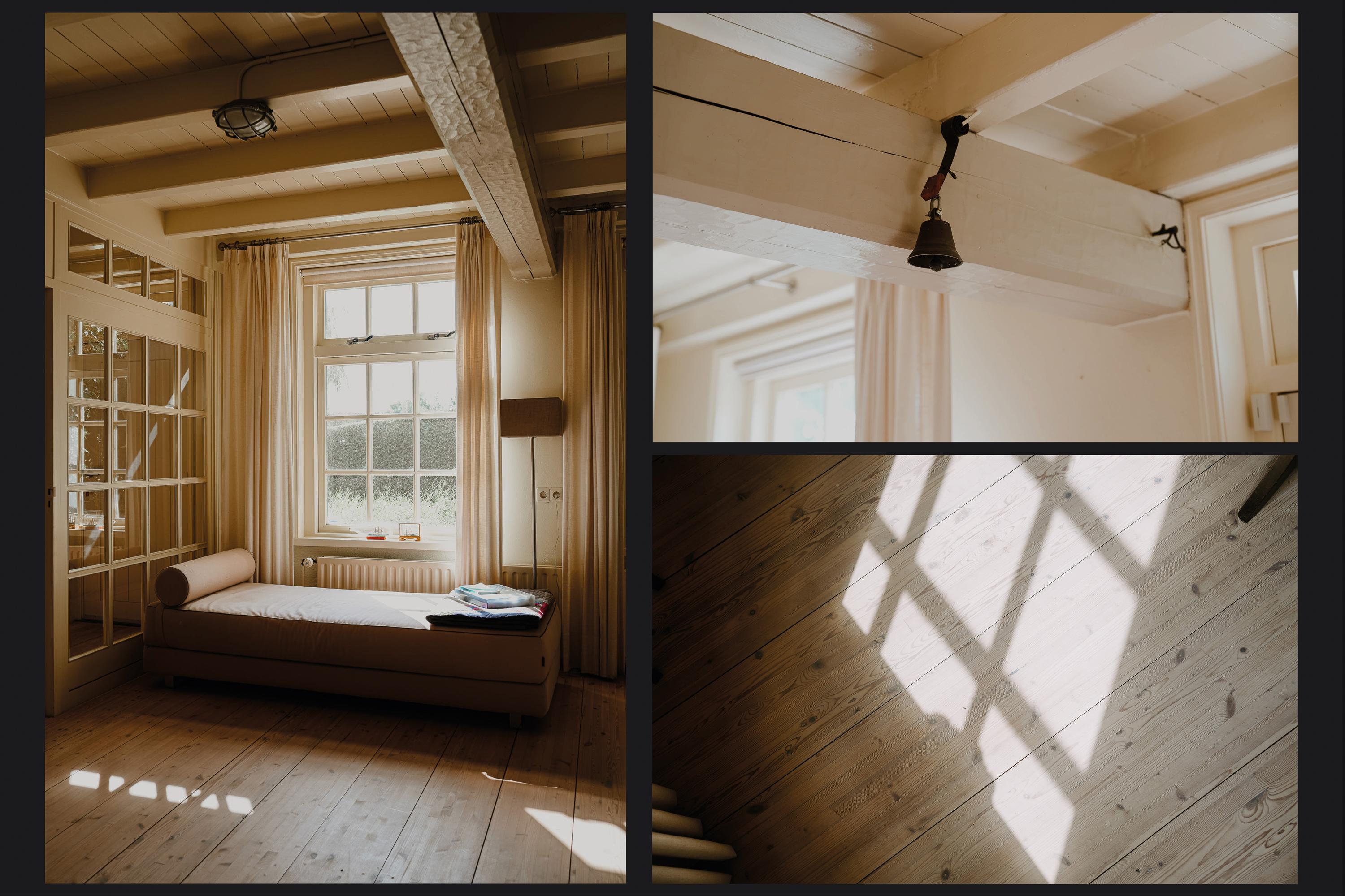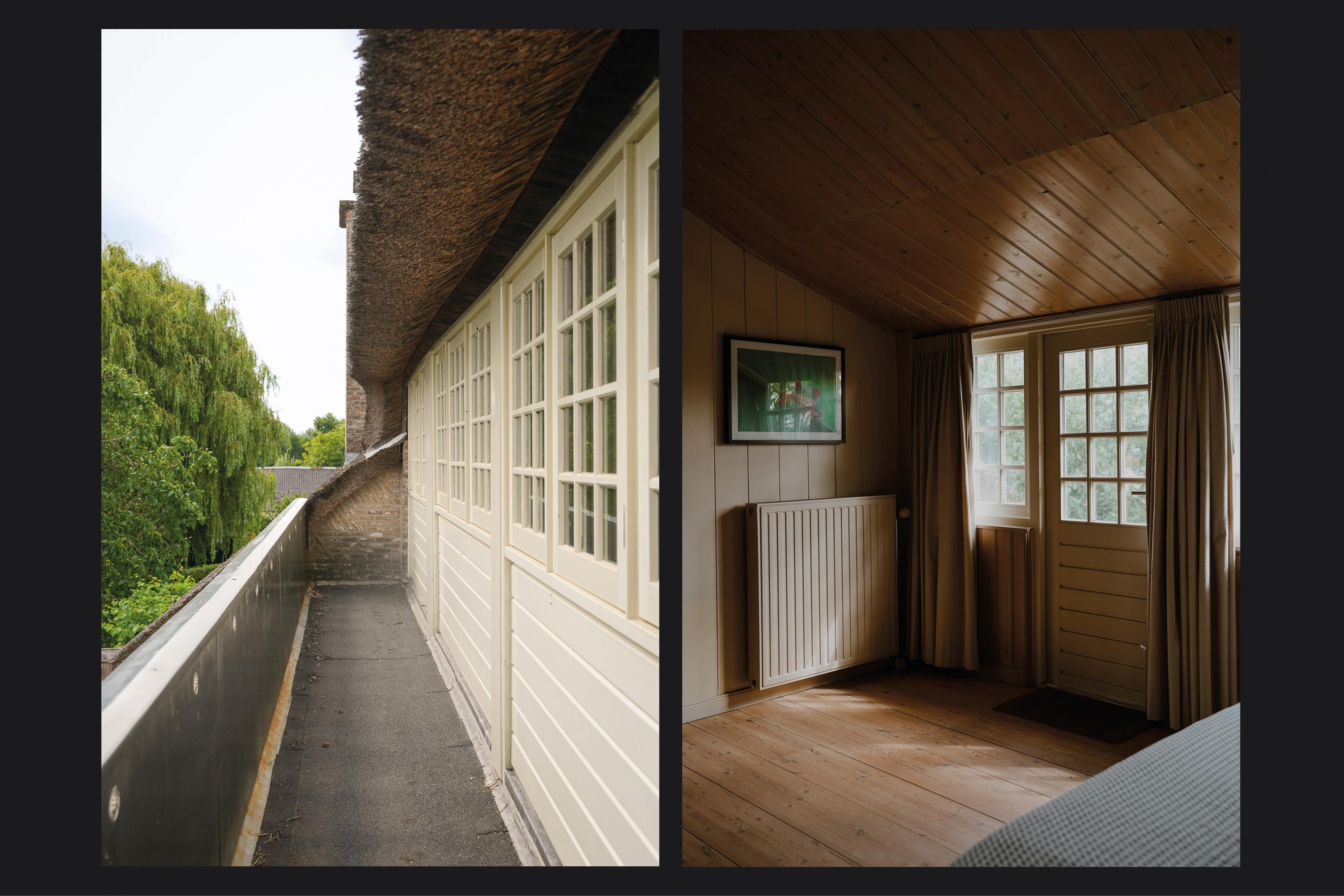 The two remaining bedrooms are playfully designed, with exposed roof beams and mullioned windows offering fine views of the surroundings. The bathroom, styled in line with the bedrooms, is fitted with a bathtub, shower cabin, and double washbasin.