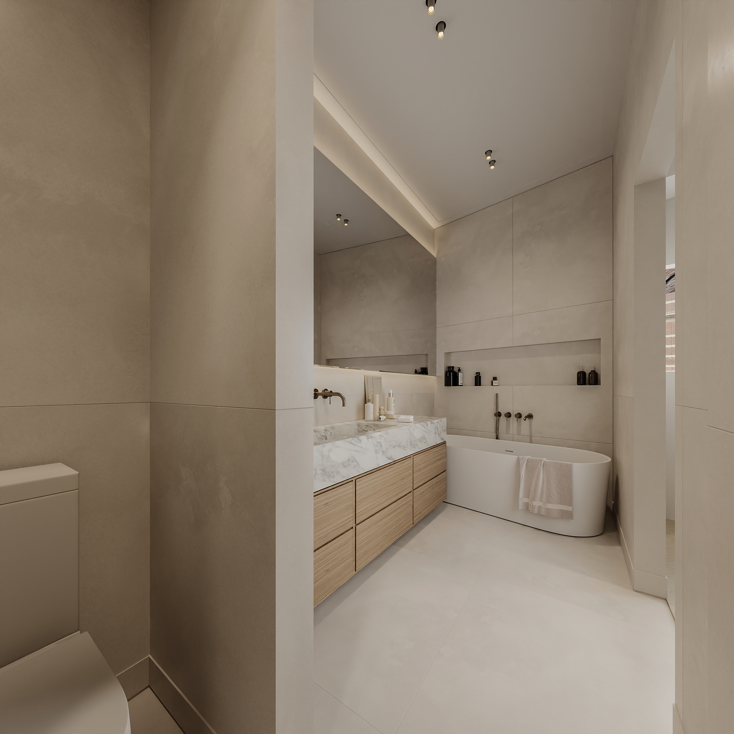 La planta sótano alberga tres dormitorios y dos sofisticados cuartos de baño, ambos con ducha a ras de suelo y lavabo doble; uno de ellos también con bañera. Un lavadero independiente y áreas de almacenaje diseñadas al detalle reflejan la funcionalidad del proyecto. Las dos plantas superiores del anexo cuentan con un baño y un dormitorio adicionales, facilitando la vida familiar y el entretenimiento.