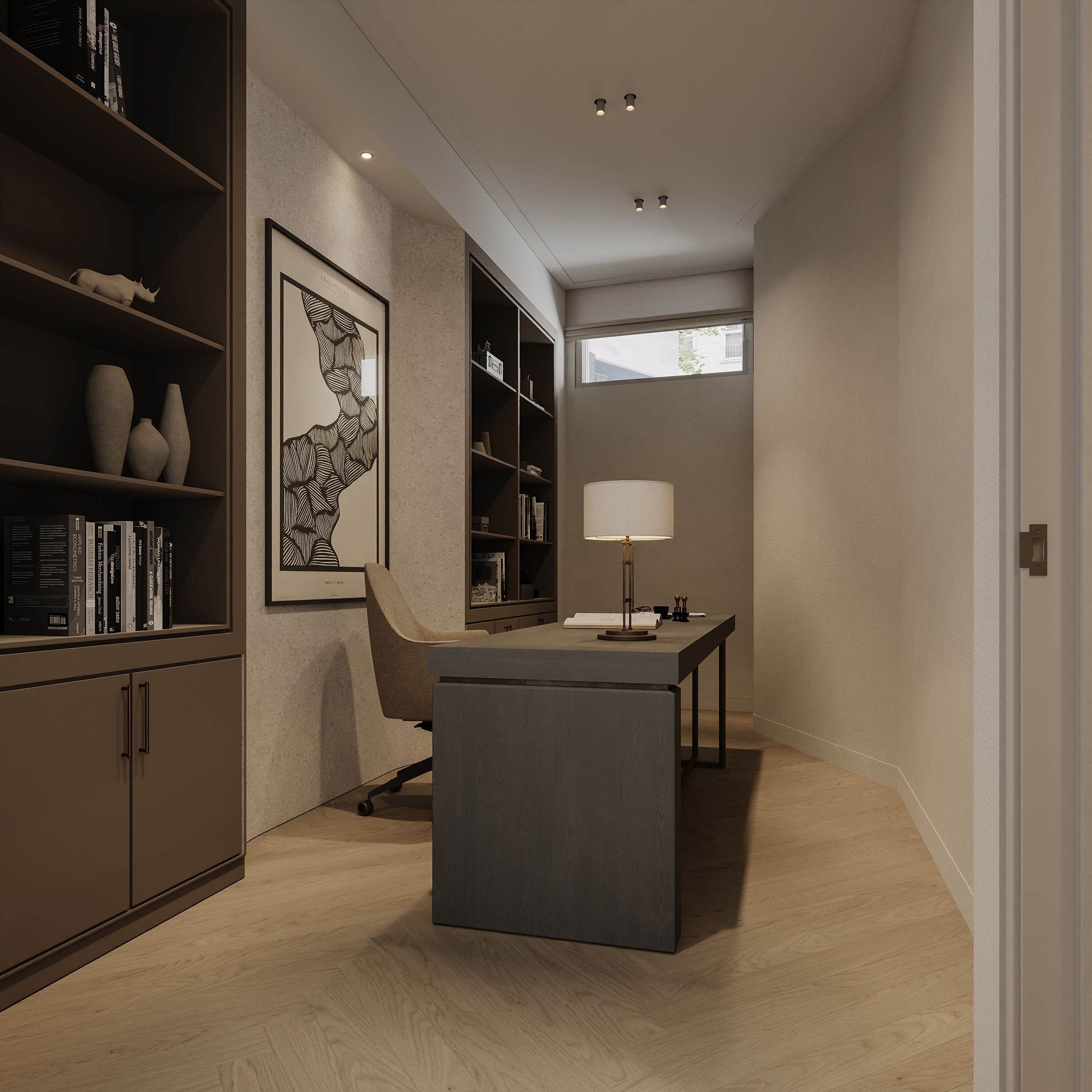 Al acceder por la planta principal, una amplia zona de estar se integra con el comedor, presidido por una moderna cocina abierta con una isla central destacada y electrodomésticos integrados de alta calidad. Unas puertas francesas se abren a un patio interior resguardado, que aporta serenidad frente al dinamismo de Ámsterdam. El salón trasero, que también permite acceso directo desde el jardín, dispone de una segunda cocina, ideal como suite de invitados, oficina o estudio.