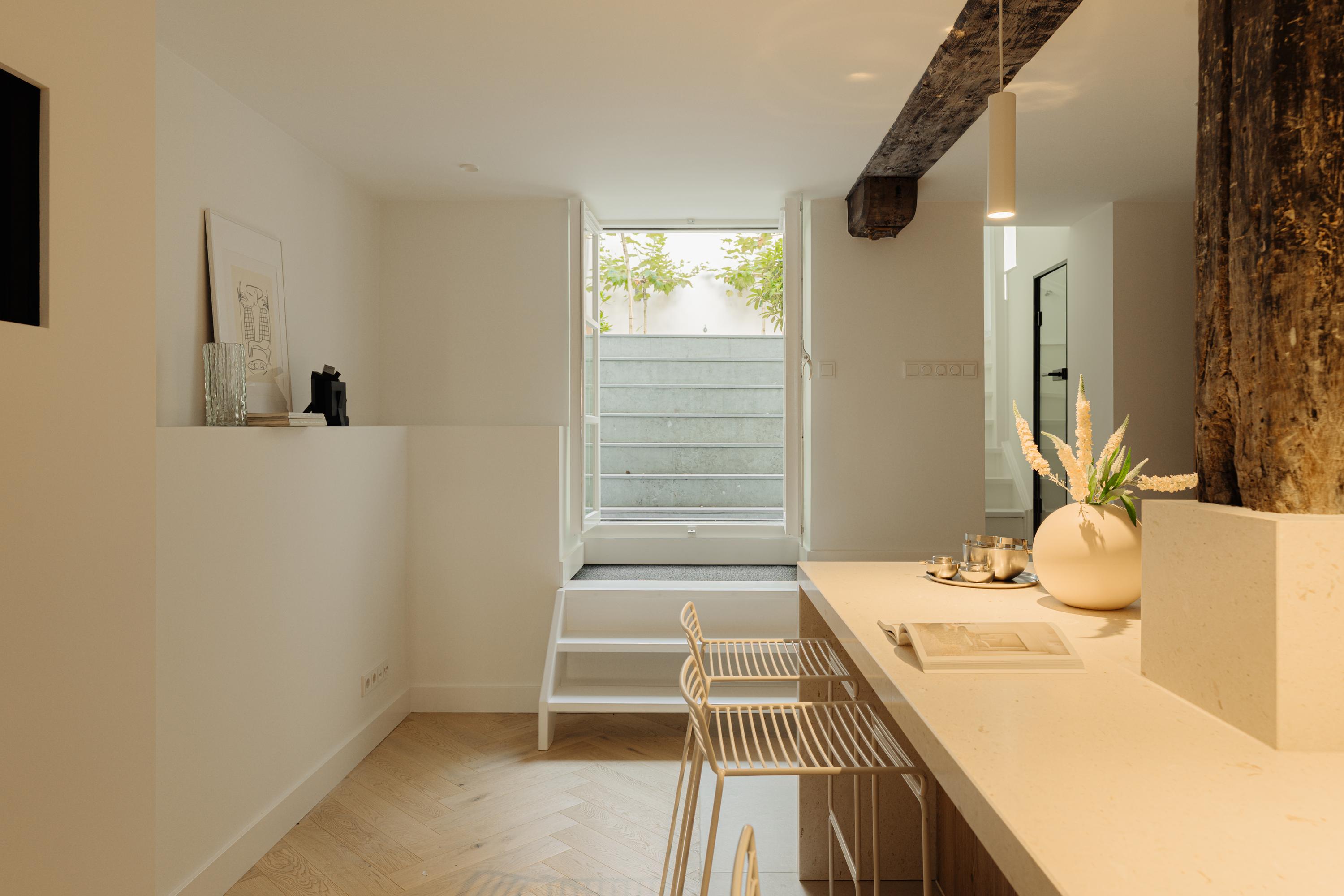 La planta semisótano alberga una cocina y comedor definidos por materiales naturales y mobiliario a medida, realzados con una chimenea y acceso al tranquilo jardín urbano. La funcionalidad y la elegancia se entrelazan en los electrodomésticos de alta gama, la isla de piedra natural y el suelo de roble en espiga. La planta baja elevada introduce un vestíbulo de mármol y un salón con techos superiores a 3,4 metros, vistas al canal y dos chimeneas, fusionando majestuosidad e intimidad de forma armoniosa.