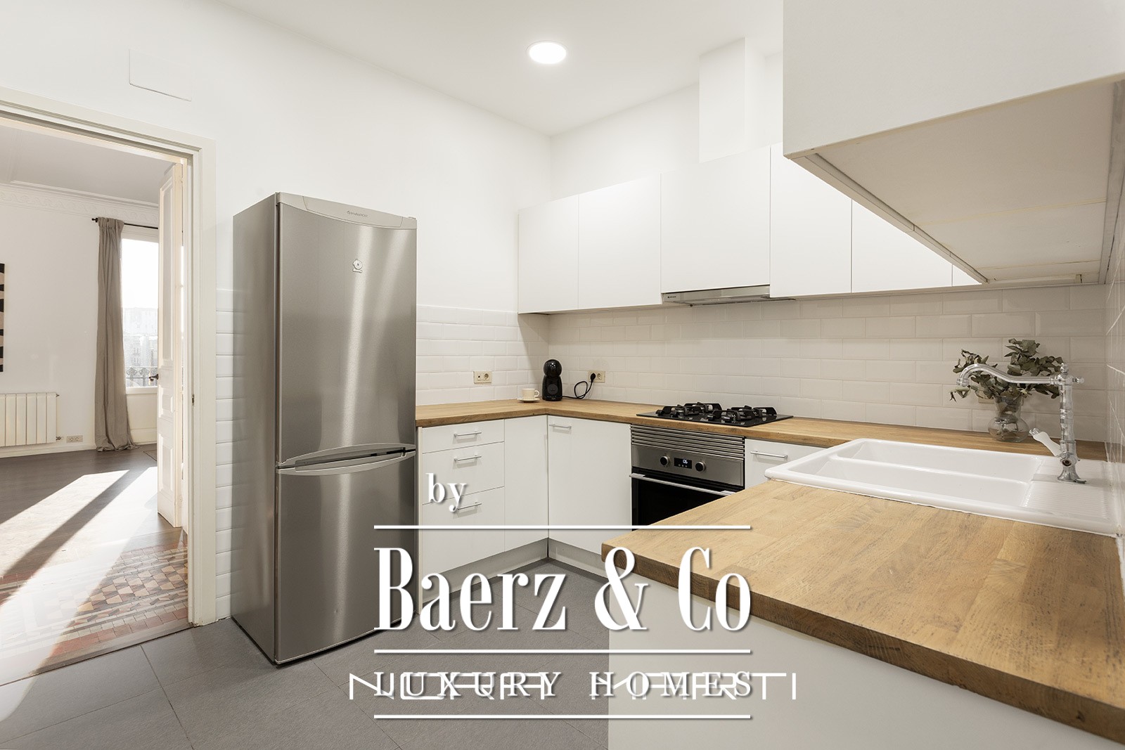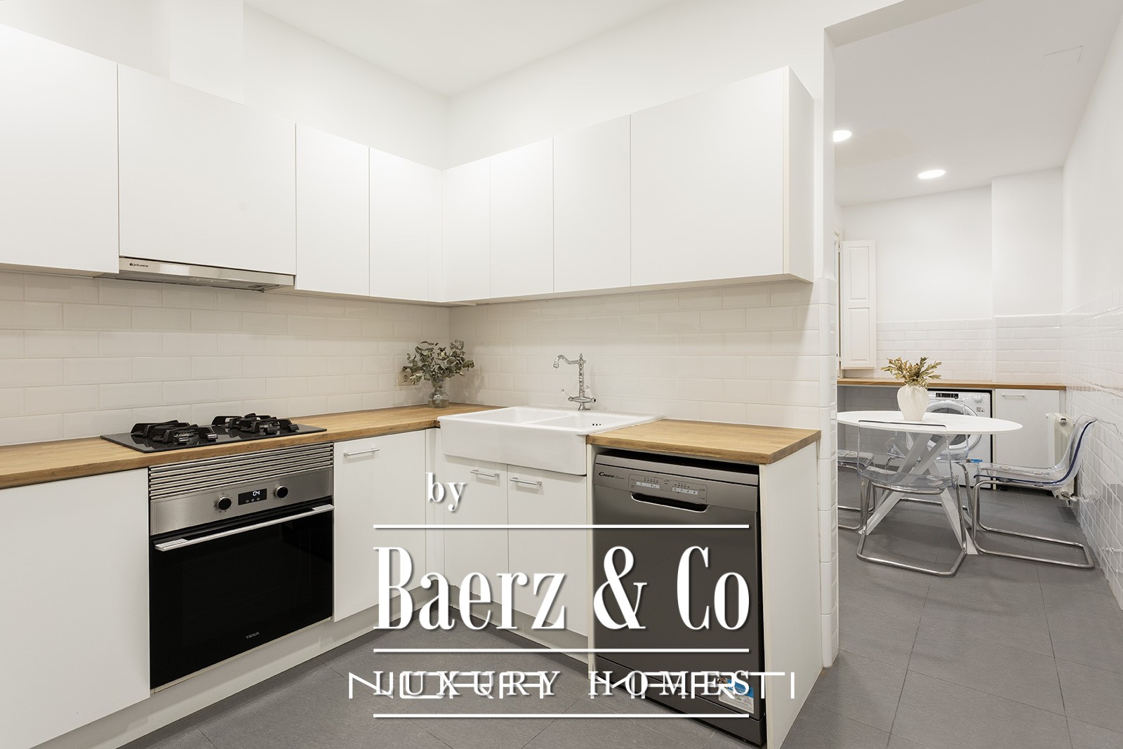 Con una superficie de 152 m², la vivienda ha sido completamente renovada, combinando sensibilidad contemporánea con una estructura histórica. En el interior, el mobiliario moderno y refinado aporta cohesión y claridad, marcando el tono para una vida urbana discreta. La distribución consta de tres dormitorios —uno doble y dos individuales—, así como dos baños, garantizando el equilibrio entre zonas privadas y sociales. Los grandes ventanales del salón, característicos de su época, inundan el espacio de luz natural, realzada por la favorable orientación y el calor del suelo de parquet. La cocina, completamente equipada y con espacio para desayunar, añade comodidad al día a día.