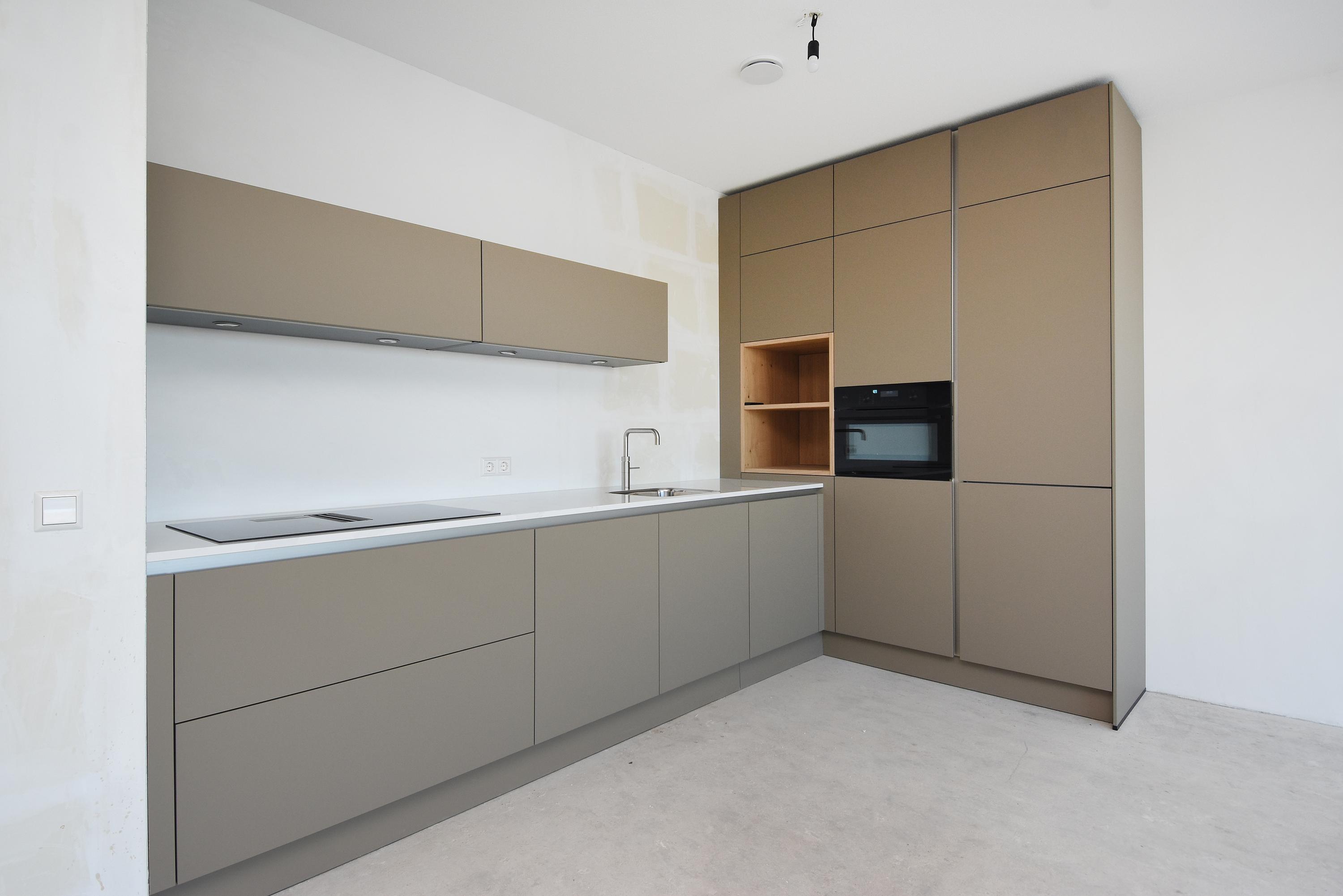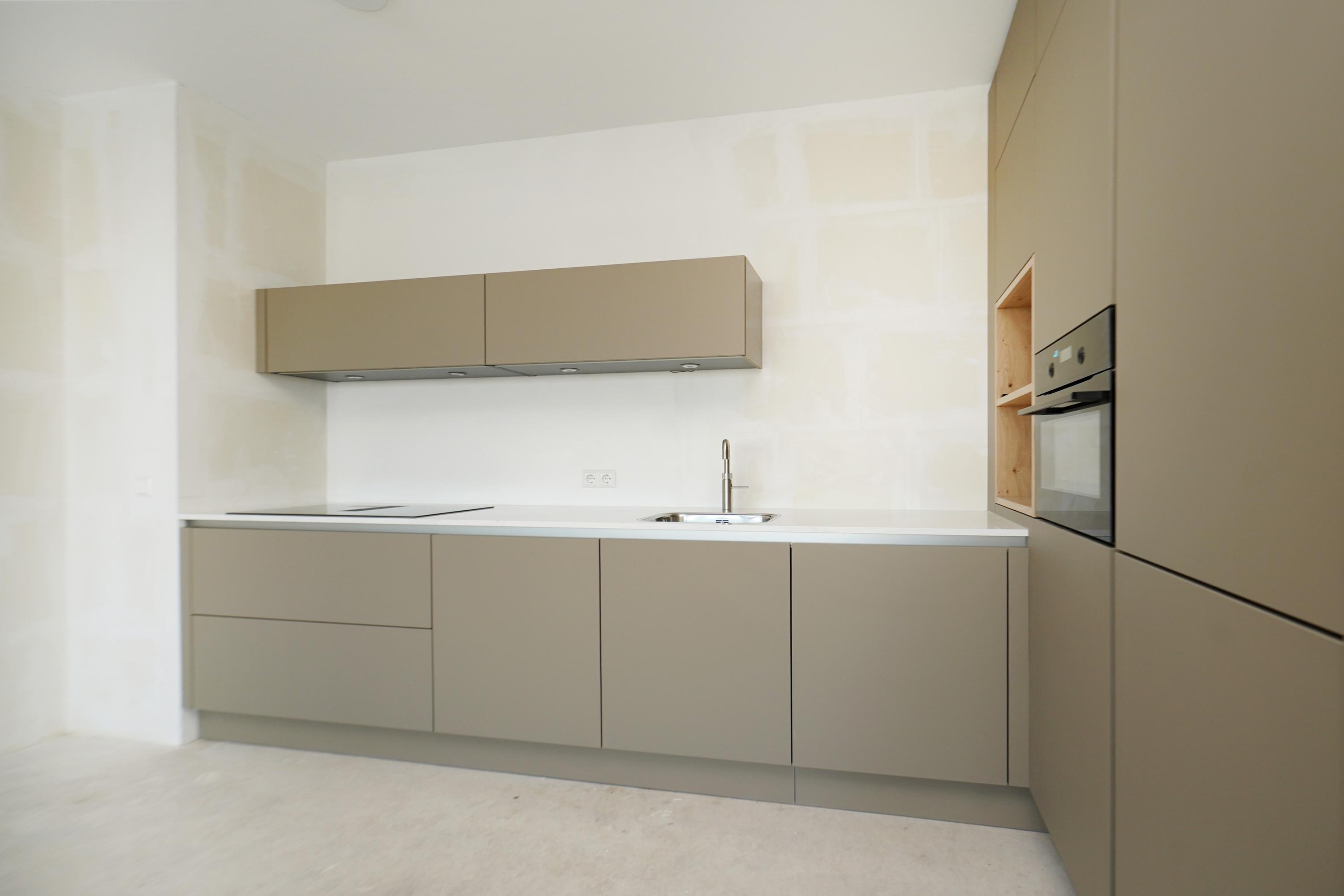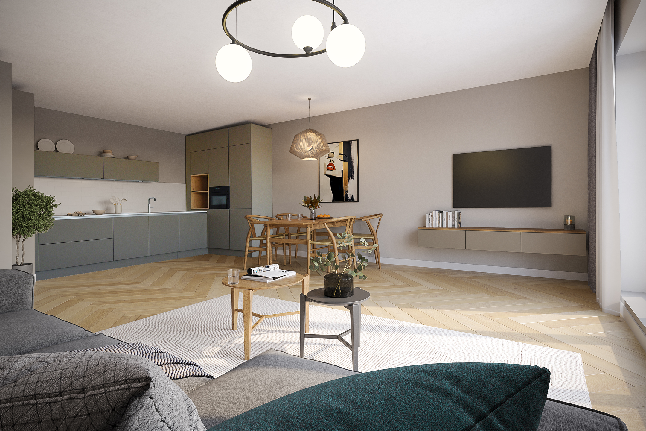 Le séjour ouvert s’articule autour d’une cuisine NEXT-125 avec plan de travail en composite et électroménager intégré, comprenant un robinet Quooker, une plaque à induction avec ventilation intégrée et un four combiné. Un système de chauffage et de rafraîchissement par le sol s’étend dans tout l’appartement, atteignant l’efficacité du label énergétique A+++. Toutes les pièces, à l’exception de l’espace technique, baignent dans le confort. À l’arrière, le balcon exposé plein sud offre des moments de calme avec vue sur une cour commune, accessible depuis les deux chambres.