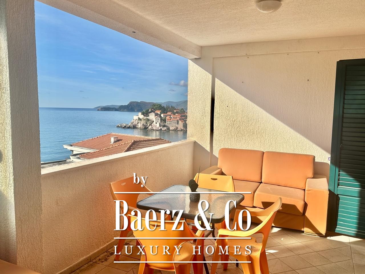 L’appartement duplex Sveti Stefan vous accueille avec une alliance rare de panoramas sur la mer et les montagnes, à une proximité privilégiée de l’Adriatique. Cette résidence de 142 m² occupe le troisième étage d’un immeuble de trois niveaux, à seulement 50 mètres du rivage et à quelques pas du célèbre parc Milocer et de la plage de la Reine. Relié de manière fluide à la route principale, l’emplacement offre un équilibre paisible entre la nature et la facilité d’accès.