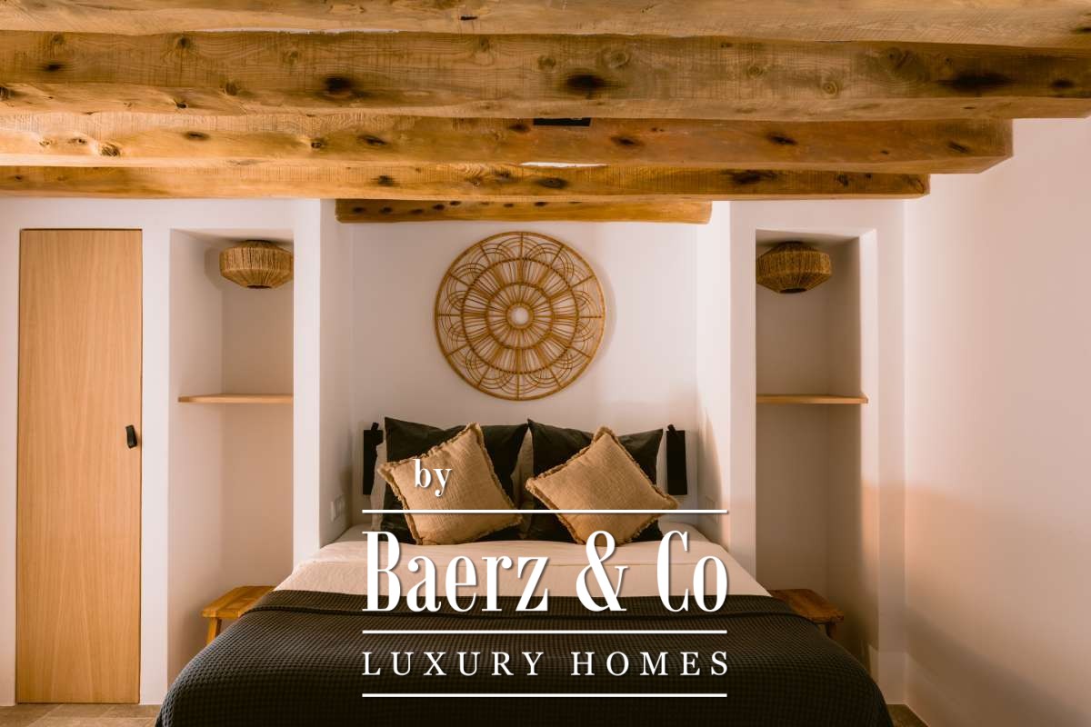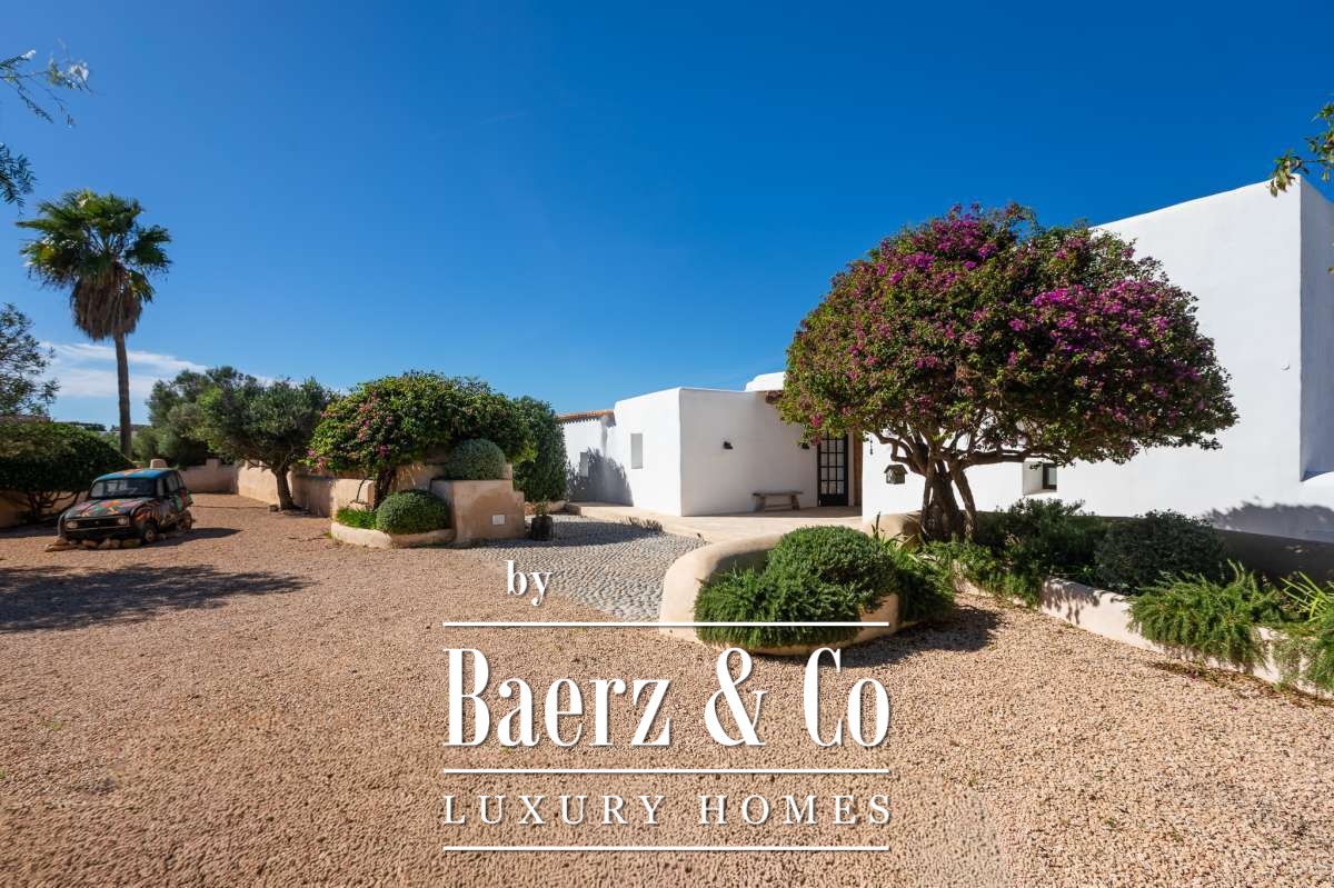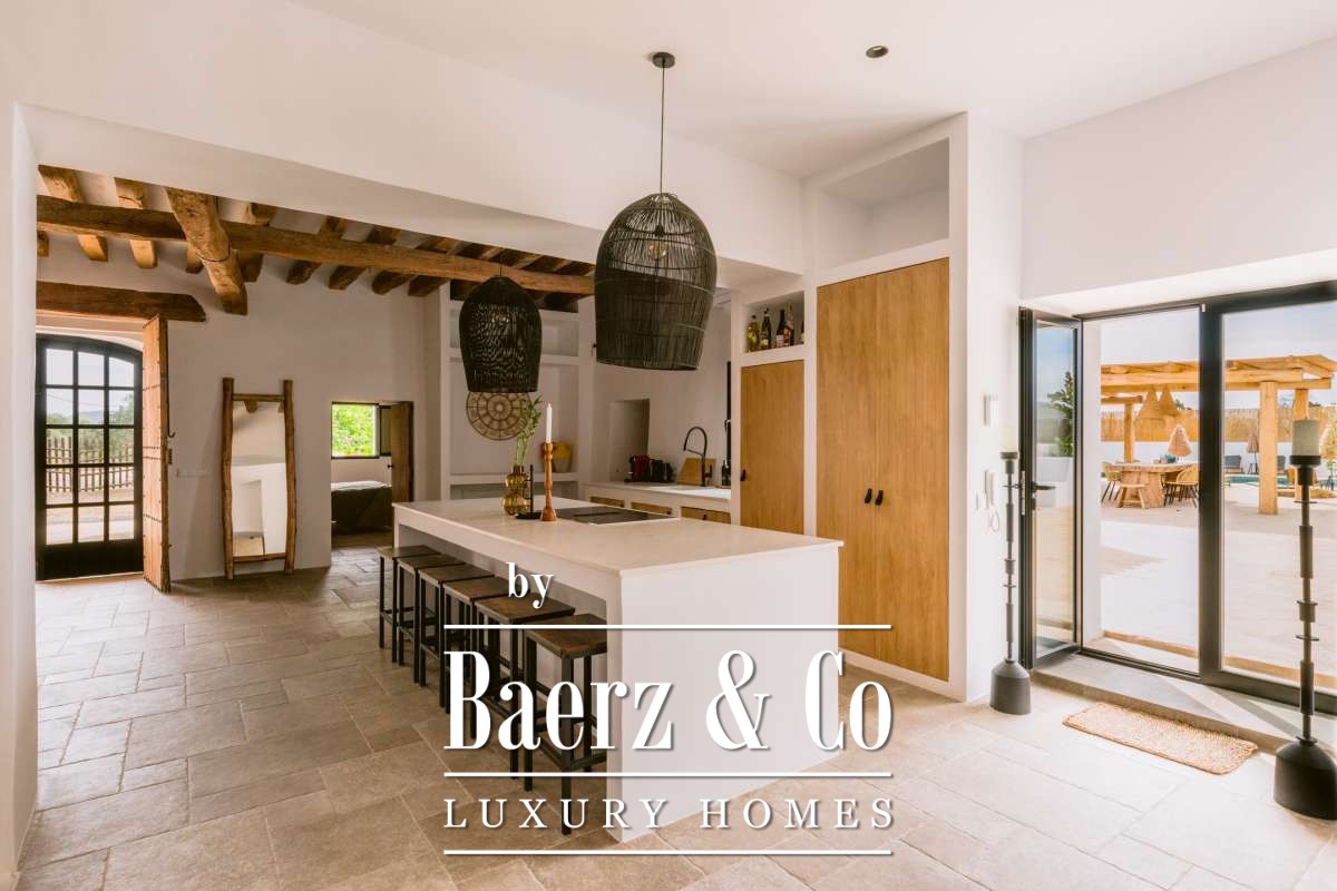Entièrement rénovée en 2023, la résidence principale s'étend sur 440 m² dans un esprit bohème chic raffiné. L’entrée ouvre sur un espace salon et salle à manger décloisonné, réparti sur plusieurs niveaux et mariant design contemporain et authenticité ibicenca. La cuisine design est équipée d’appareils modernes, tandis que chacune des cinq chambres est dotée de sa propre salle de bains et que la suite parentale bénéficie d’une baignoire privative. La maison d’amis indépendante, située à 50 mètres de la demeure principale pour préserver la discrétion, propose deux chambres supplémentaires, une salle de bains partagée et un espace de vie lumineux, adaptable pour les invités ou les séjours prolongés.