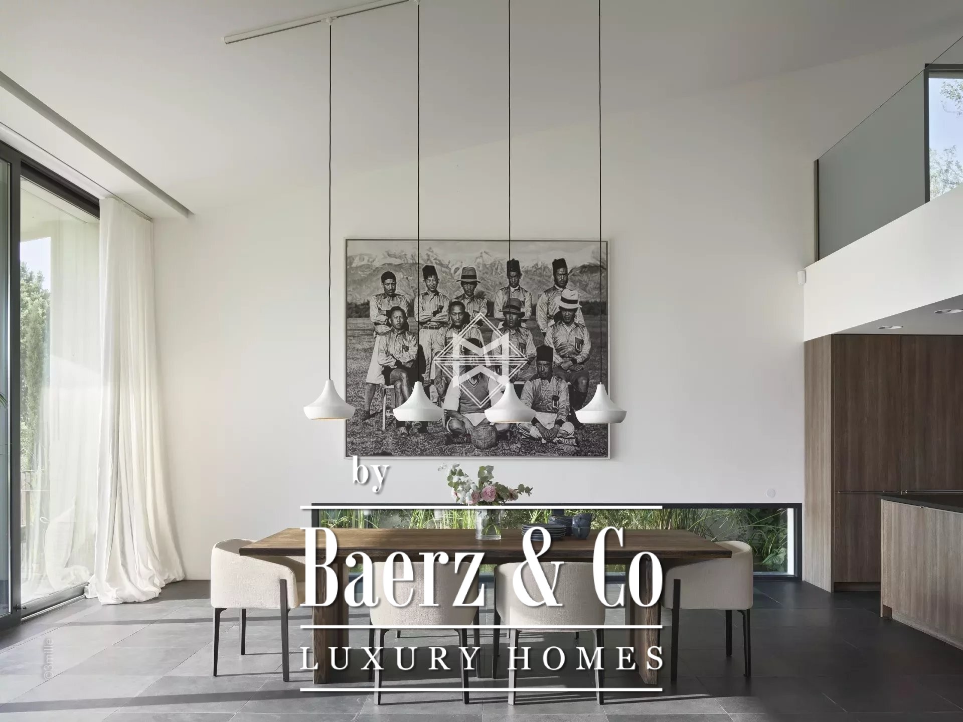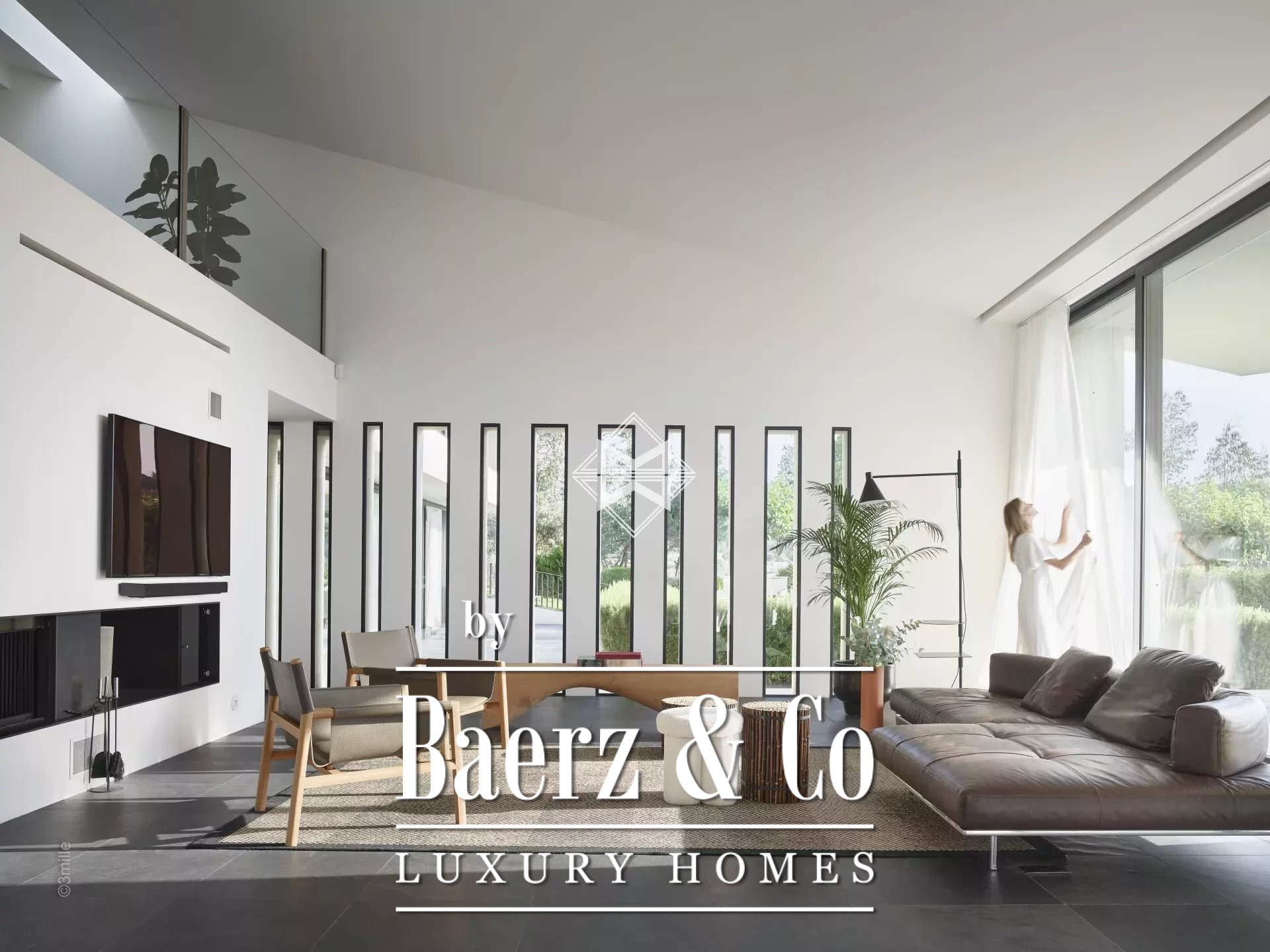 Les hauteurs de la villa révèlent une vaste terrasse engazonnée ainsi qu’une piscine spectaculaire de 36 mètres, cadre idéal pour des réceptions et événements privés. Plus bas, oliviers, pins et arbres fruitiers ponctuent le paysage et diffusent leurs senteurs au gré des saisons. À l’intérieur, les généreux volumes de réception s’ouvrent par de larges baies vitrées, laissant entrer la lumière et encadrant le panorama naturel. Une mezzanine lumineuse propose un espace bureau et lecture, à la fois retiré et connecté aux espaces de vie principaux.