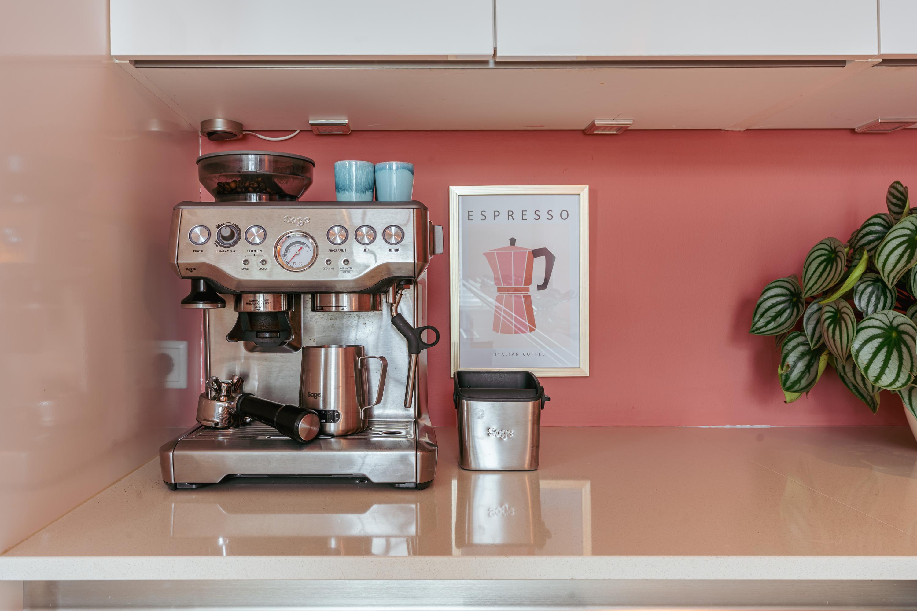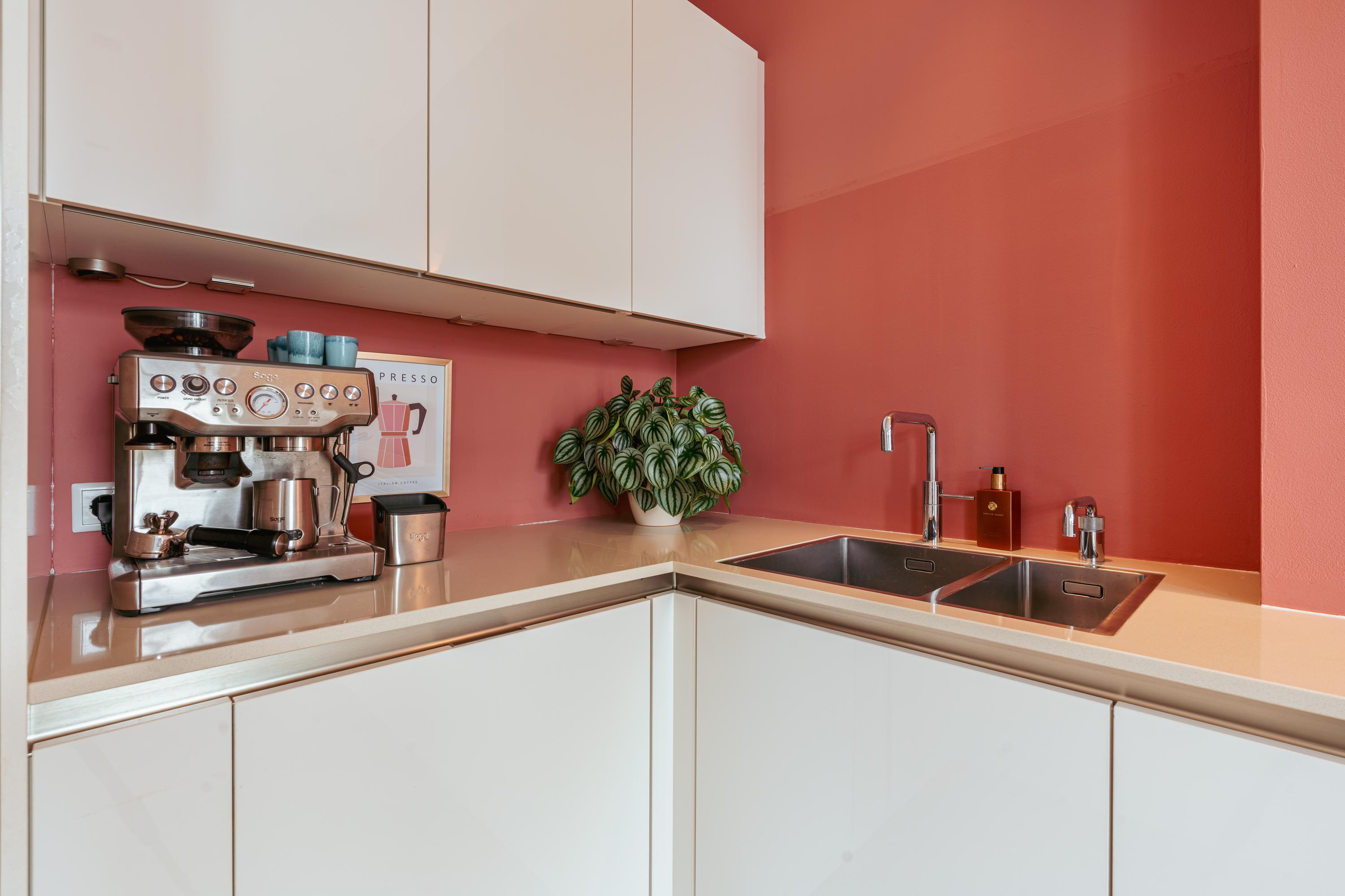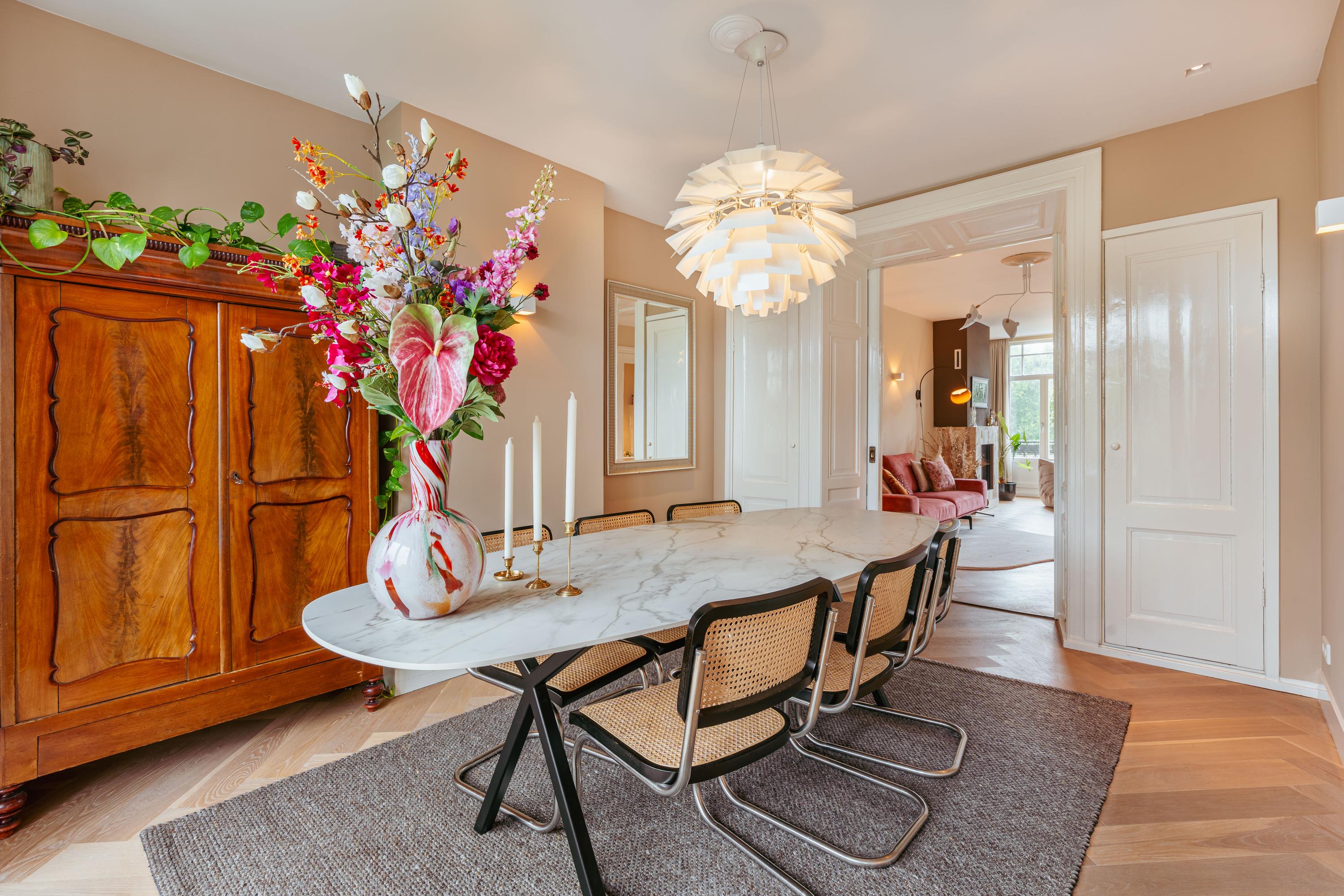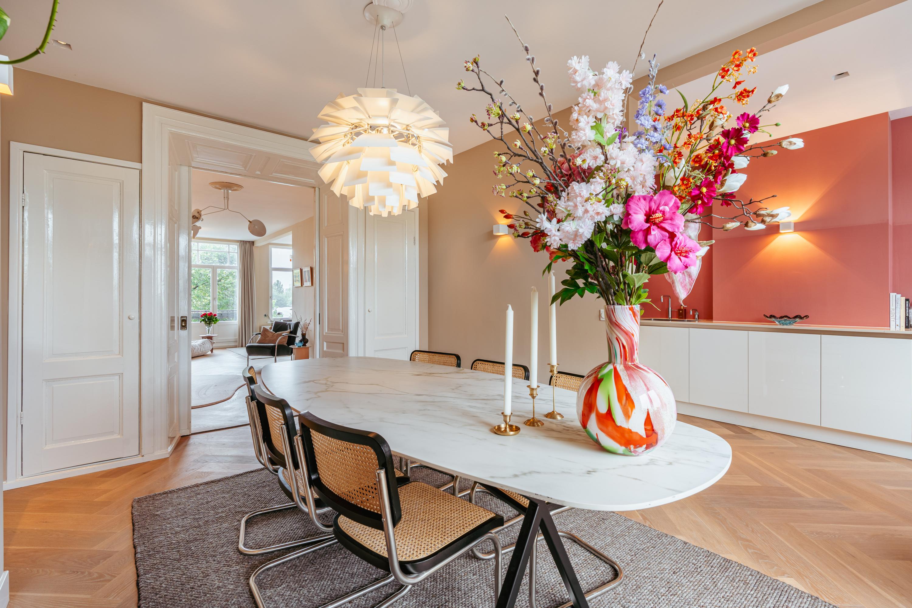 Via de originele, houten en-suite deuren bereikt u de eetkamer aan de achterzijde, waar u toegang heeft tot een tweede balkon waar u al vanaf 07:30 uur in de ochtend van de zon kan genieten. Aangrenzend ligt de moderne keuken, uitgevoerd in een frisse kleurstelling met strakke witte kasten en een royaal werkblad. De keuken is voorzien van alle gewenste inbouwapparatuur, waaronder een Quooker, combi-oven, vaatwasser, vijfpits-gasfornuis, koel-/vriescombinatie en een dubbele spoelbak. Een ideale plek voor kookliefhebbers en mensen die houden van gezellig tafelen.