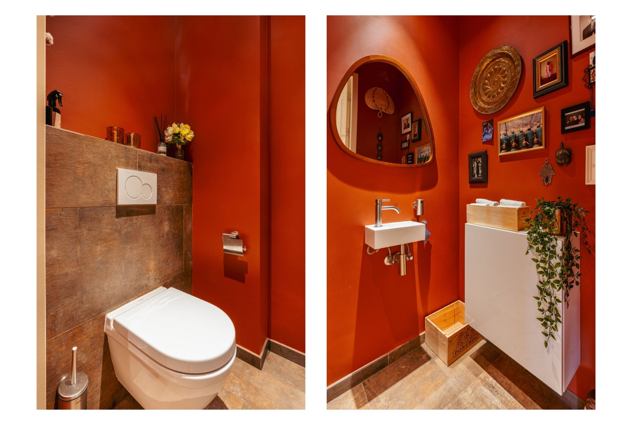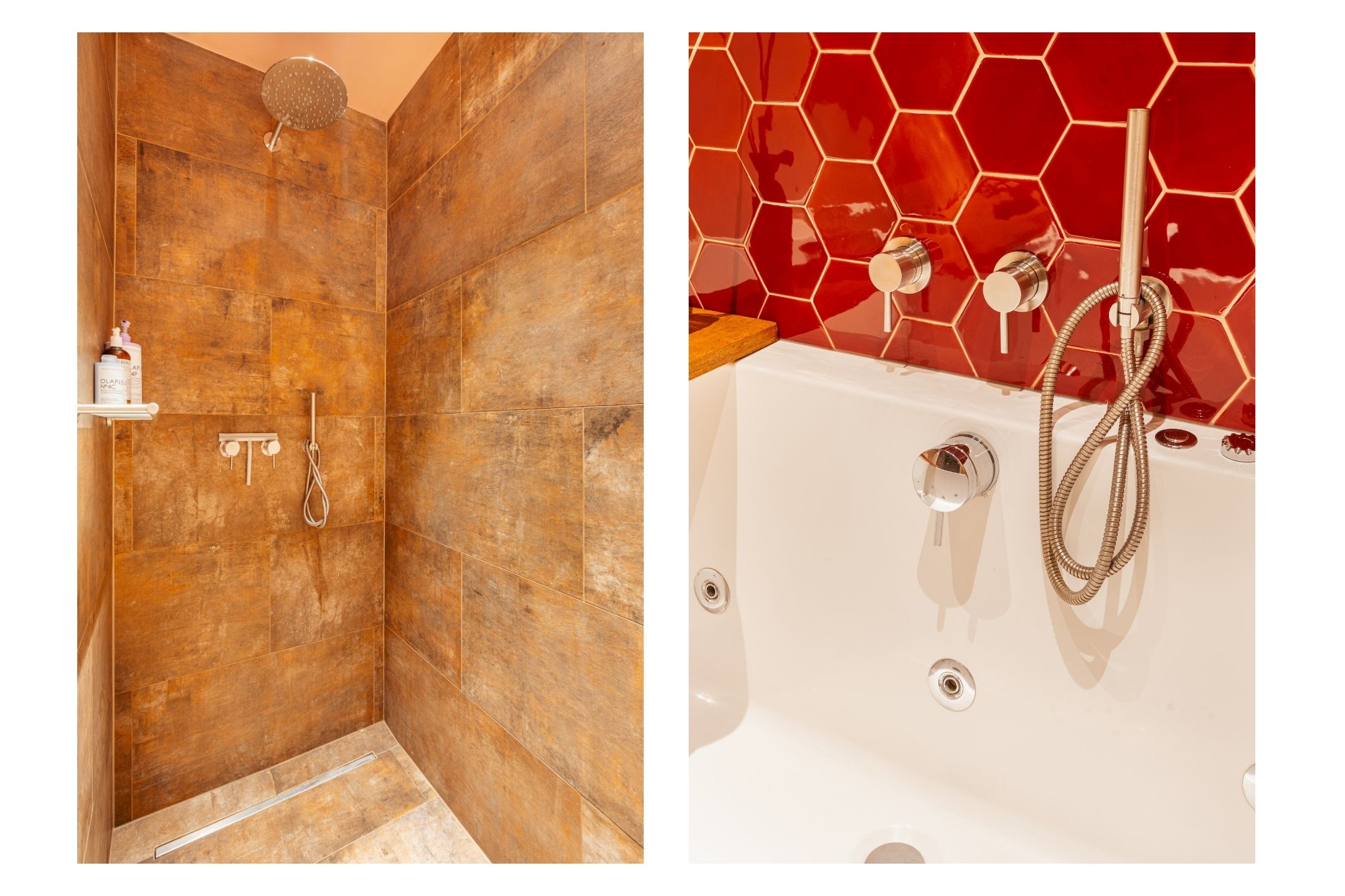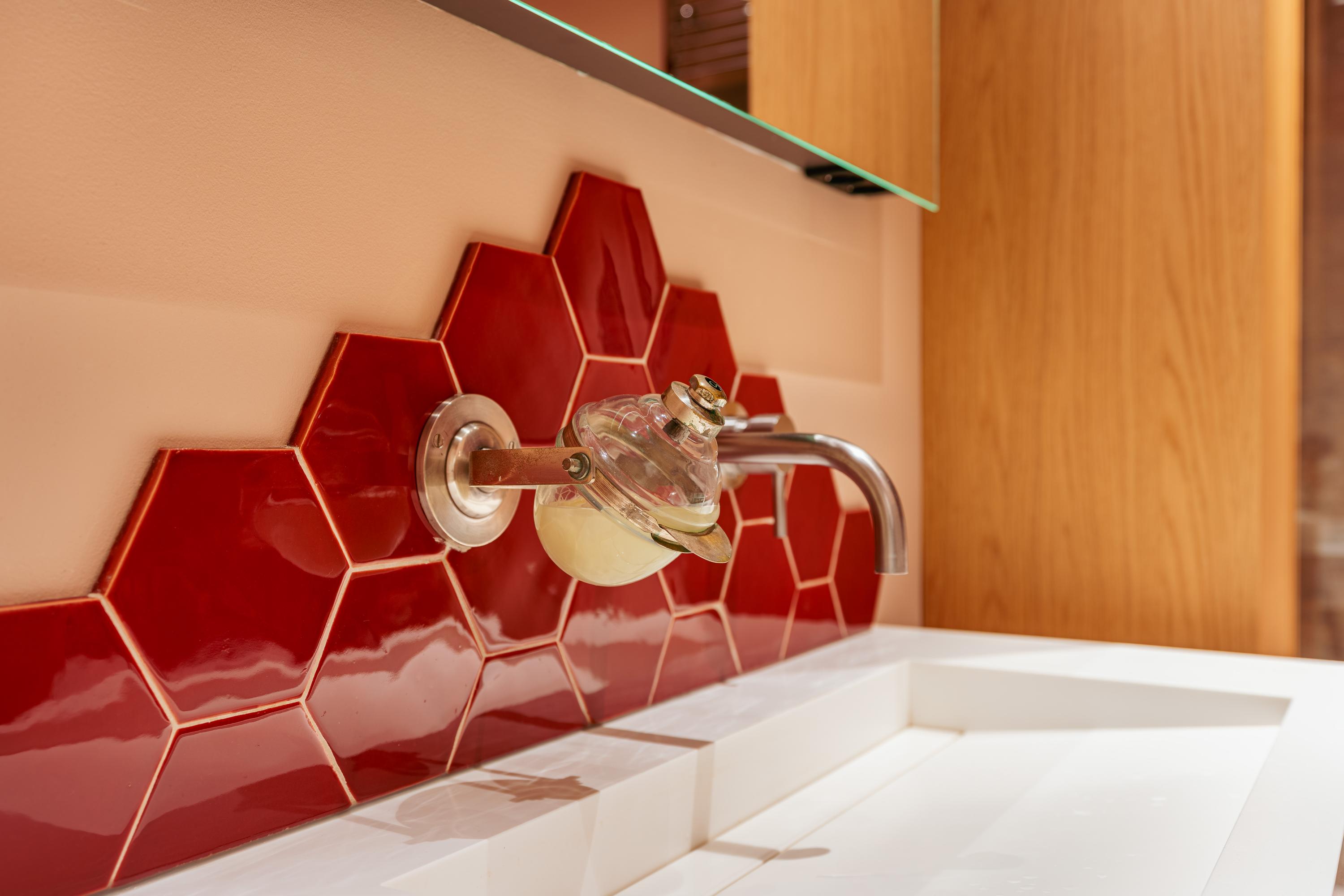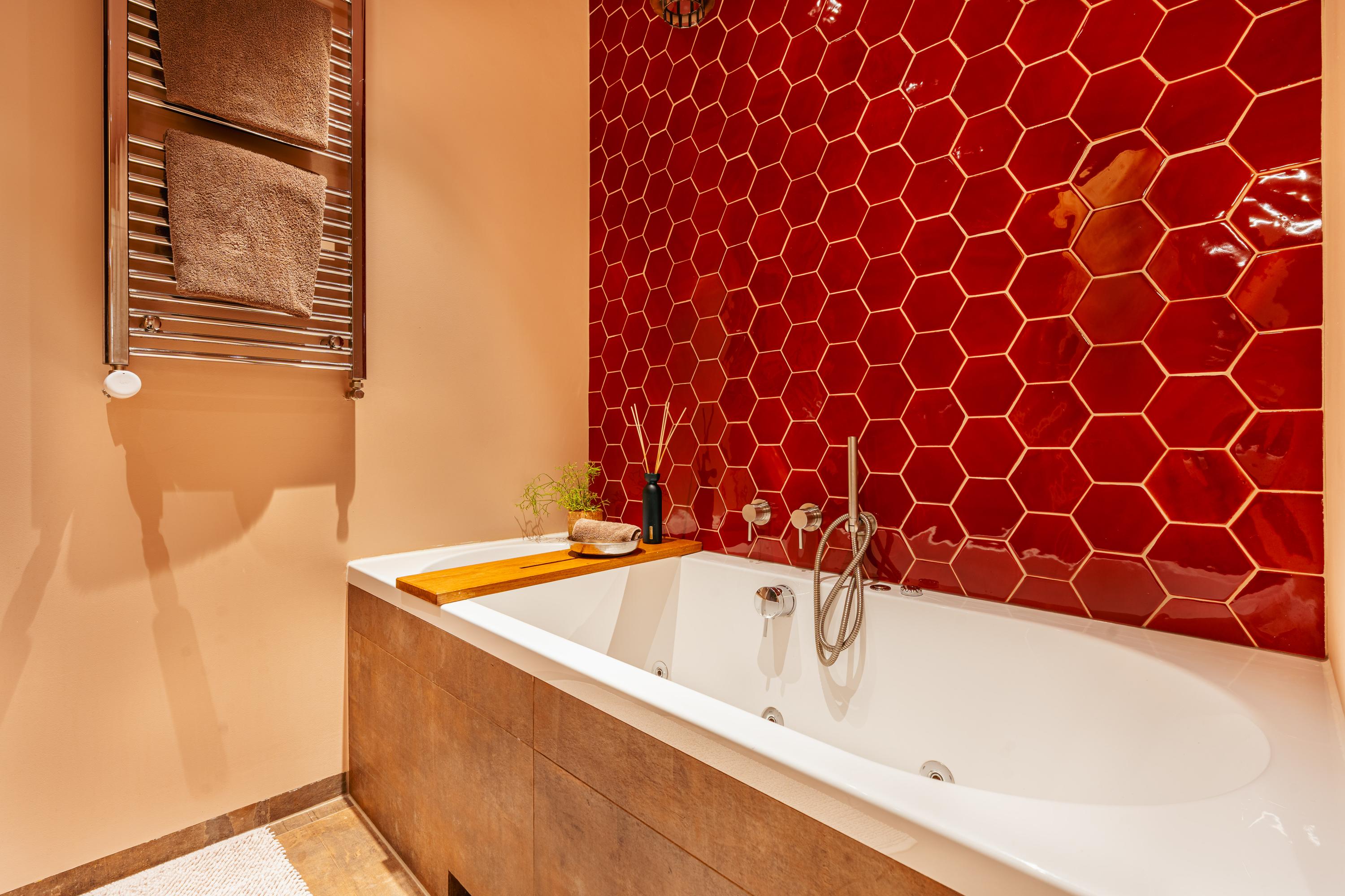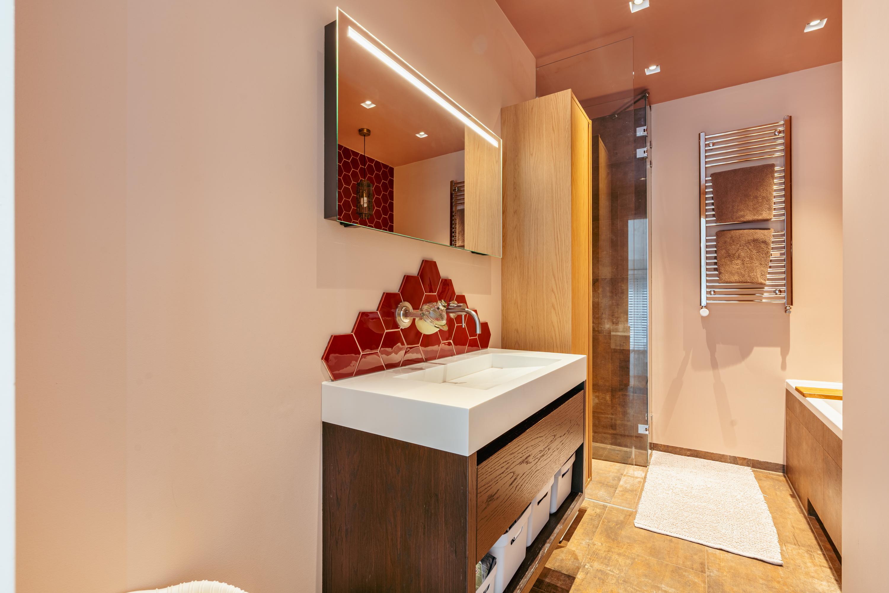 De badkamer is stijlvol vormgegeven in warme bruintinten en voorzien van een opvallend accent van rode hexagontegels. Hier beschikt u over een ligbad met whirlpoolfunctie, een aparte inloopdouche met regendouche, een wastafelmeubel met ruime opbergladen, een praktische wandkast, een designradiator én comfortabele vloerverwarming. Een heerlijke plek om te ontspannen.