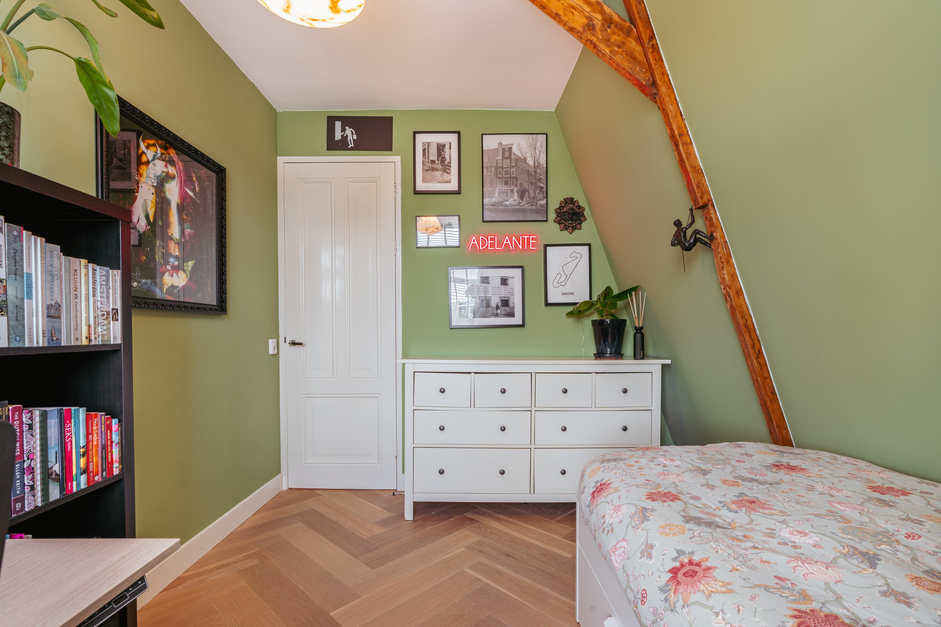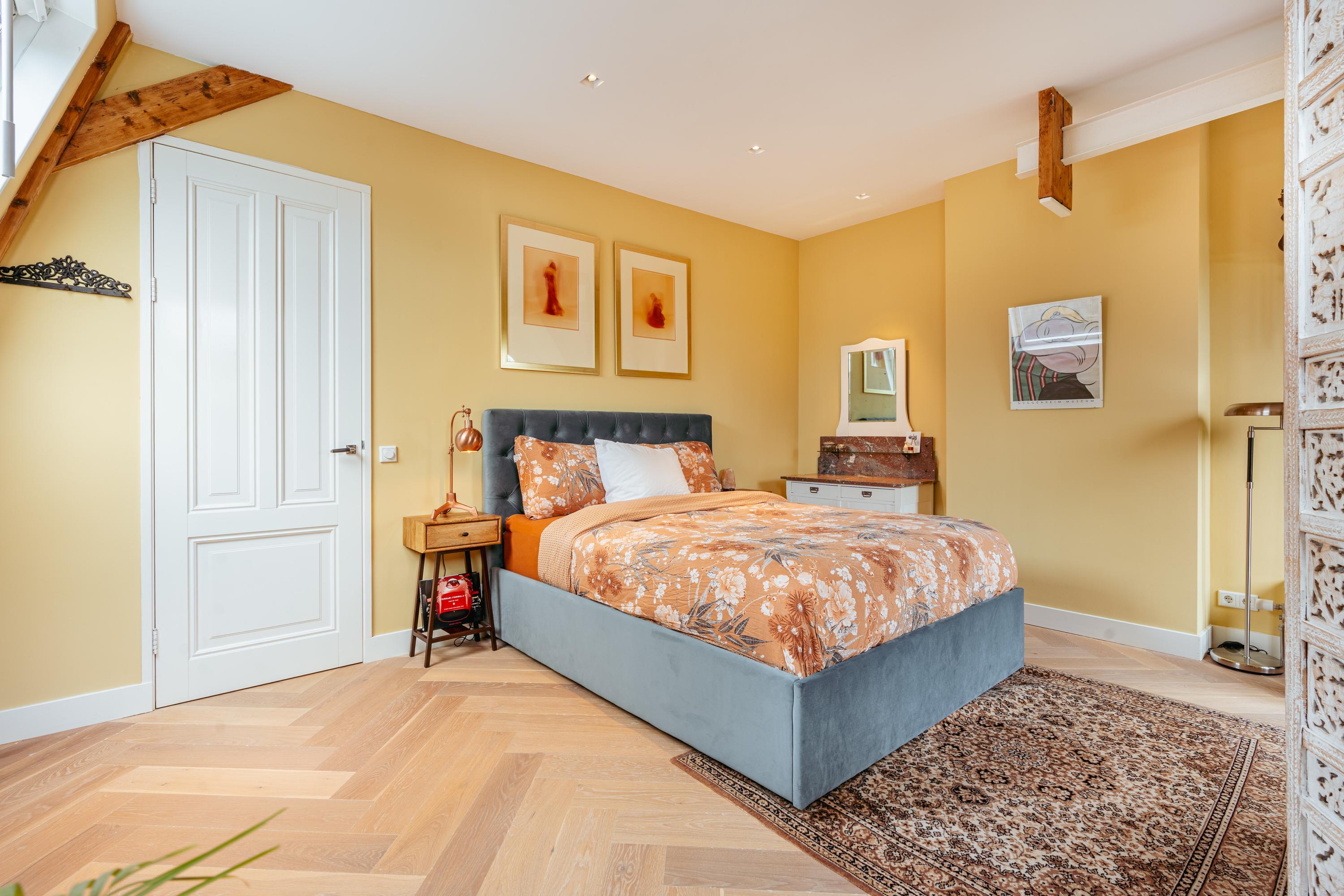 Aan de voorzijde bevindt zich de royale master bedroom, uitgevoerd in warme tinten en voorzien van karakteristieke houten balken. Dankzij het charmante boograam en de dakkapellen valt er veel licht naar binnen en is er een prachtig uitzicht op Artis. De kamer biedt ruimte voor een groot tweepersoonsbed, een garderobekast en een zit- of werkhoek.