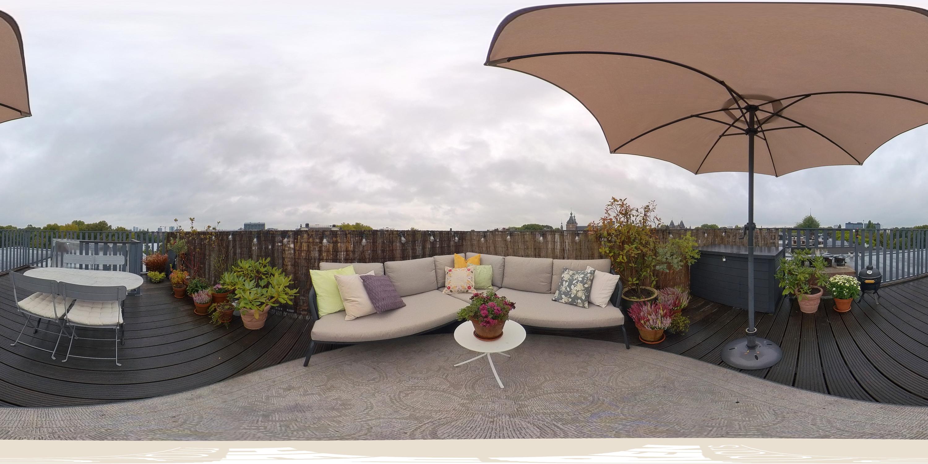 De vaste trap leidt naar het unieke dakterras van ca. 26 m², een ware oase midden in de stad. Dit zonnige terras biedt voldoende ruimte voor zowel een eettafel als een loungehoek en is omgeven door groen. Hier kunt u genieten van privacy, rust en breed uitzicht over Amsterdam.